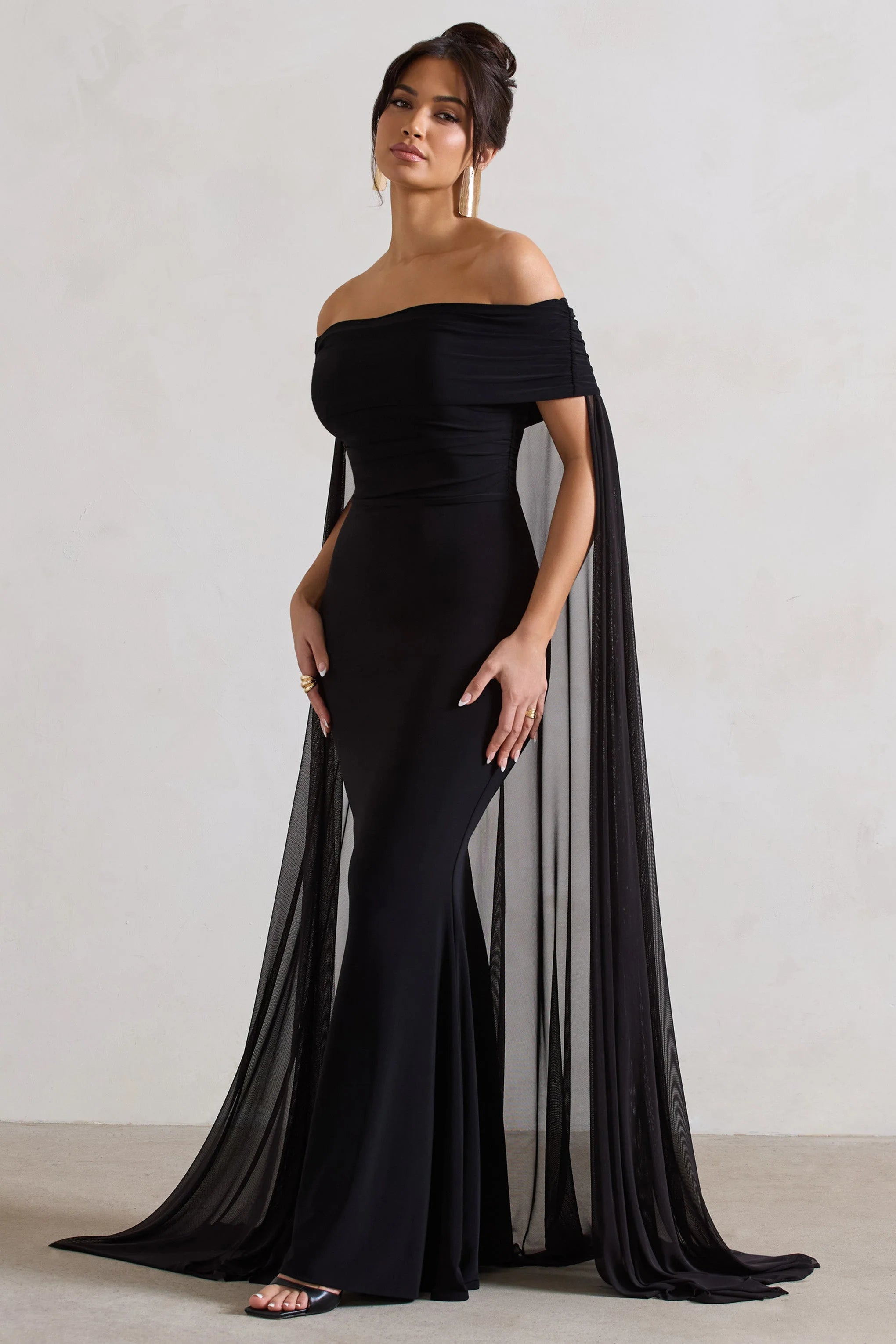 Exude an ethereal state of mind in Carlotta, our captivating cape maxi dress. Defined by a flowing chiffon cape, this black maxi also boasts a timeless bardot neckline and floor length skirt. For the perfect wedding guest ensemble, style yours with a tousled bun and statement earrings.