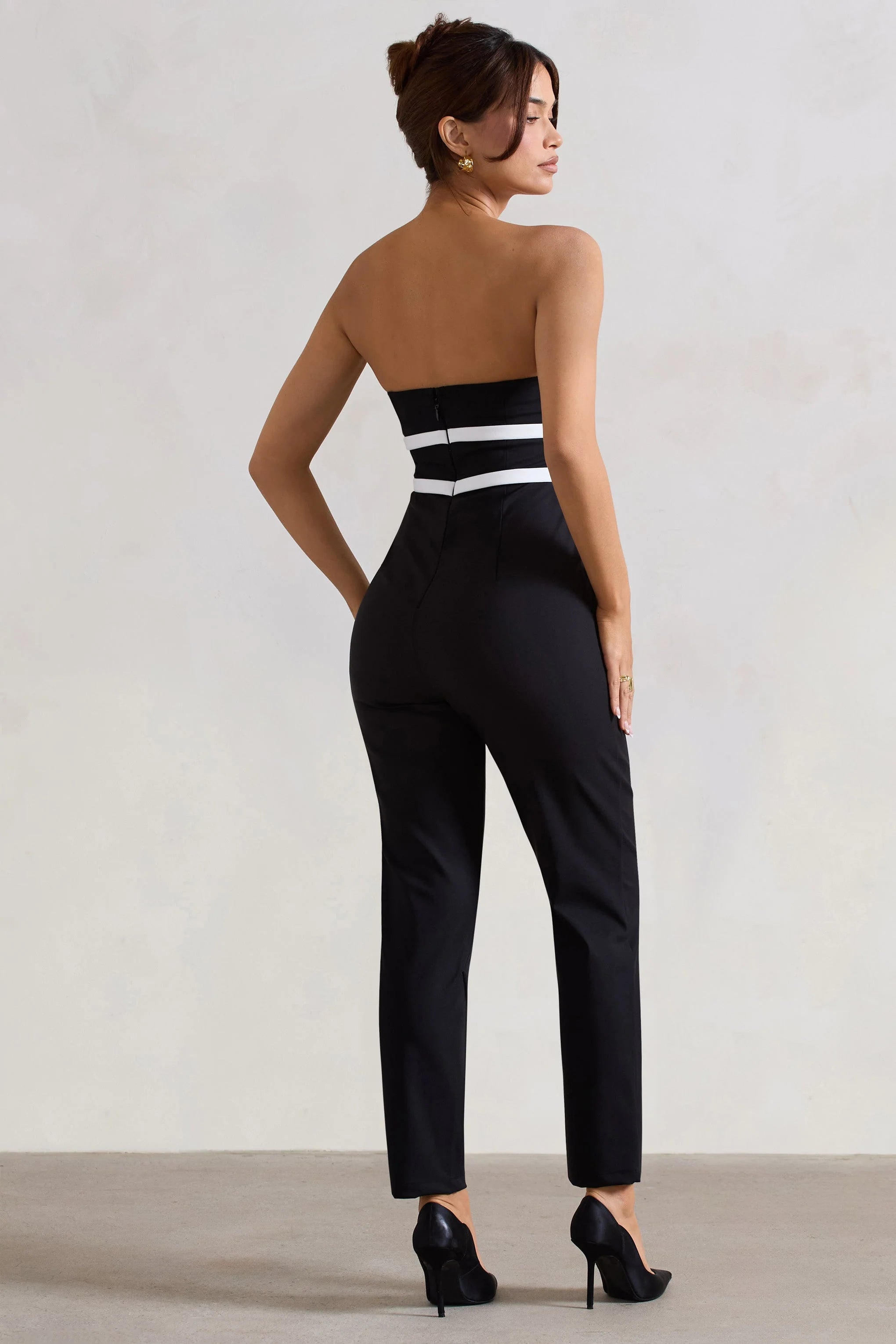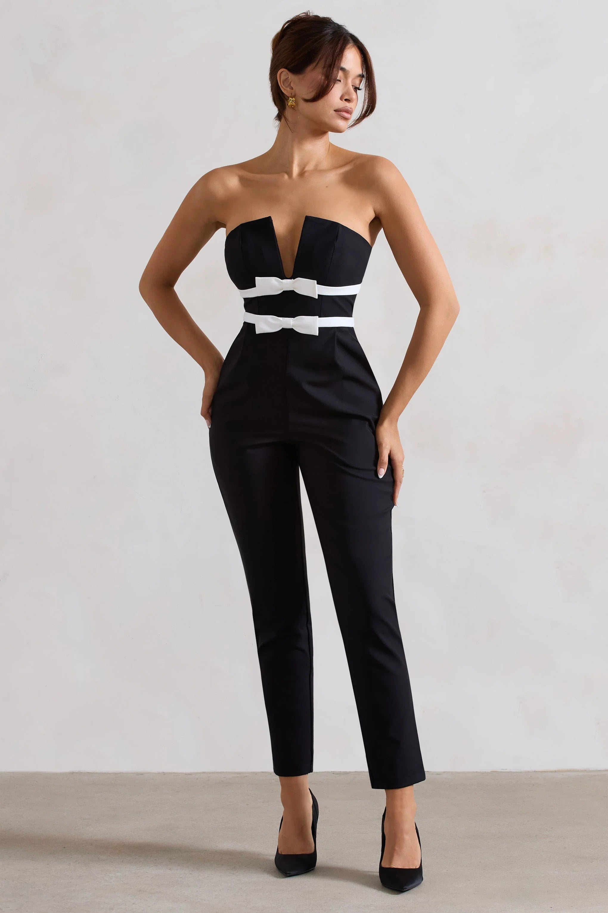 Whether you're out with the girls or attending a wedding, Casta is the versatile staple everybody needs. Carefully crafted in a premium crepe, this black tailored jumpsuit features a sculpting wired neckline and delicate white contrasting bows.
