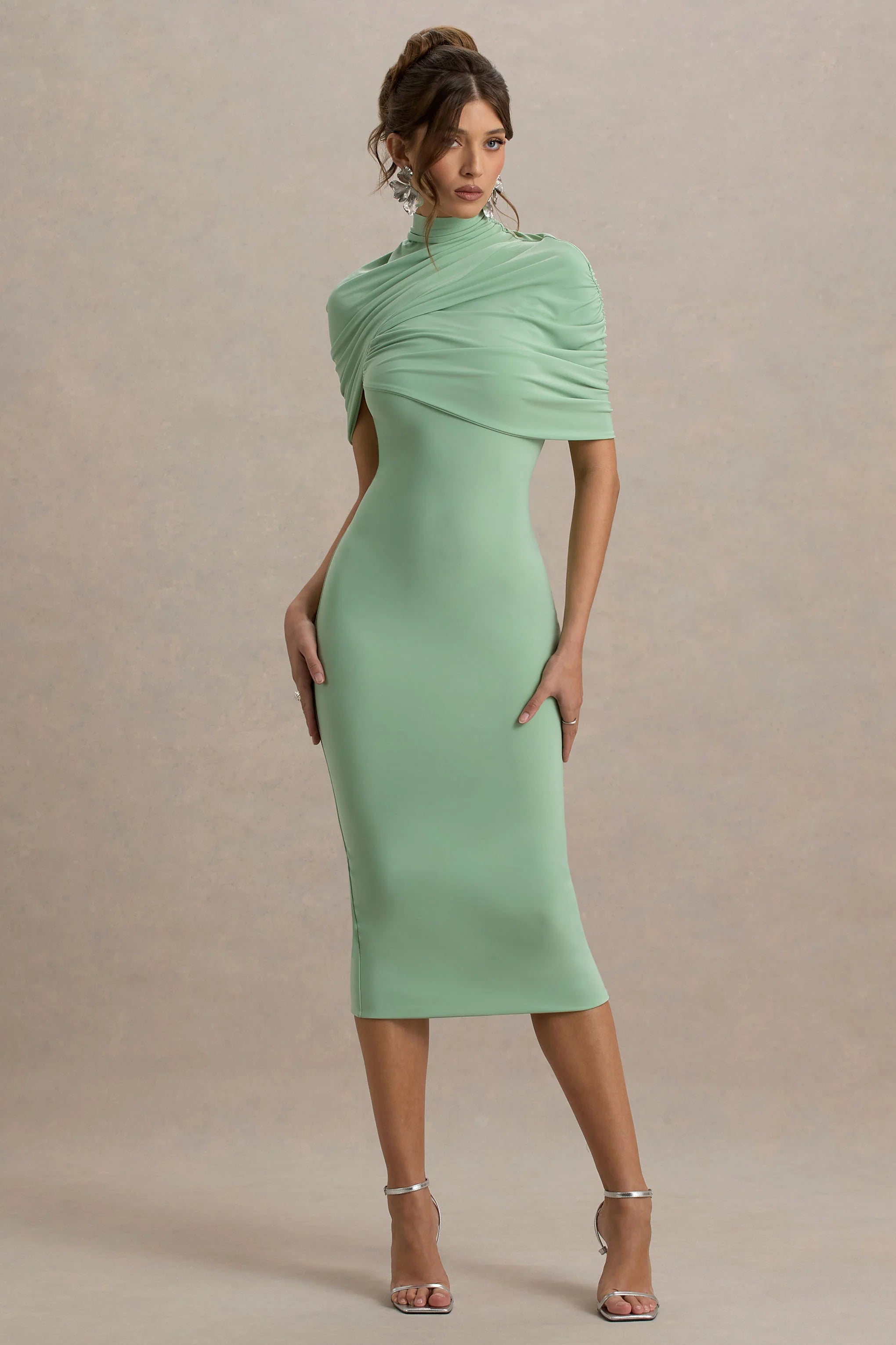 Need a midi wardrobe refresh? We've got you covered...literally. Meet Cecille, the chic cape detailed dress designed for all your modest social occasions this season. Crafted from a light green shade of our premium stretch jersey, this style sculpts you in every right place, in the most effortlessly elegant way possible.