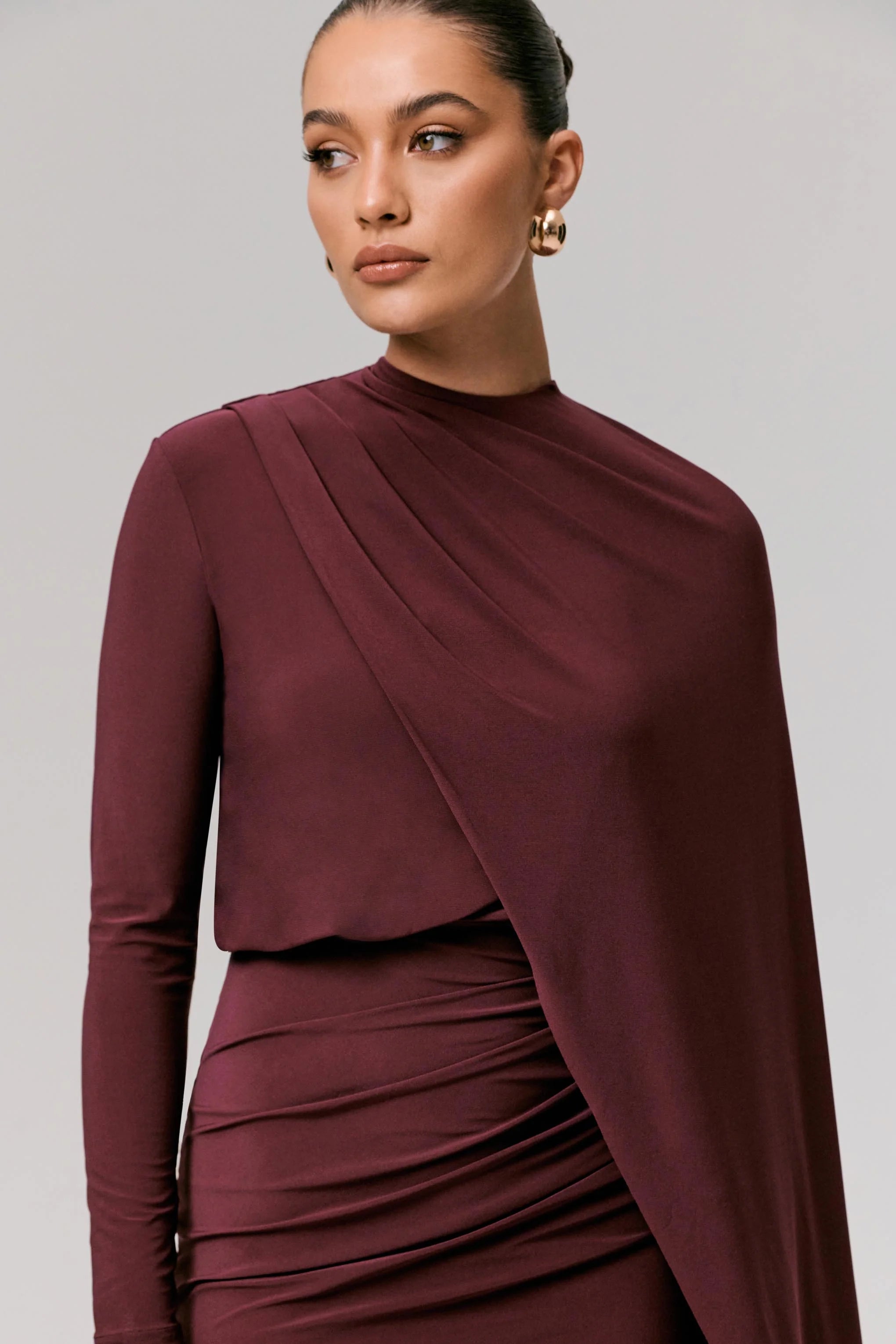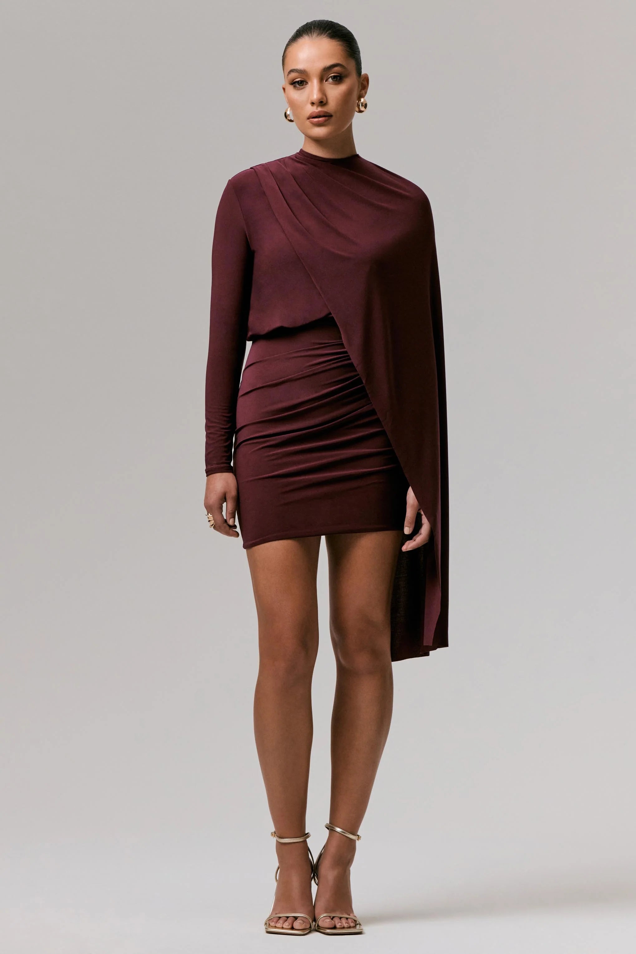 Command attention at your next formal affair in our mini Celeste. Arriving in our premium burgundy jersey, this piece showcases a striking cape sleeve for an effortlessly flattering silhouette. Pair yours with signature earrings for a look which blends sophistication and allure.