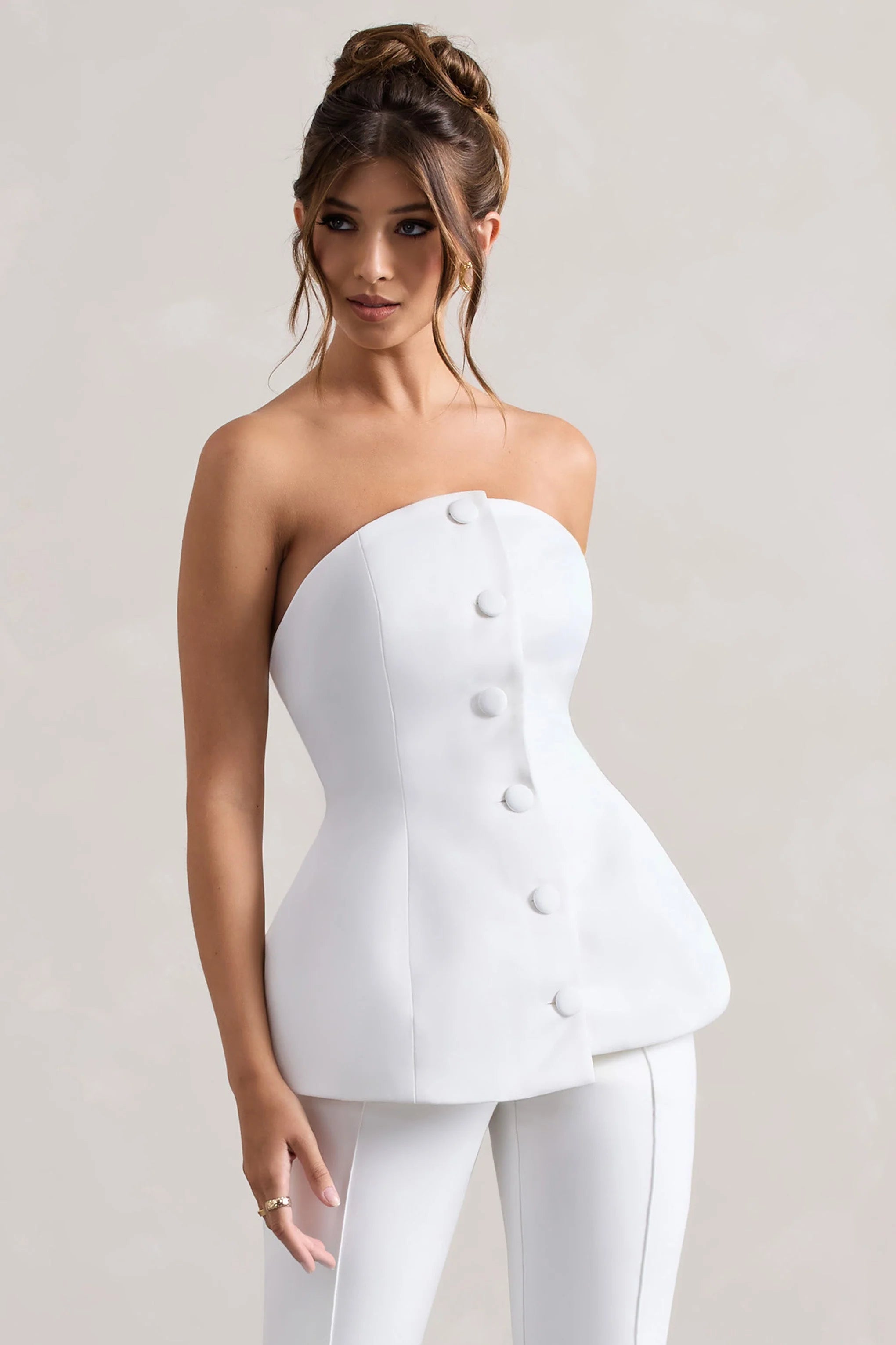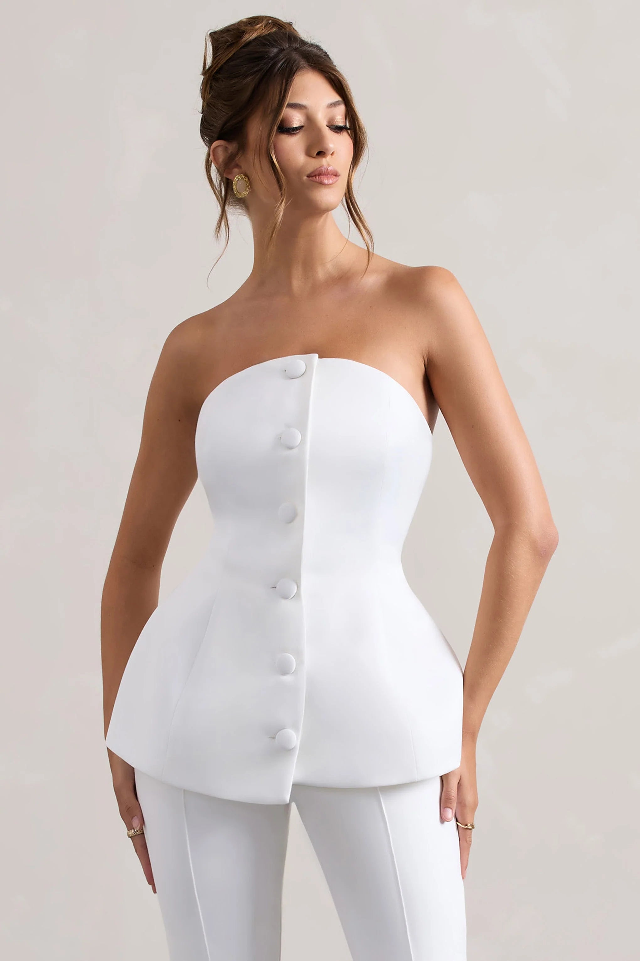 Whatever you decide to pair it with, Century is a stand-out staple. Arriving in a soft cream shade of our signature satin, this structured piece cinches your waist through self covered buttons that flow down its front.