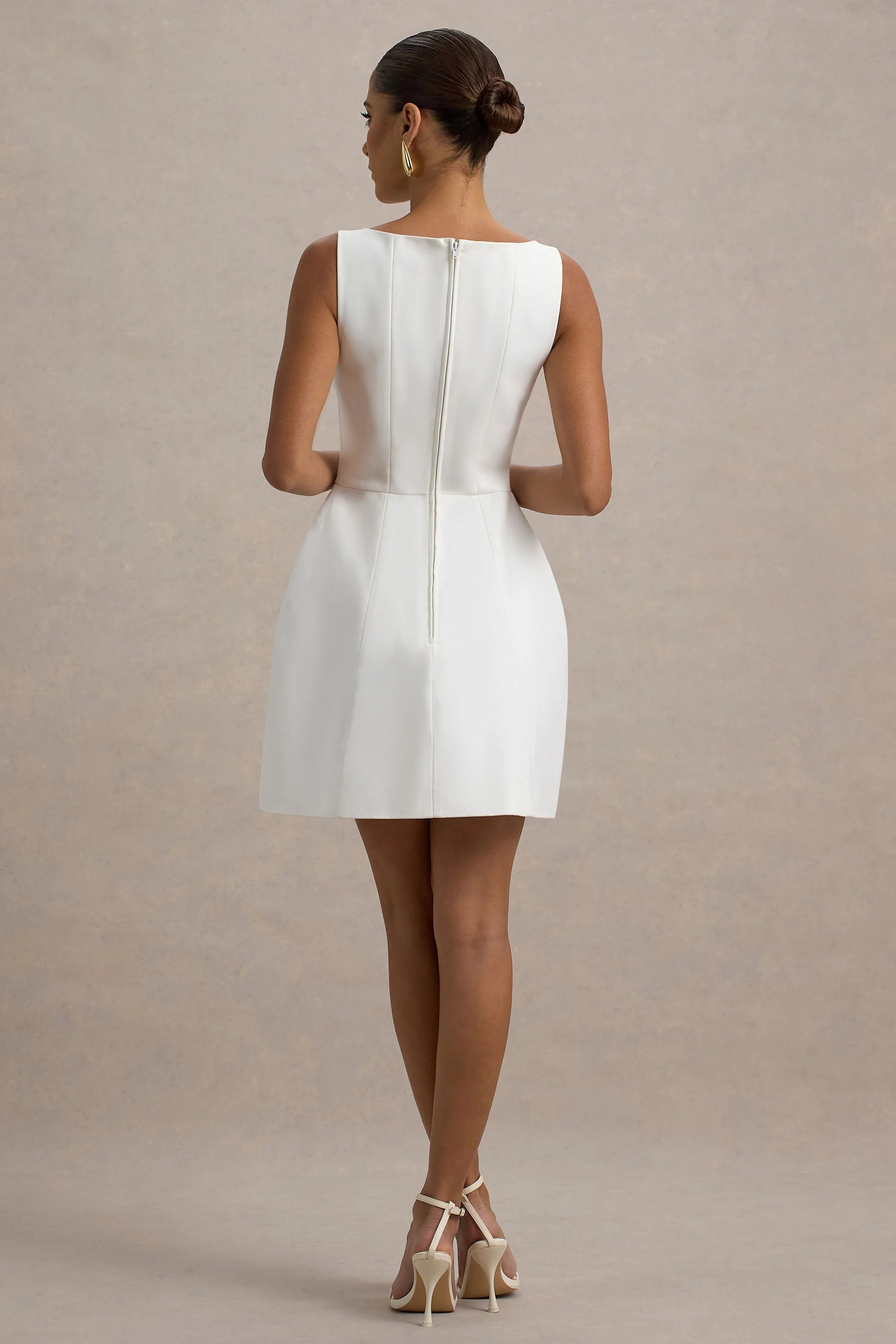 Meet Cheri, our latest chic mini dress. Crafted in our premium stretch crepe in a classic white shade, this piece features elegant button details and a boat neckline for a flattering tailored fit. Perfect for any occasion from brunch with the girls to a date night dinner.