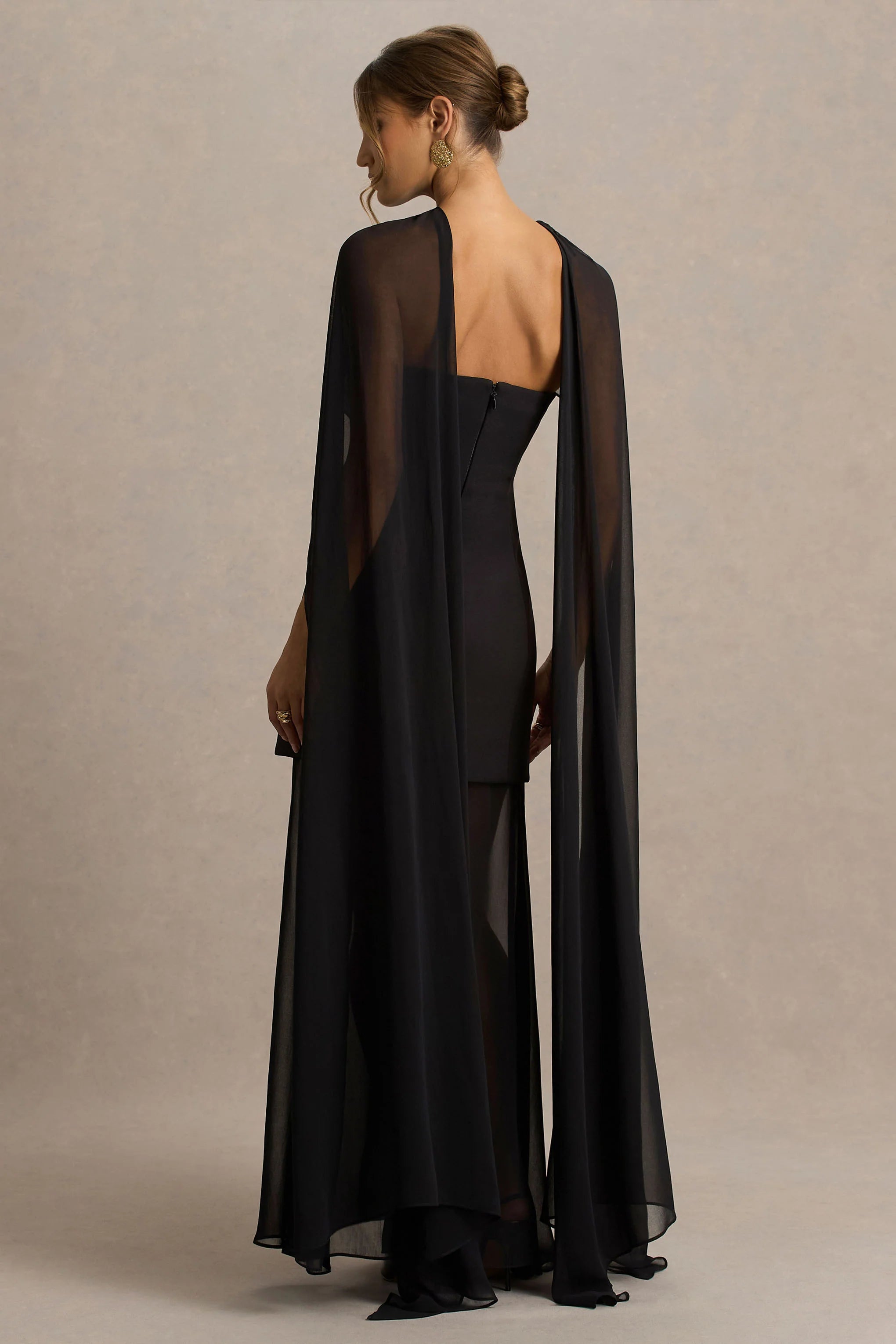 Say hello to Chessa, the maxi dress that commands attention. Crafted from our premium black crepe, its floor sweeping maxi length flatters the figure with effortless elegance. The slashed neckline adds a touch of sophistication, while a sheer cape and sheer skirt bring drama and movement to every step. Finished with a front high-split, Chessa is your go-to for a sultry take on occasion wear.