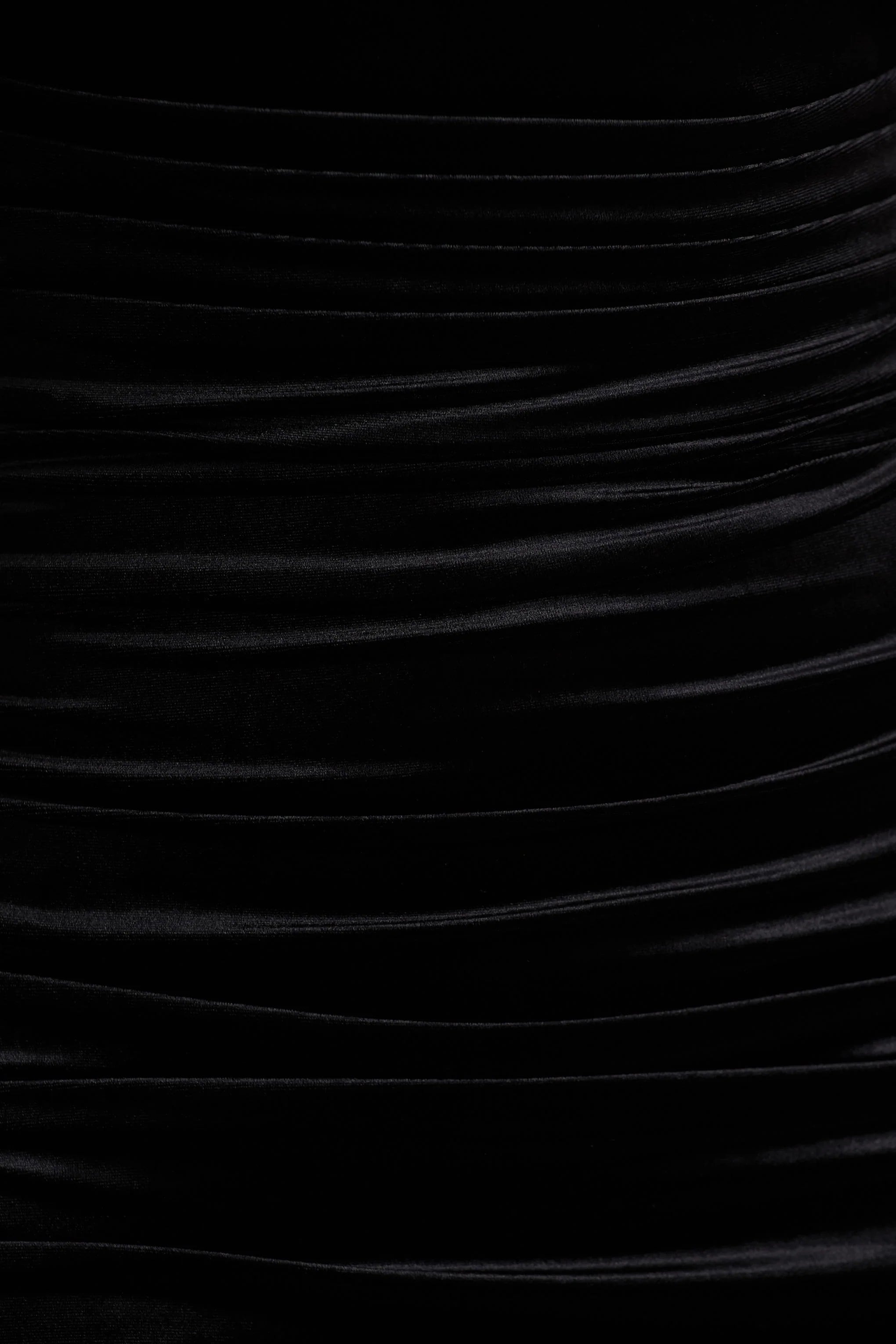 Meet Chrissy, the show-stopping silhouette your evening wardrobe has been waiting for. Crafted in a rich black hue of our premium velvet, this stunning design falls to a sleek midi length that hugs every curve. The striking square neckline paired with short mesh sleeves adds a modern elegance, while the all-over ruched detailing sculpts and flatters from every angle. Finished with a sultry centre-back split, Chrissy is your go-to for glam nights and unforgettable entrances.