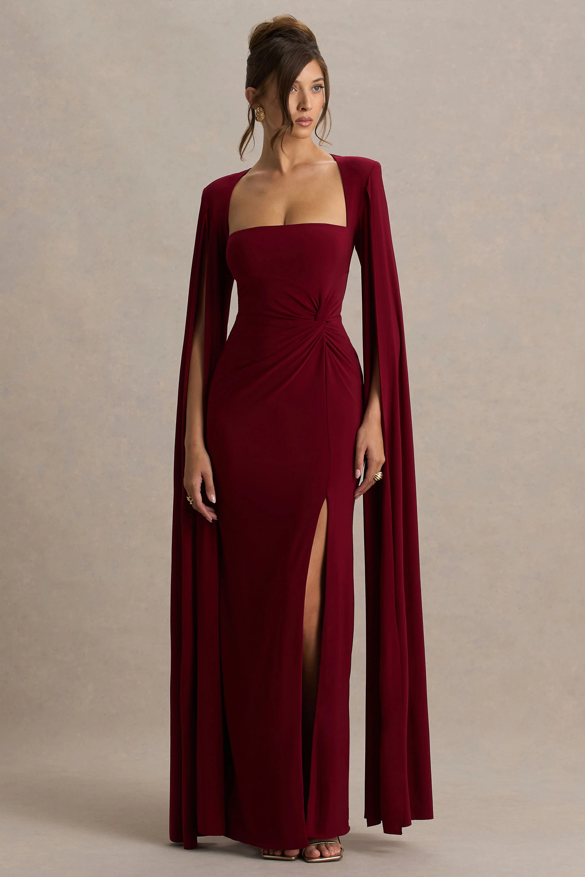 Channel sophisticated elegance in Claretta, our berry maxi dress. Crafted in a premium stretch jersey, this sweeping scene-stealer boasts a sculpting square neckline, twisted waist detail and long, cape sleeves. Made for special occasions, elevate yours further by styling it with some stilettos like Bowing.