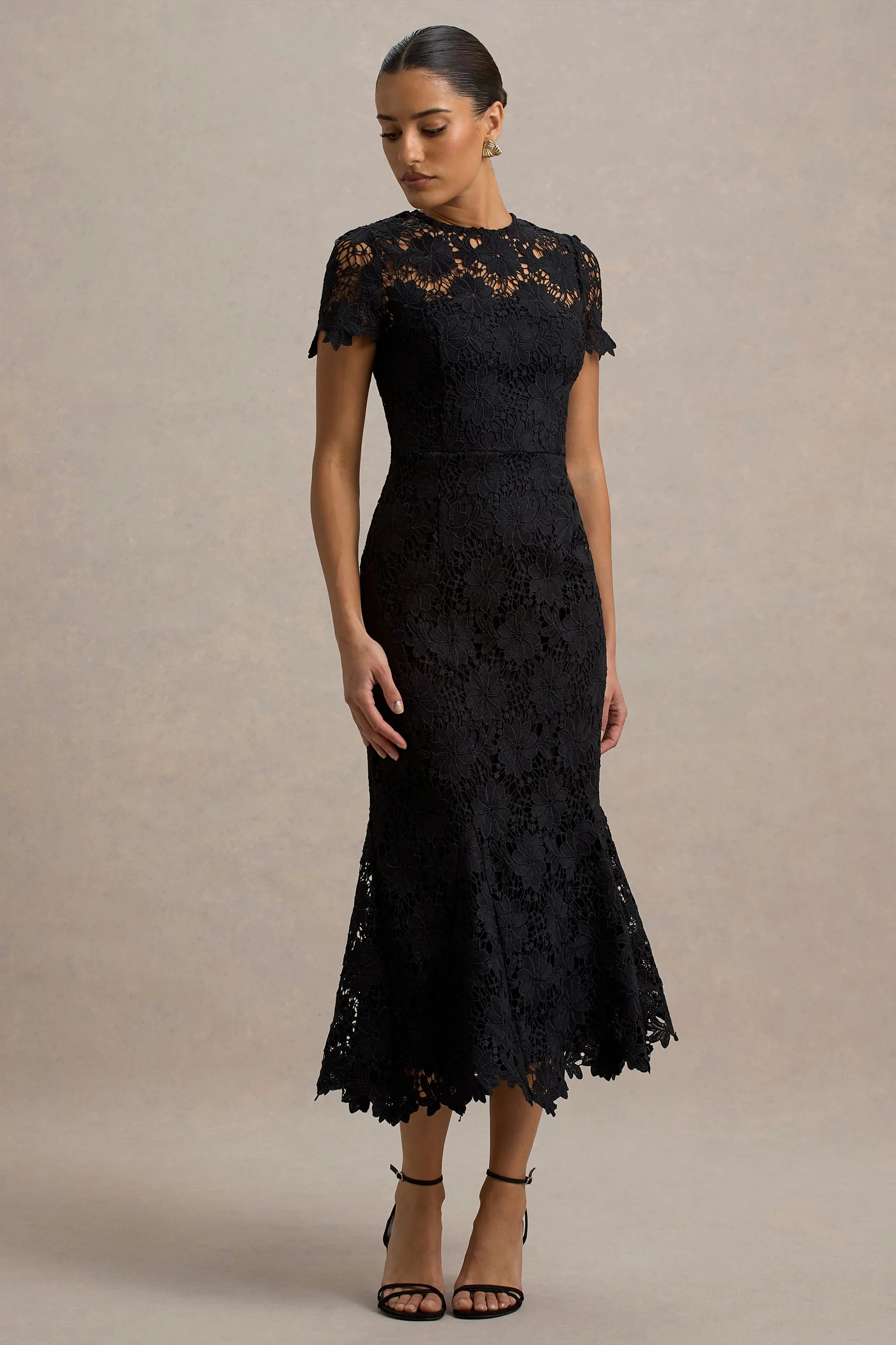 A vision of elegance, Clarissa is the definition of timeless sophistication. Designed in our premium black lace, this stunning midi dress strikes the perfect balance between romance and allure. The crew neckline and cap sleeves create a refined, feminine finish, while the sculpting silhouette skims your curves beautifully. Whether you're attending a black tie event or an intimate evening affair, Clarissa ensures you make an unforgettable entrance. Style with sleek heels for an effortlessly polished ensemble.