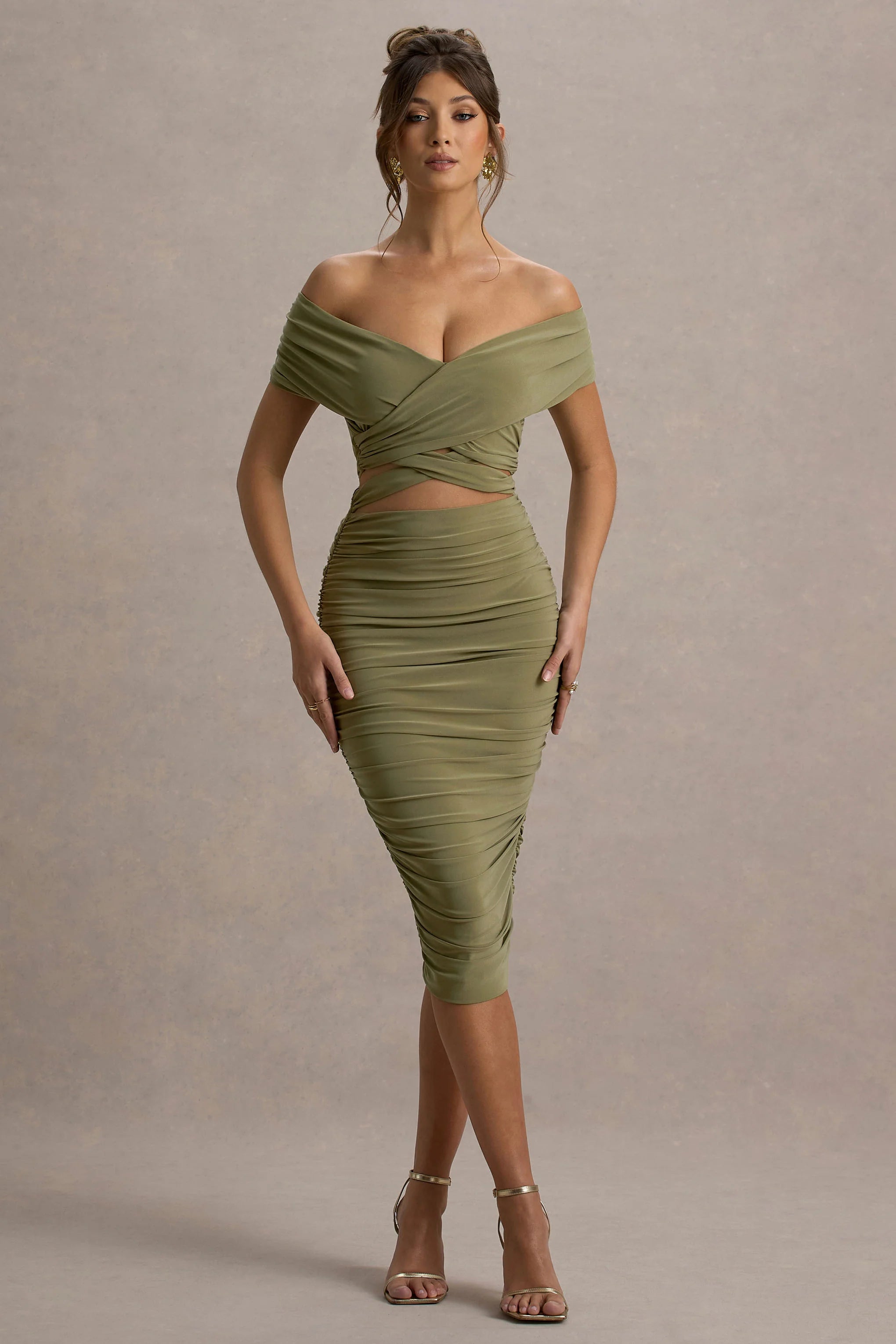 In need of a style that suits the entire season? Then meet Clovette, our cool girl midi made for the nights in the city. With contemporary cut-outs and cross over detailing, each part of this dress is designed to spin heads. Crafted from a premium olive stretch jersey, you'll fit into every occasion with ease.