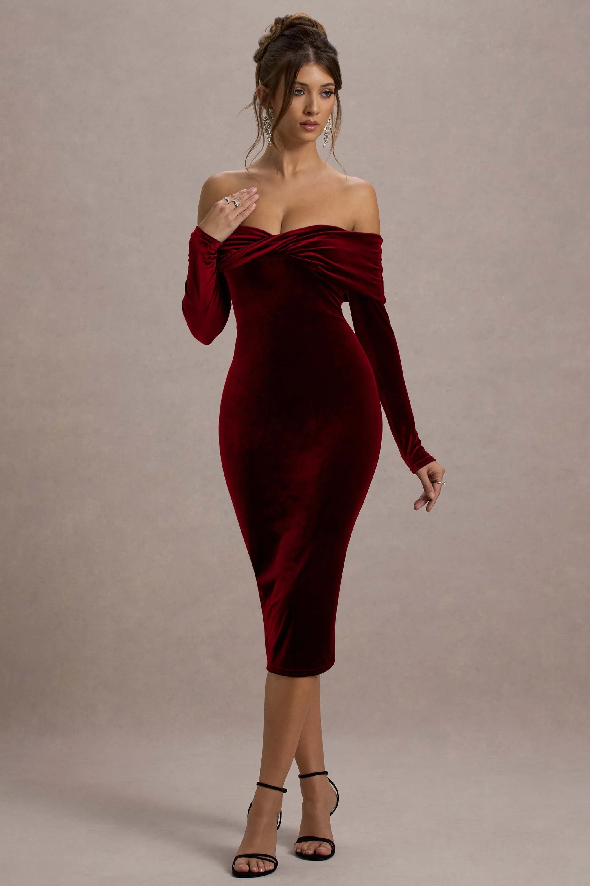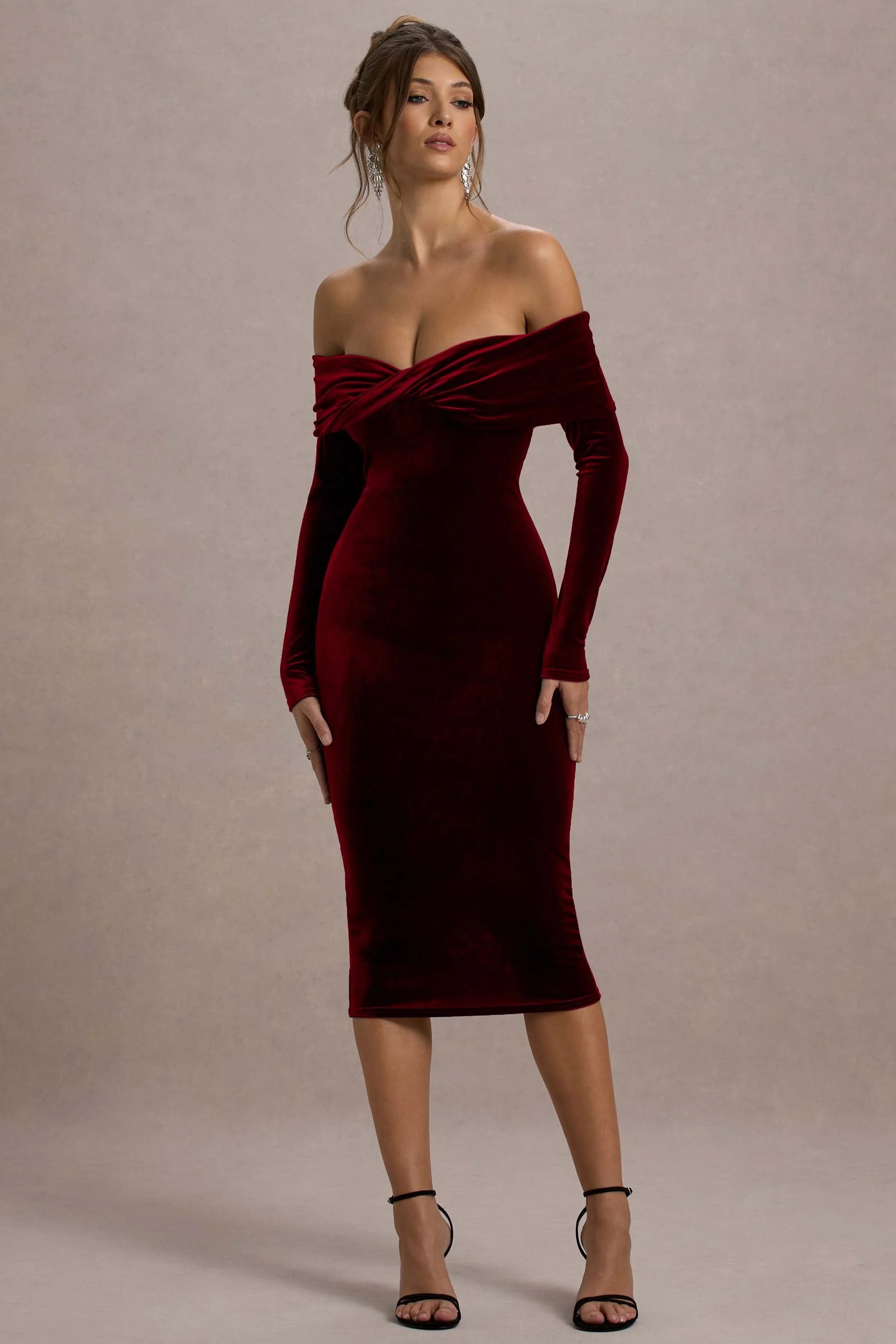 Get ready to receive many compliments during your next event in our aptly named berry midi. Arriving in a luxurious velvet fabric, Compliment features a twisted bardot neckline, long sleeves and flattering ruching to highlight your best features. Paired with a tousled bun and statement earrings, this timeless bodycon would make the perfect pick for your next romantic dinner date.