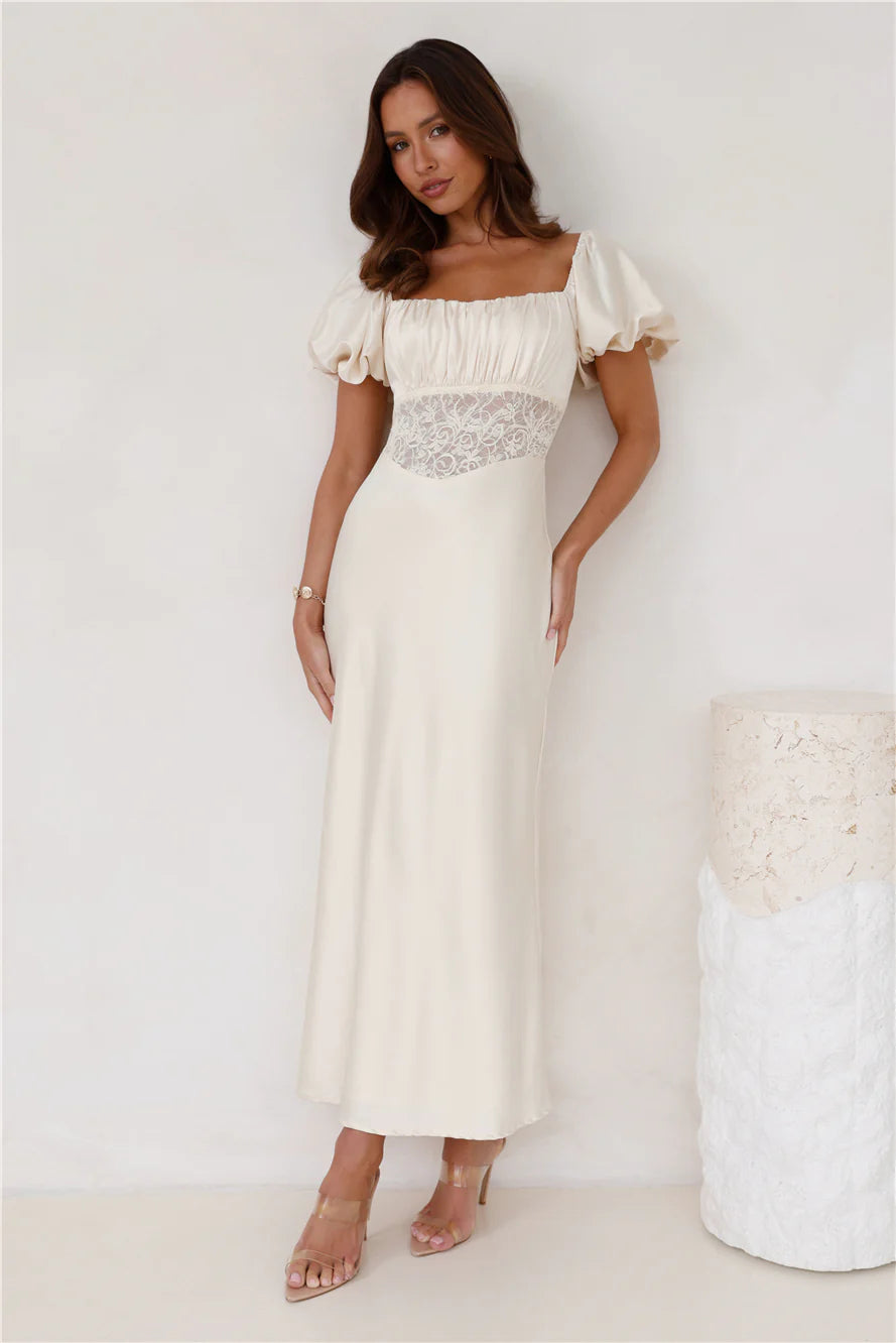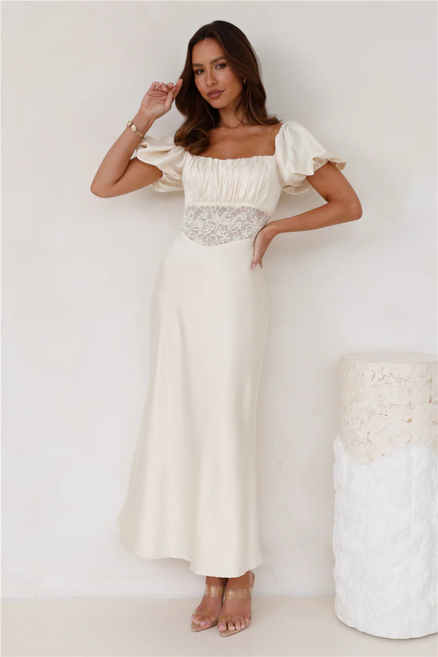Channel your inner fashionista with the Connected By Love Satin Maxi Dress. Featuring puff sleeves with elastic and a gorgeous flowy skirt. Style with heels for a 'fit we love.