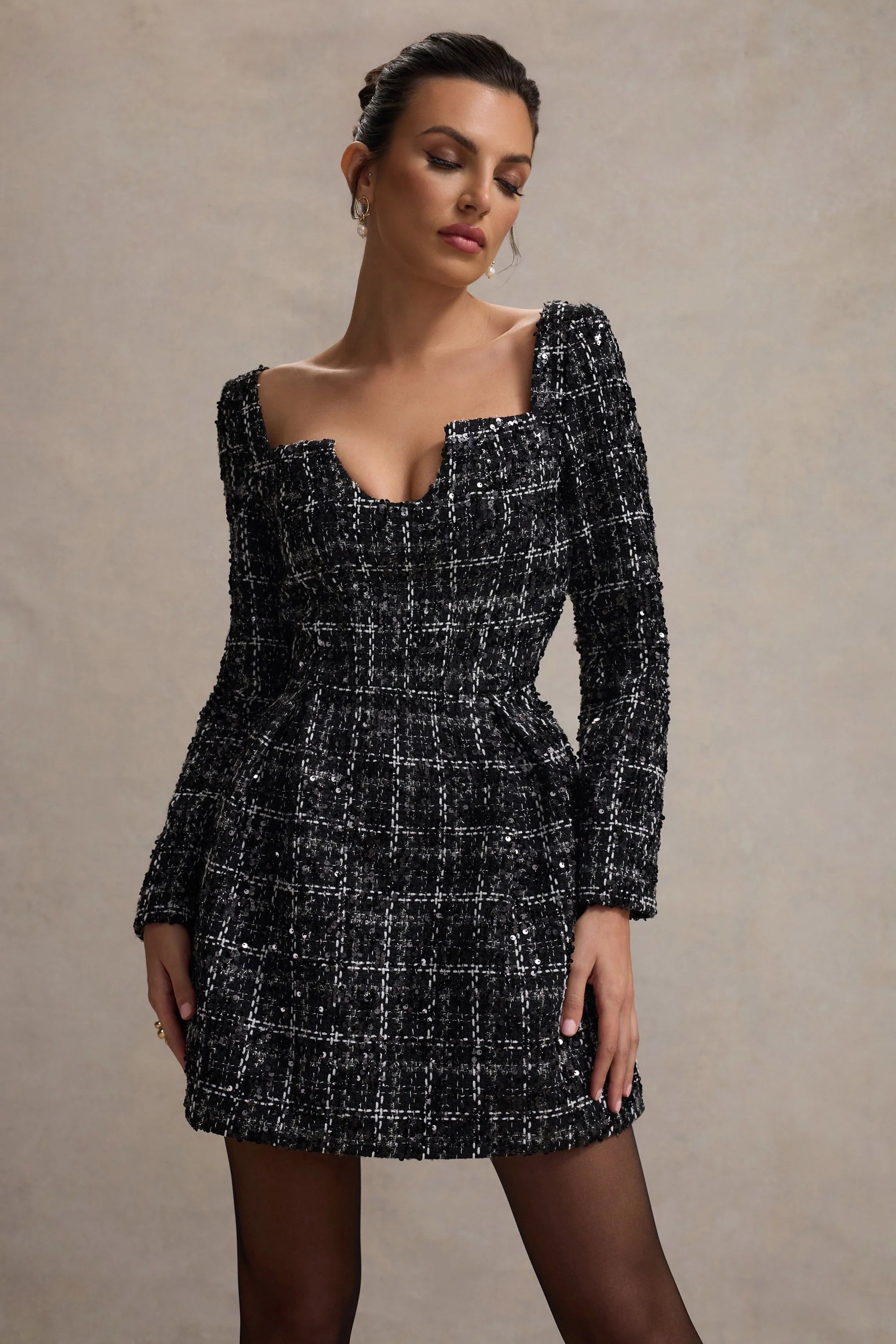 Captivate with class in Contessa, our tailored mini dress. Designed in a premium sequinned boucle, this LBD boasts long sleeves and a contemporary neckline. Perfect for taking you from day to night, elevate yours with some court shoes like Clearly for a timeless date night ensemble.