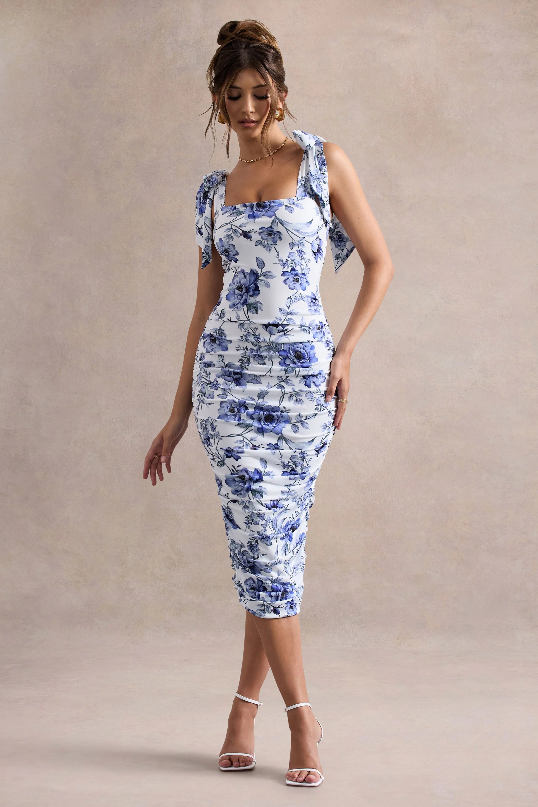Look captivating and contoured this occasion season in Cordelia. This flattering blue porcelain print midi dress has been expertly cut in a premium stretch jersey, with a ruched bodice for a sculpting fit. Detailed with feminine bow straps Cordelia is a must have midi for your next garden party.