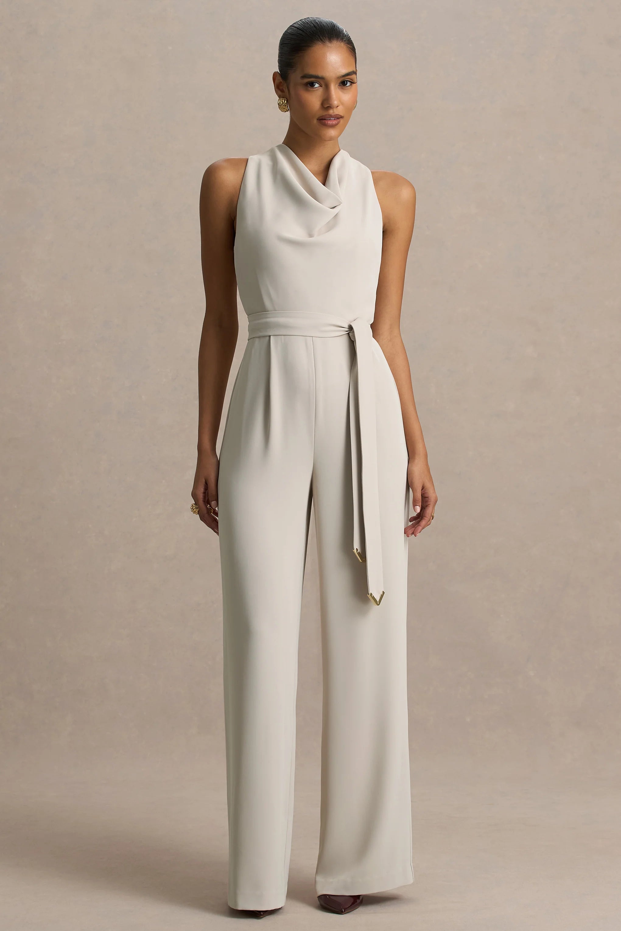 Meet Corina, the effortlessly chic jumpsuit made to elevate your wardrobe. Cut from our premium woven fabric in a soft nude hue, this elegant one-piece brings understated glamour to every occasion. The draped cowl neckline adds a touch of romance, while the self-tie belt cinches the waist for a flattering silhouette. Featuring a delicate keyhole back detail and flowing wide-leg trousers, Corina is the perfect blend of modern sophistication and timeless style.