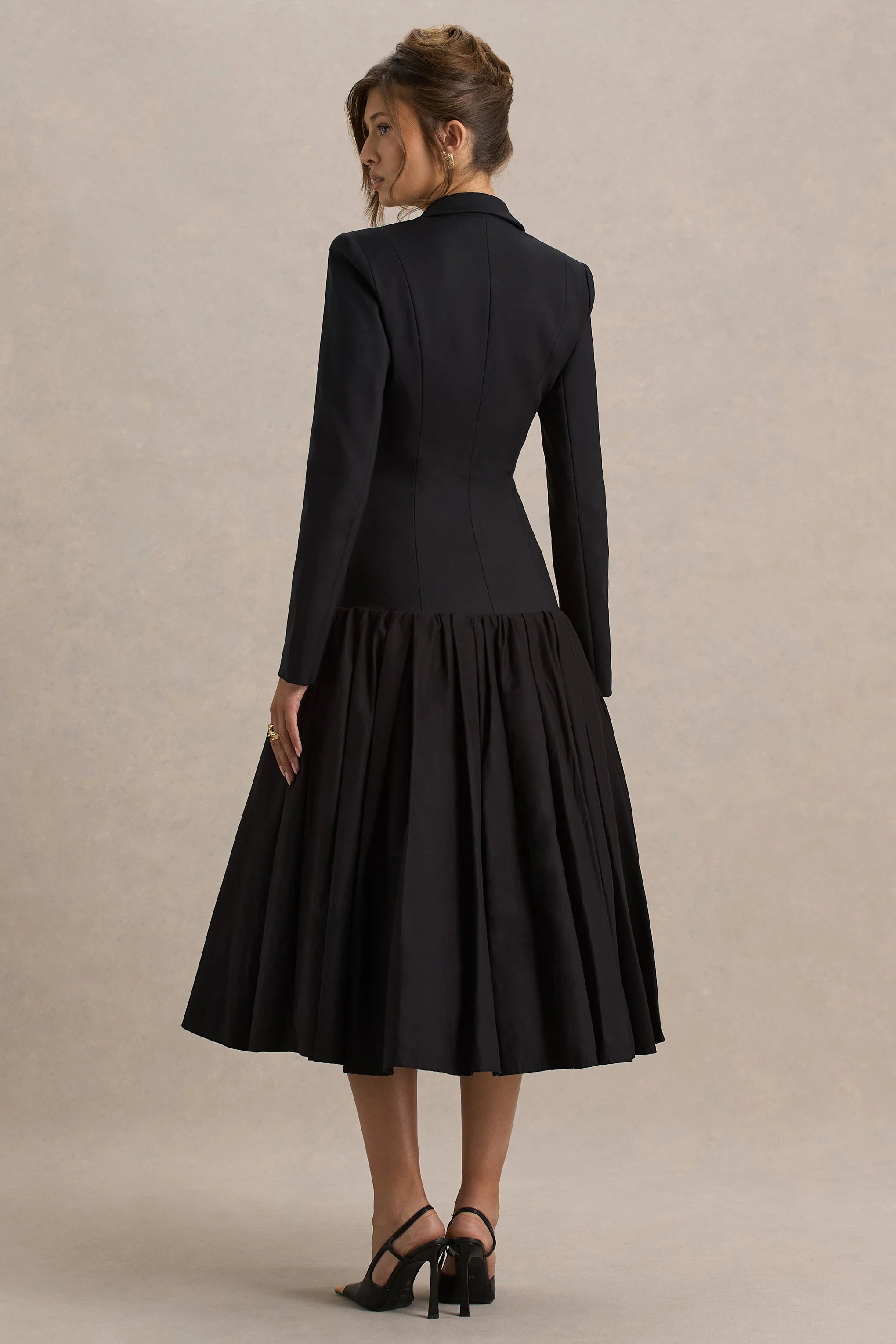 Make a striking entrance in Cosmopolitan. Tailored from our premium woven fabric, this statement black midi dress combines sharp structure with feminine elegance. The plunge neckline and standard collar exude confident sophistication, enhanced by bold shoulder pads and a mock pocket detailing for a tailored finish. Finished with a drop waist that leads into a dramatic peplum hem, this piece captivates from all angles. Perfect for commanding the room, from boardrooms to bars, Cosmopolitan is your elevated take on modern glamour.