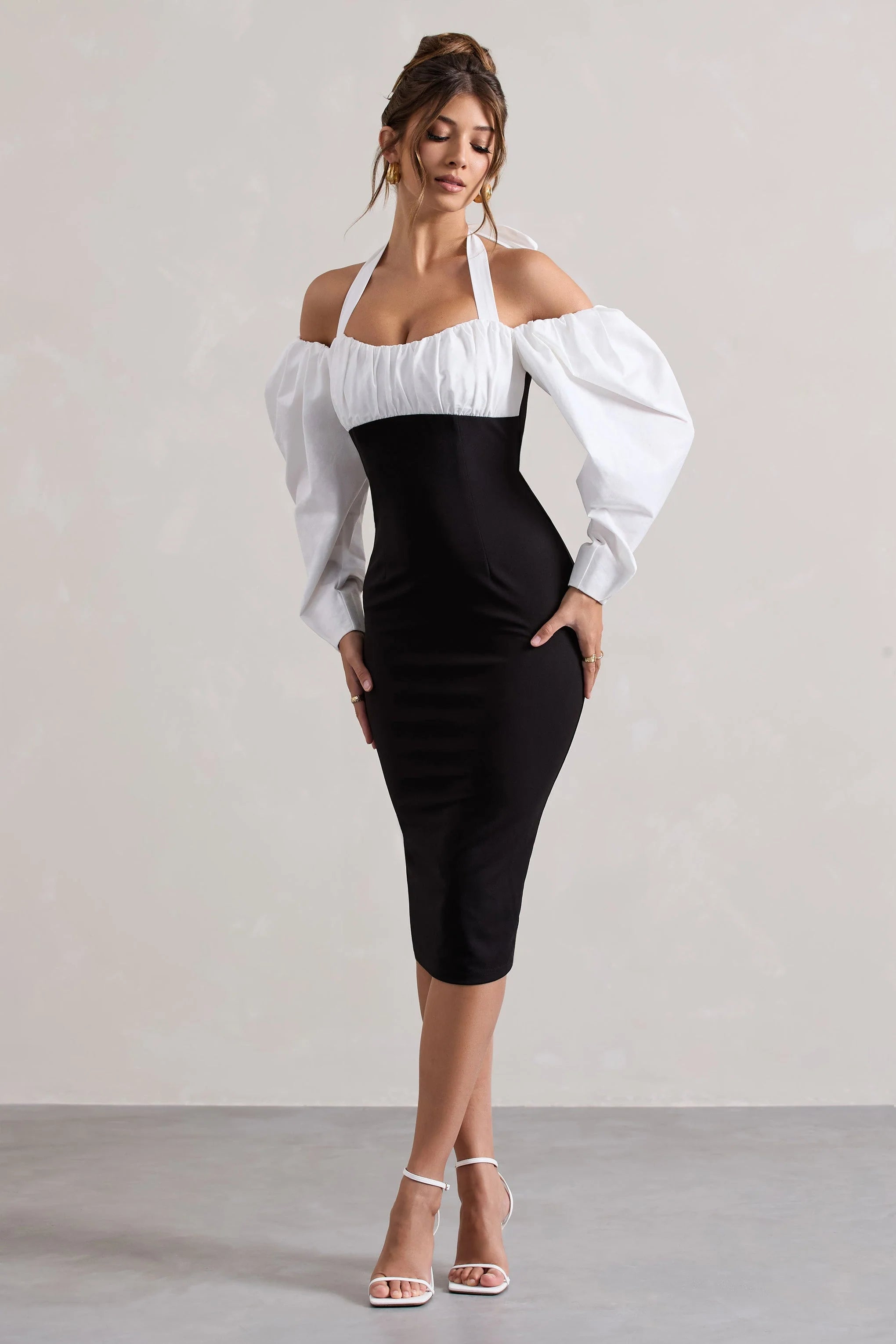Sophistication meets romance in our latest midi Couture Client. Designed in a sculpting knitted crepe, this black and white midi dress showcases a self-tie halter neckline, elegant puff-sleeves and a flattering fitted bodice. Style with a pair of court heels and a tousled bun for an elevated look.