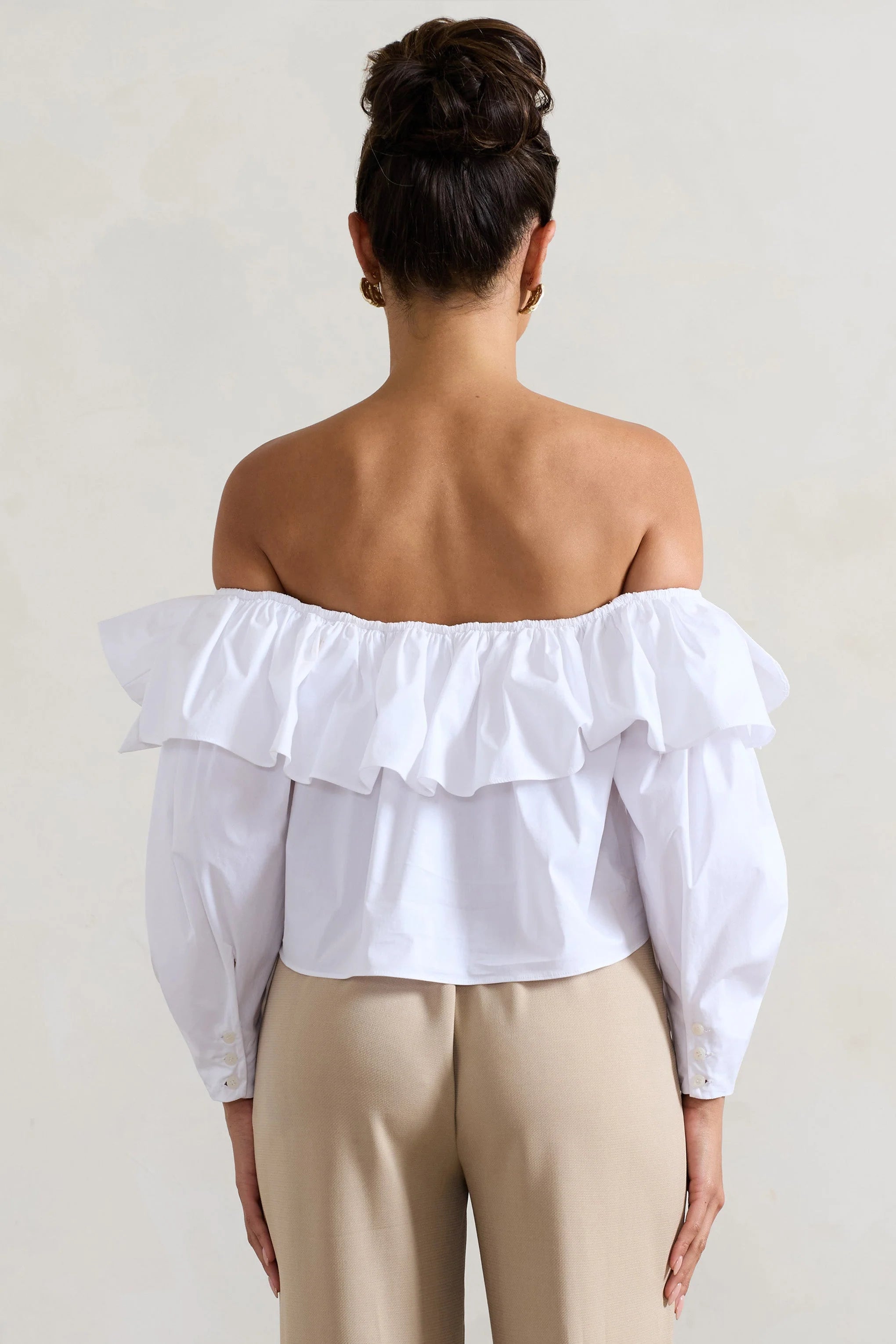 Designed in a crisp cotton poplin that holds a breezy, slightly loose shape, Cove is a summer essential. Boasting an elasticated bardot neckline topped with feminine bows, show off all this white top has to offer by styling yours with a sleek bun and some simple hoop earrings.
