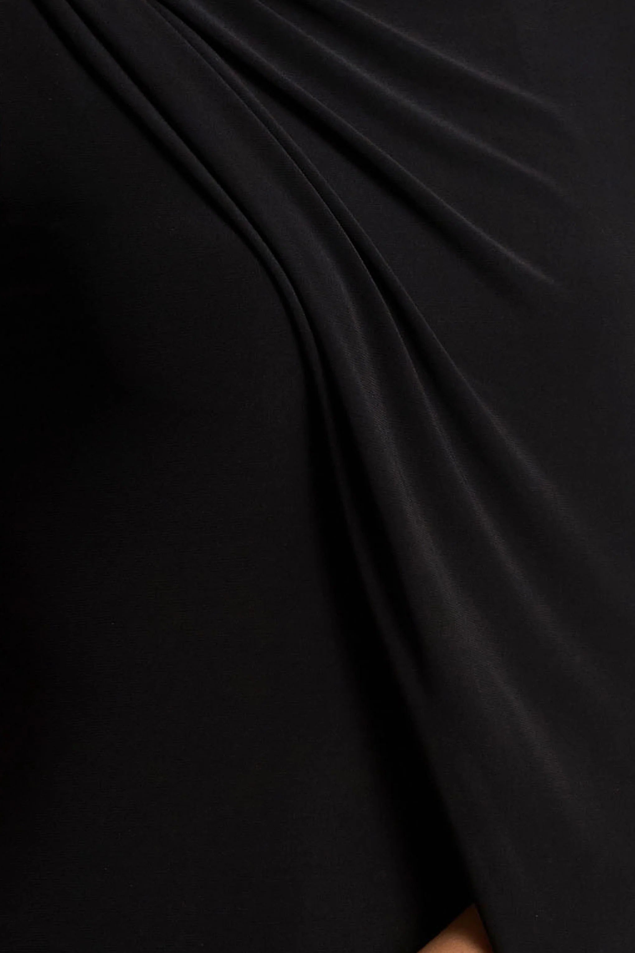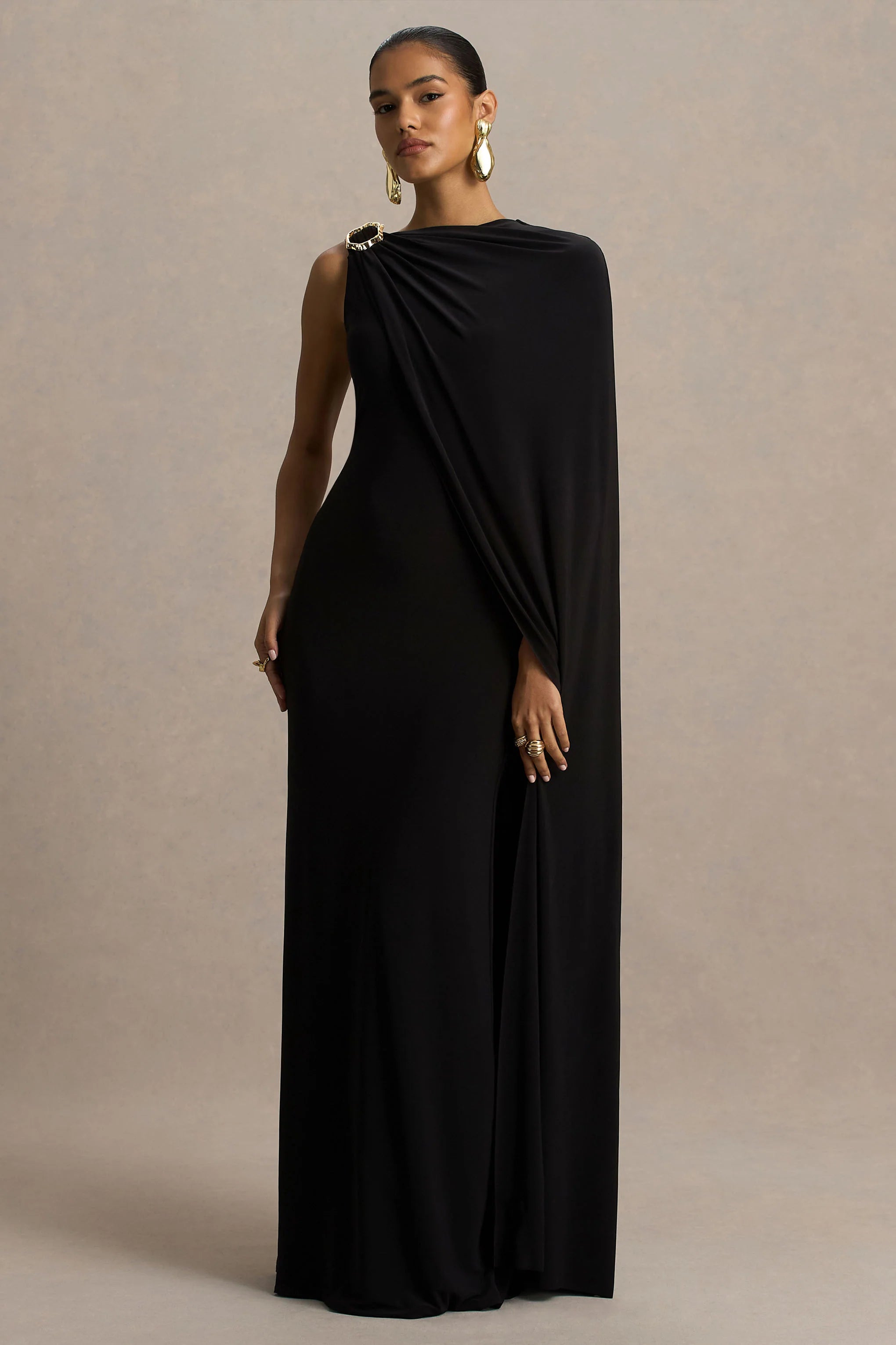 Make every entrance unforgettable in Cressida. Crafted from our premium stretch jersey, in a deep black hue, this maxi gown captivates from all angles. Featuring an asymmetric neckline and a dramatic cape-sleeve for a modern, elegant silhouette. The twist sleeve is accented with a chic gold ring detail at the front shoulder, adding a subtle touch of luxury. Perfect for evenings when you want to feel effortlessly glamorous.
