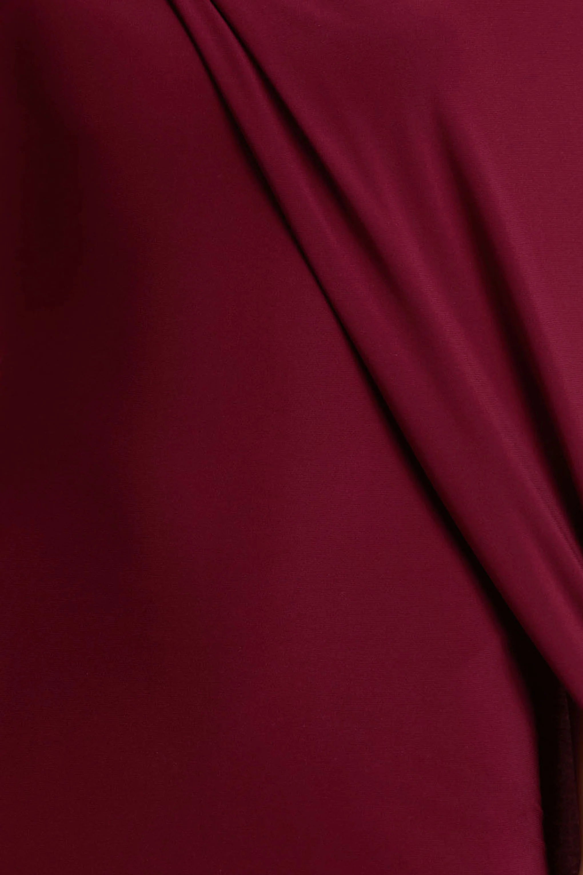 Make every entrance unforgettable in Cressida. Crafted from our premium stretch jersey, in a deep burgundy hue, this maxi gown captivates from all angles. Featuring an asymmetric neckline and a dramatic cape-sleeve for a modern, elegant silhouette. The twist sleeve is accented with a chic gold ring detail at the front shoulder, adding a subtle touch of luxury. Perfect for evenings when you want to feel effortlessly glamorous.