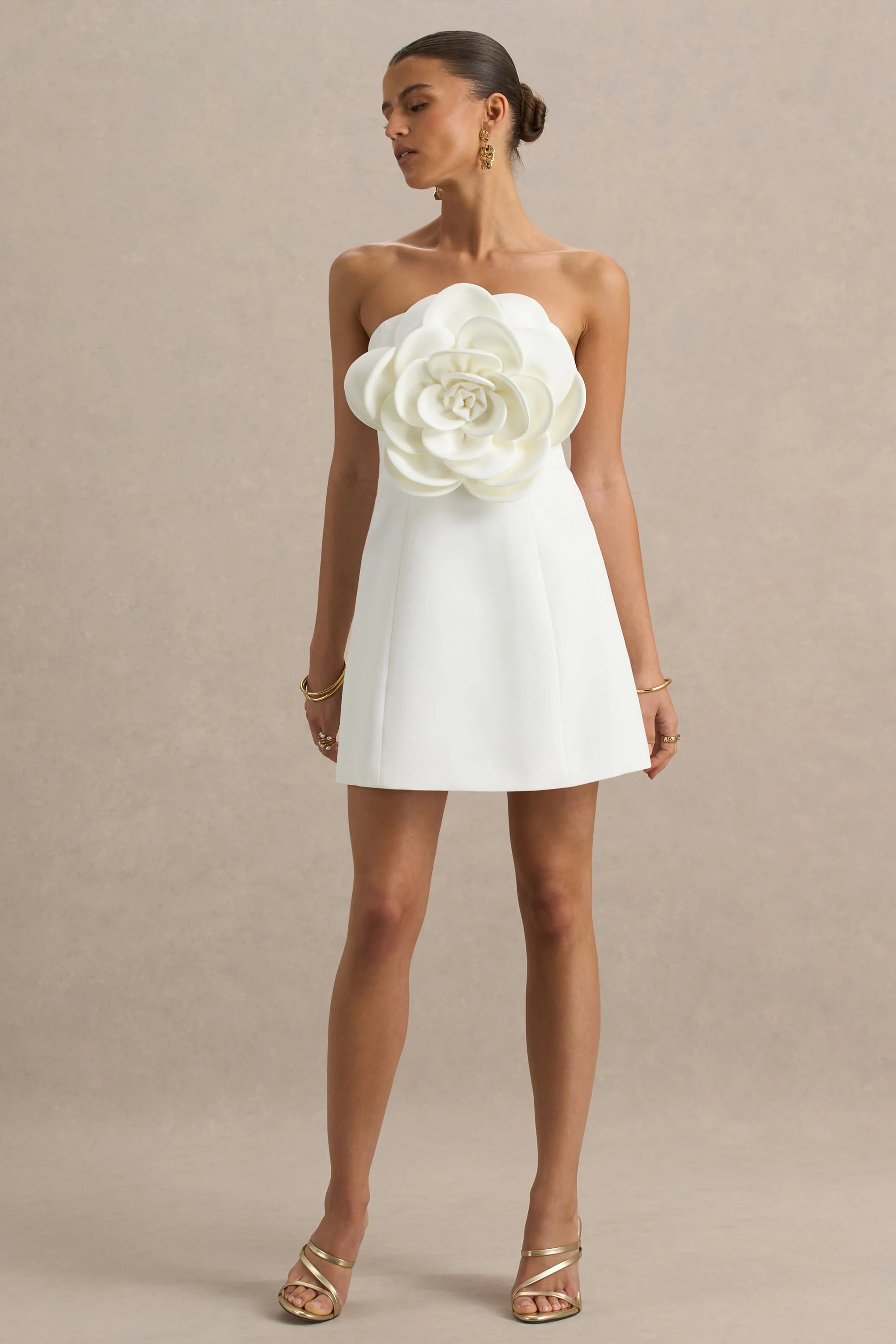 Make a bold statement this season in Daffodil. This playful and flirty mini is crafted in a soft white hue of our premium bonded crepe, providing chic structure that effortlessly enhances your figure. Finished with an elegant bandeau neckline and a statement, oversized corsage detail that brings a touch of drama to this timeless silhouette, ensuring a head turning moment. From garden parties to elegant dinners, in Daffodil you are set for all occasions.