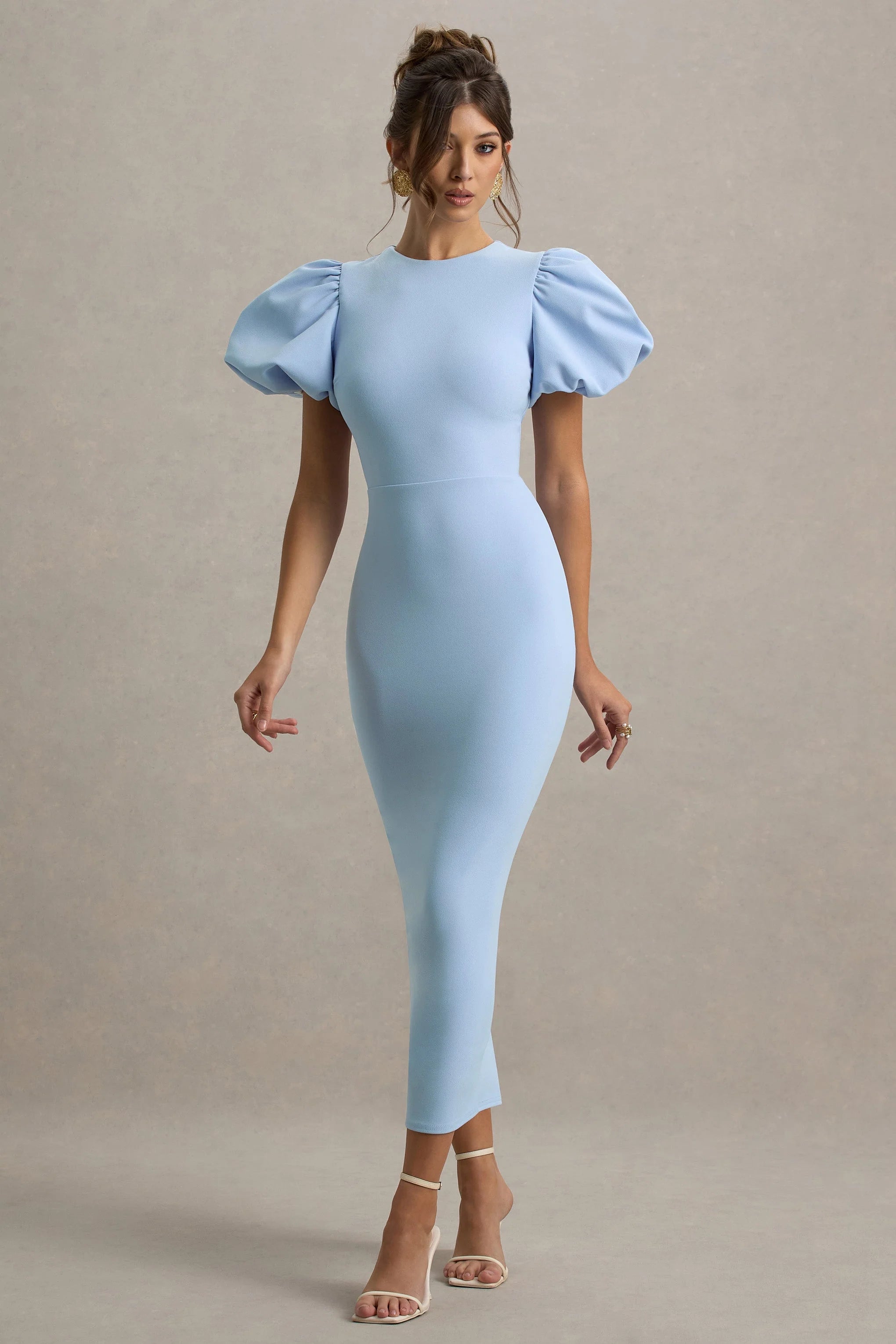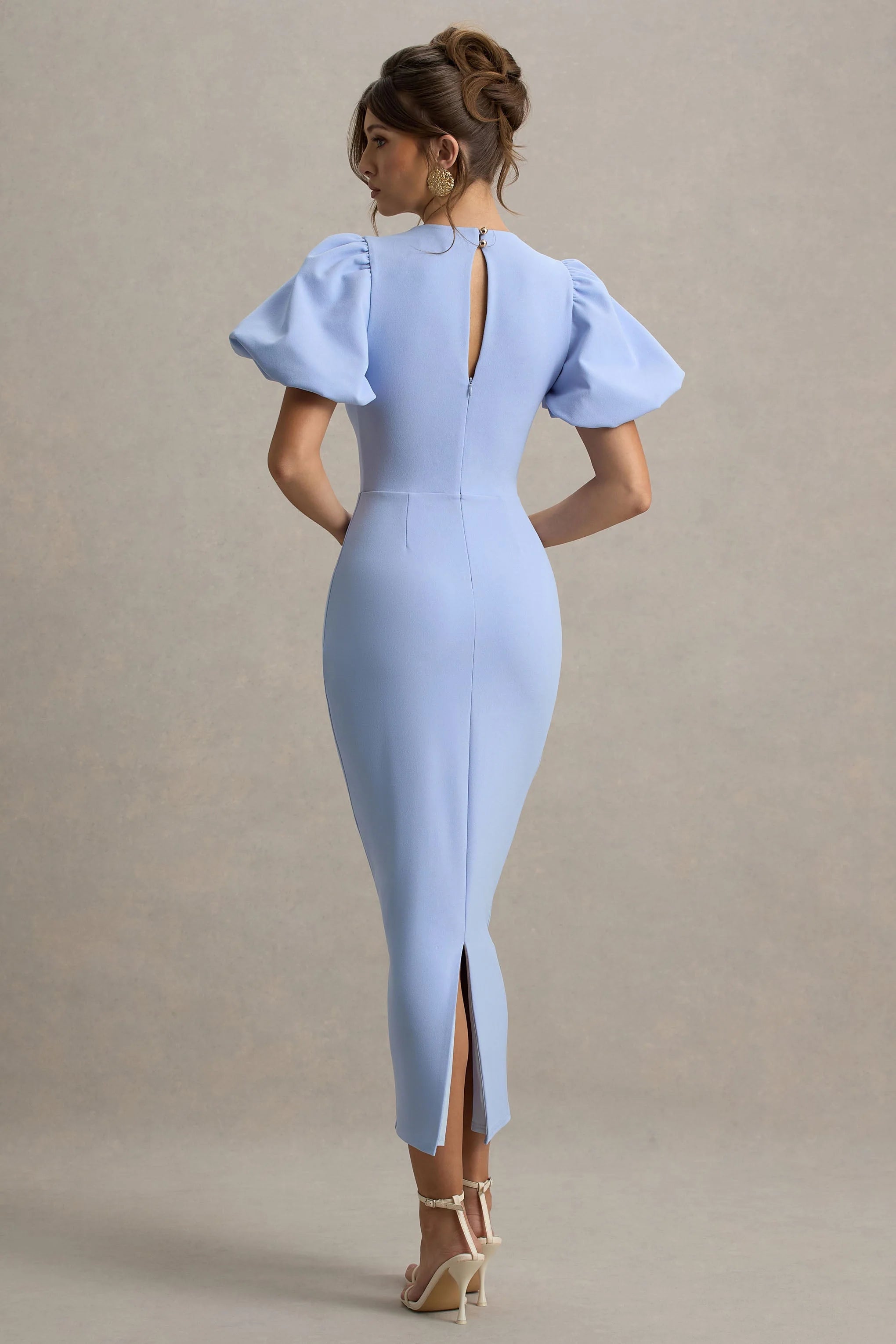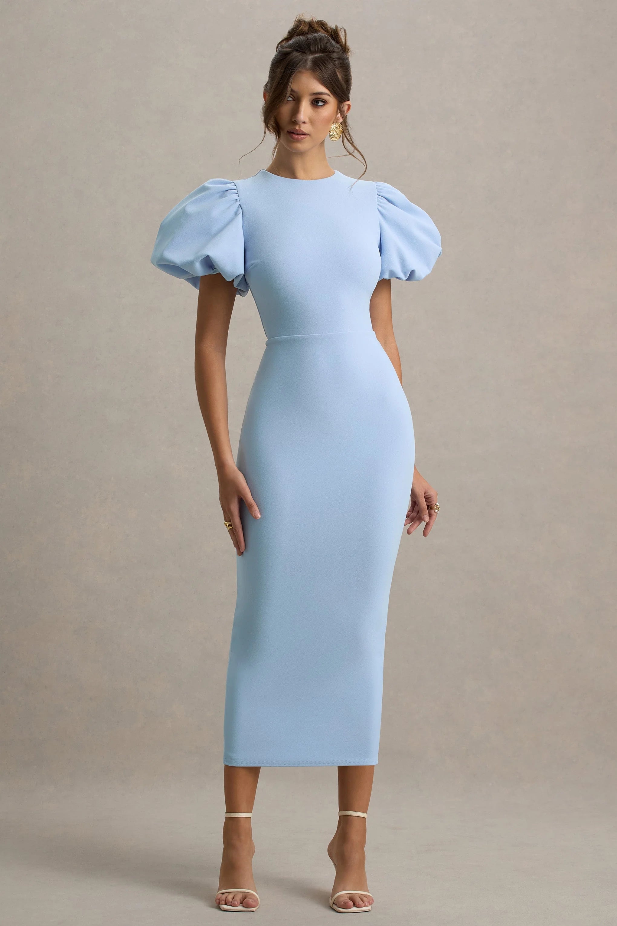 Whether you're on your best guesting behaviour for your girl's wedding or escaping to a summer garden party, Dakota is the perfect midi dress for sweetening the season in style. Crafted from our blue premium scuba crepe fabric, your silhouette is defined by a sculpting fitted bodice and skirt to accentuate your curves seamlessly.