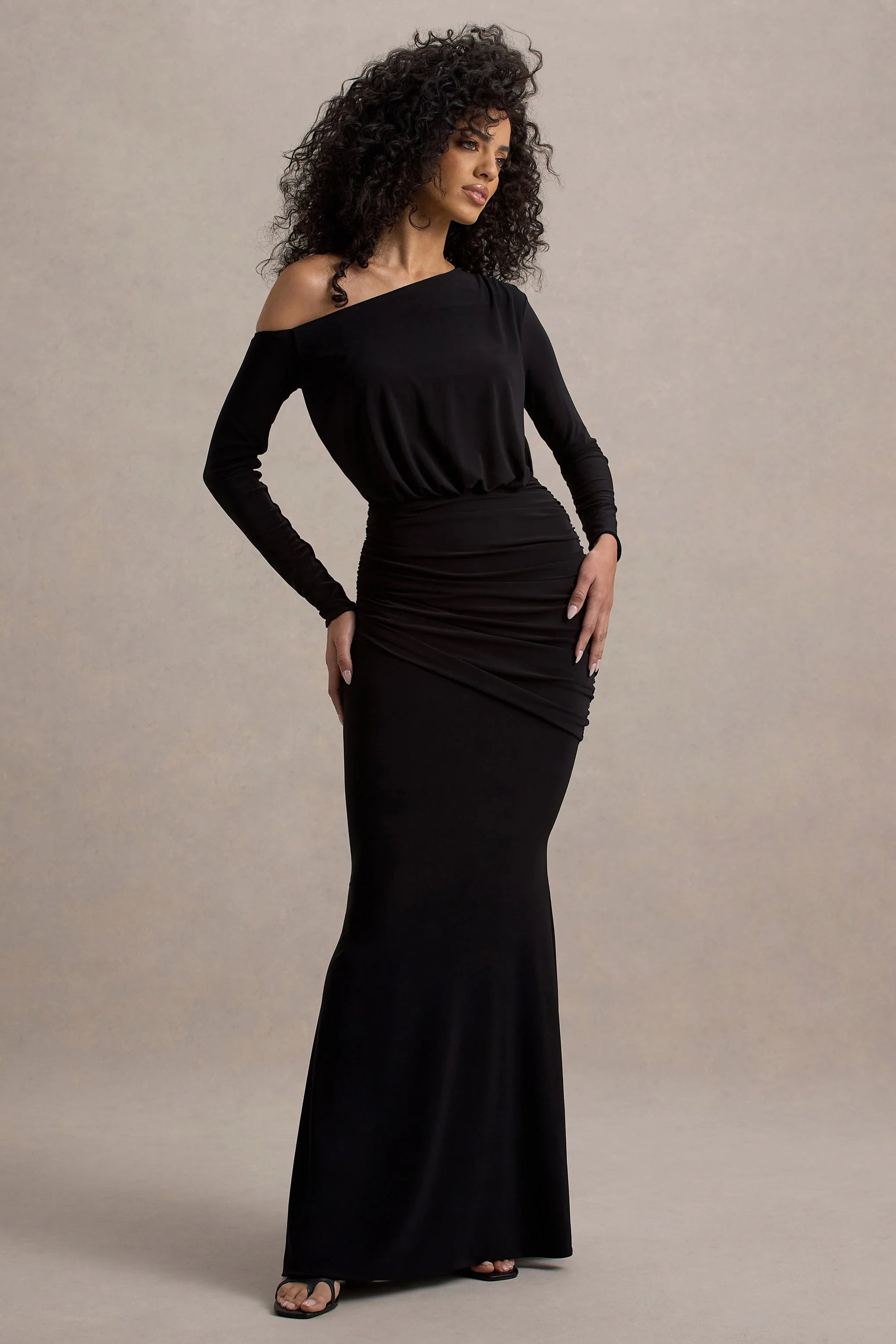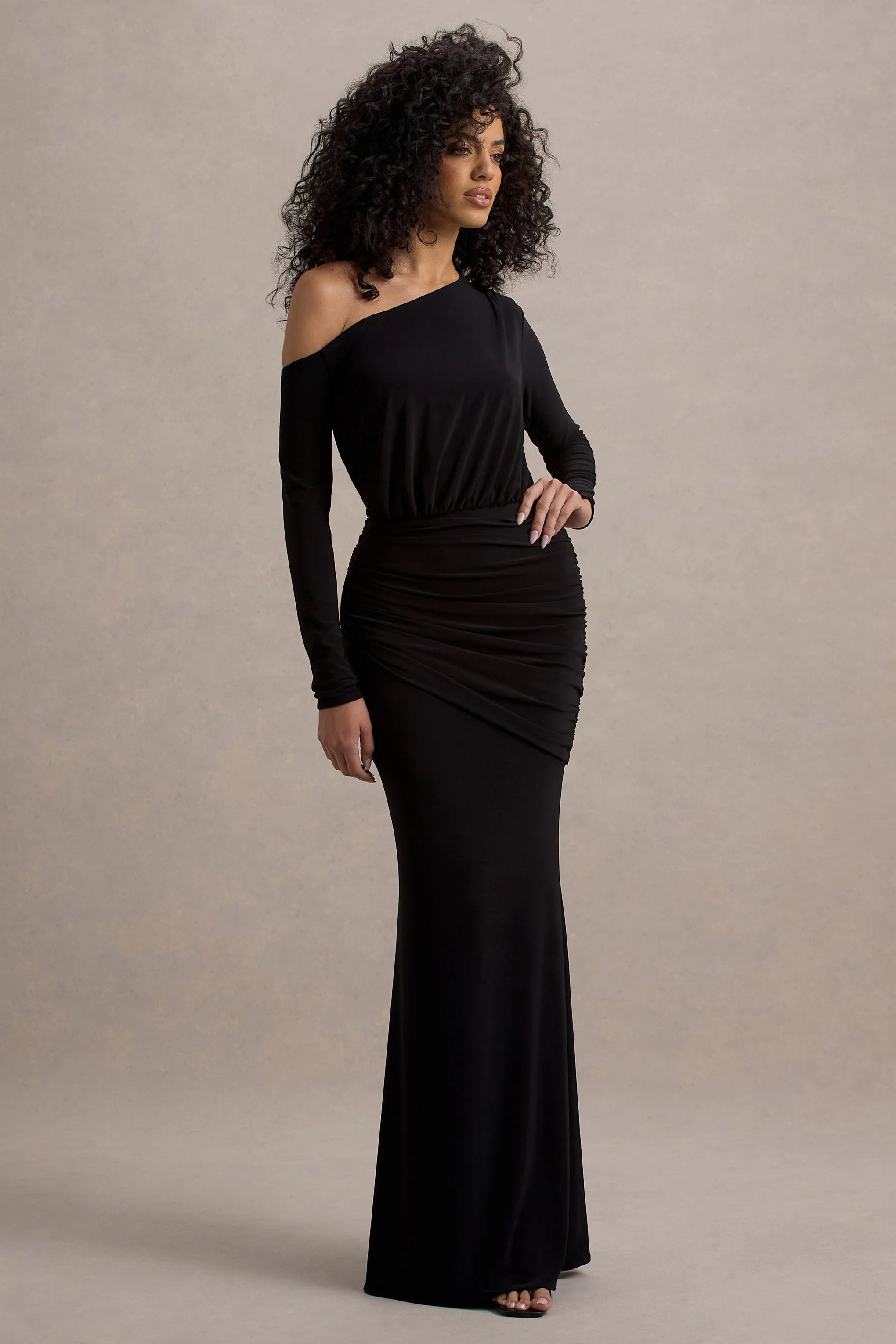 Exude a timeless allure in Deanna, our stand-out staple. Designed in a sophisticated black shade of our premium jersey, this occasion-ready gown is defined by an asymmetric neckline, long sleeves and flattering gathered waist. For a classic wedding-guest ensemble, style this black maxi with some sparkling accents like Celesta.