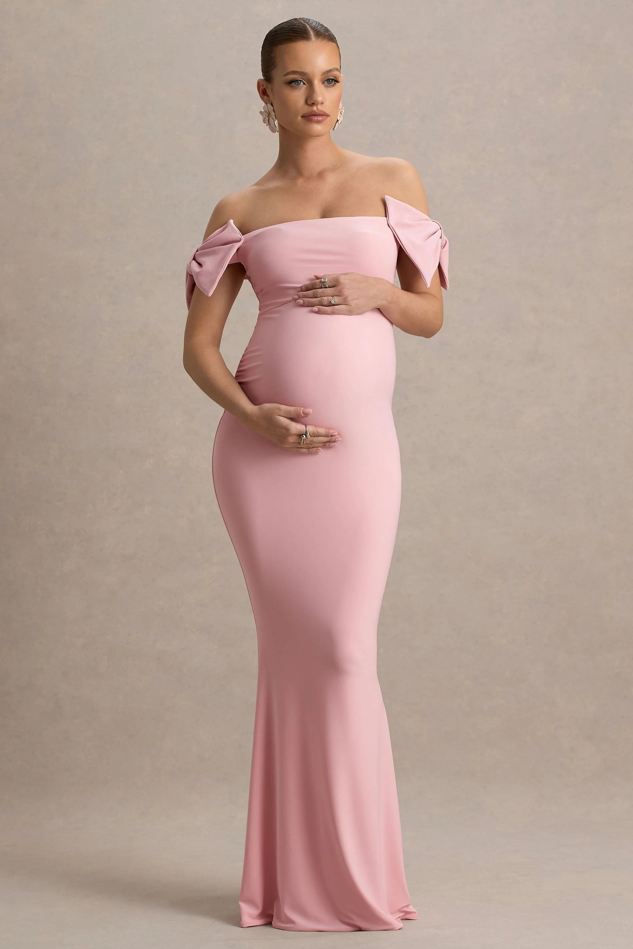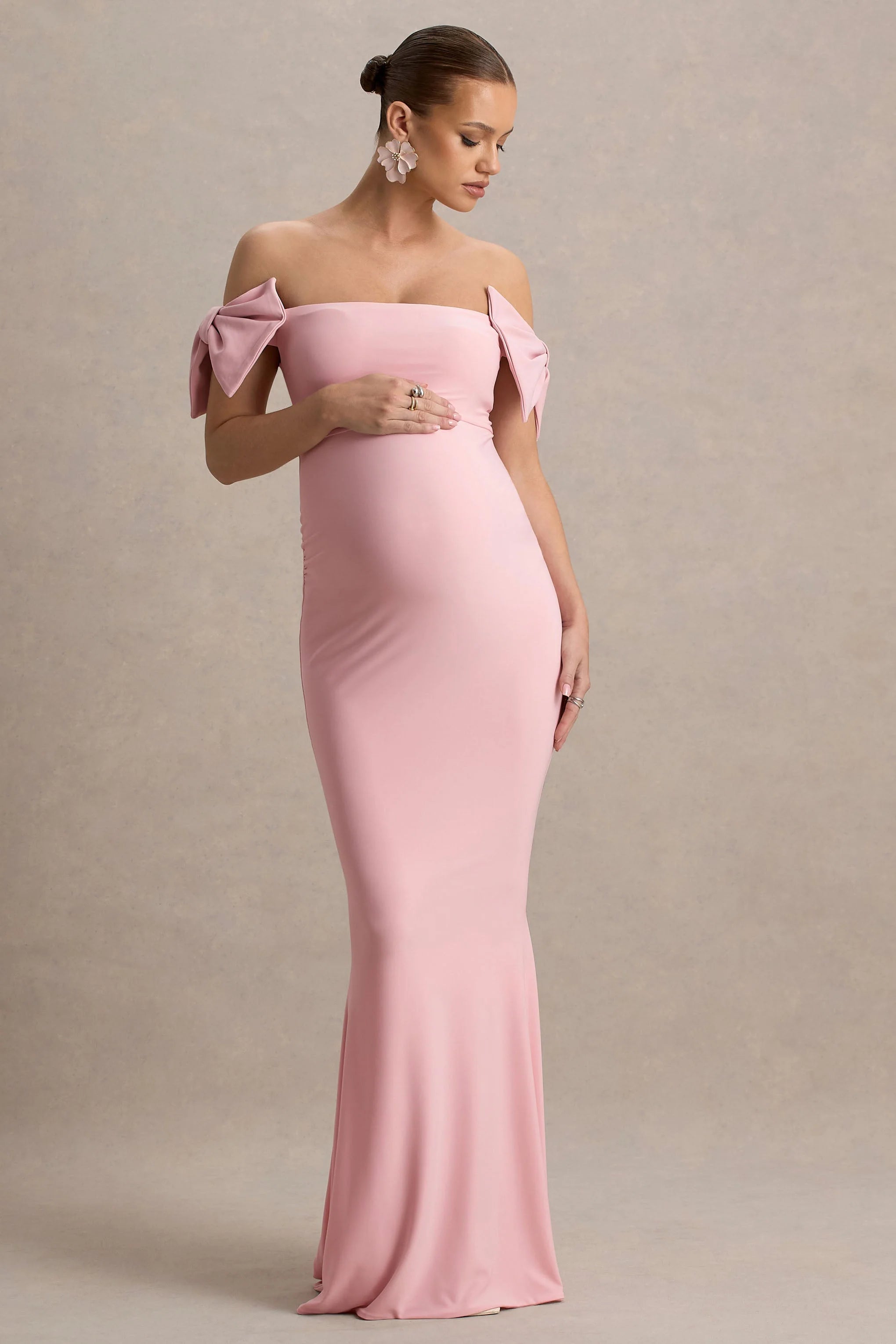 Introducing our latest maxi, designed to turn heads say hello to Didi. This gown is curated in a soft pink hue of our premium stretch jersey, for a sculpting and flattering fit. Featuring a delicate, feminine bardot neckline with gorgeous bow sleeve details adding a romantic touch. Completed with intricate ruched detailing, placed perfectly to enhance your figure and flatter your curves. Style Didi with gold accessories for your next evening occasion.