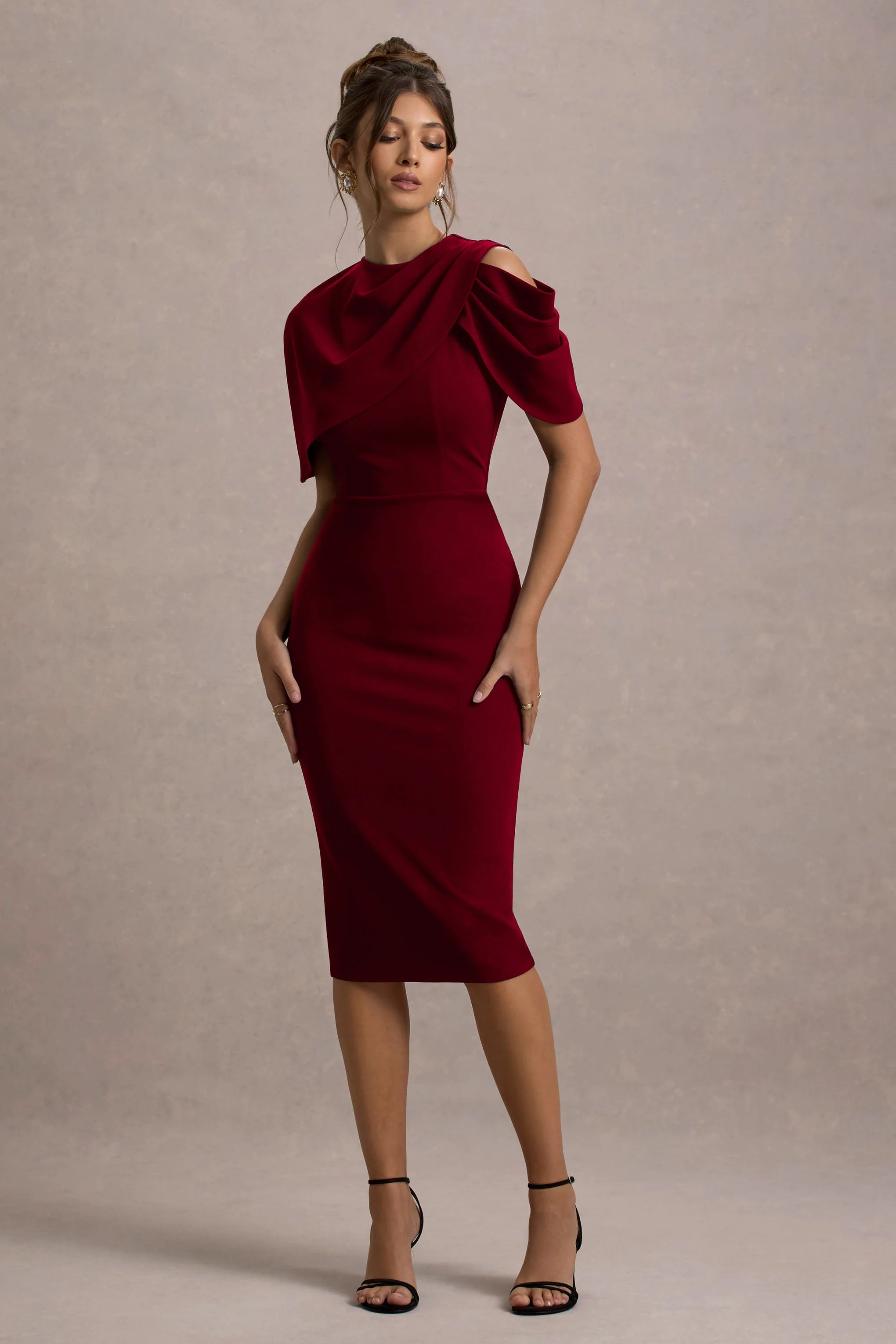 The season calls for a standout piece like Dorothea. Carefully crafted in a bodycon silhouette of draped berry premium scuba crepe, this standout piece features a classic cape detail, short sleeves, and a midi hem. To elevate this style even further, pair it with sparkling accessories like Flash.
