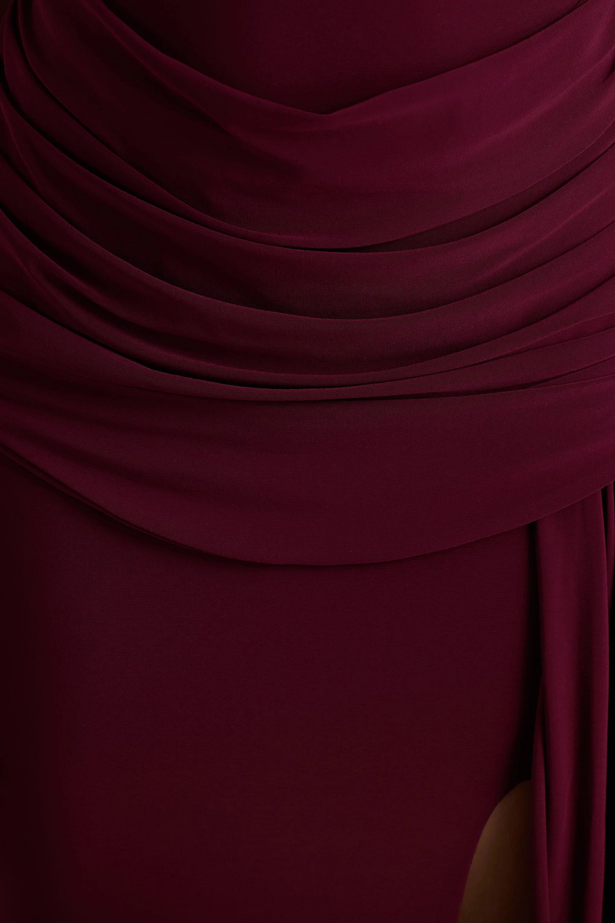 Command the room in Dynasty, a sleek gown that defines modern elegance with a daring edge. Cut from our burgundy premium stretch jersey, this statement maxi silhouette sculpts your figure, flattering you from all angles. The asymmetric neckline gives this piece a bold twist, balanced by a draped waist and flowing sash detail that cascades to the floor with fluid movement. The high front split adds that final touch of allure that guarantees a head turning entrance. Pair Dynasty with sleek heels and gold accessories, for dressed up occasions all season long.