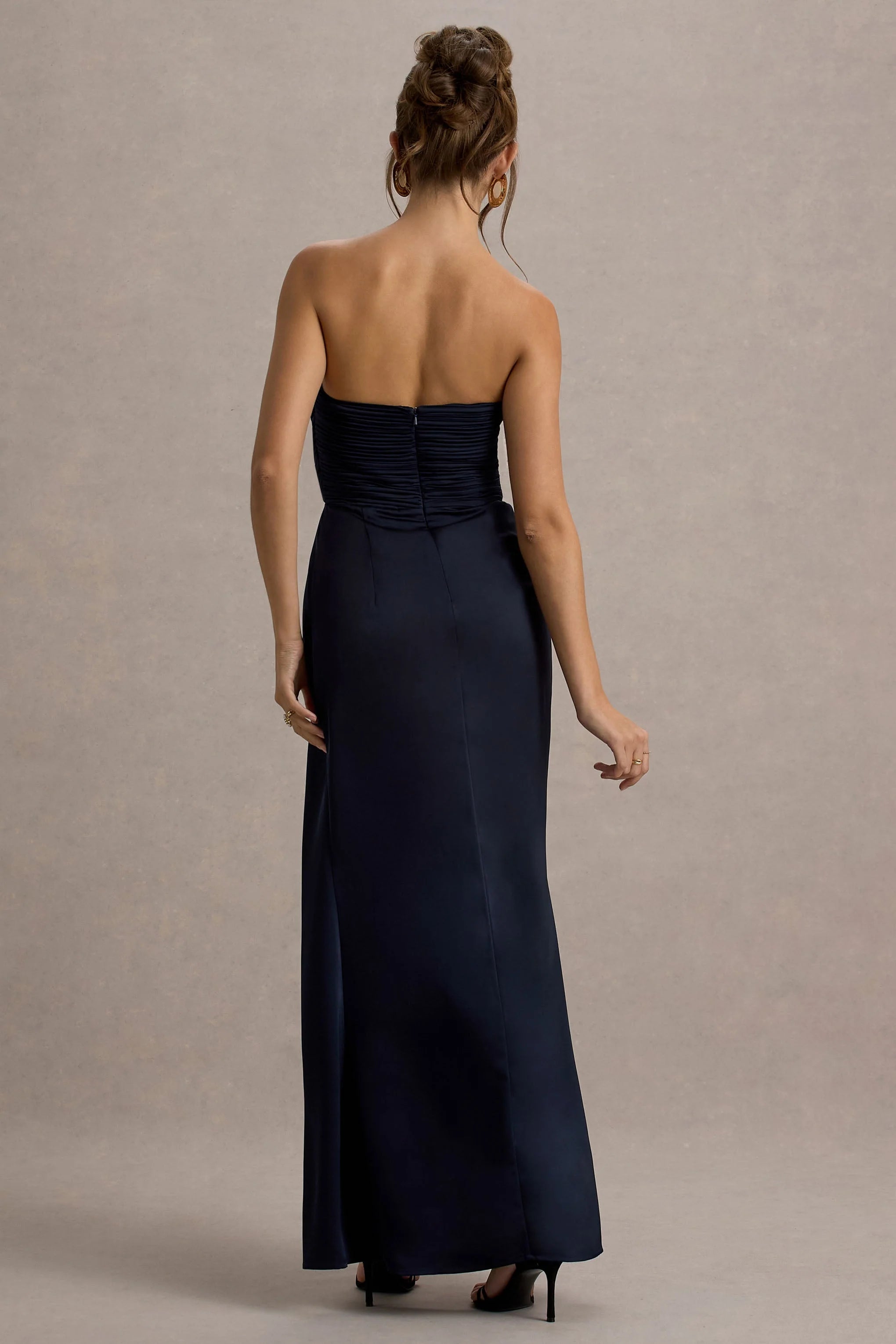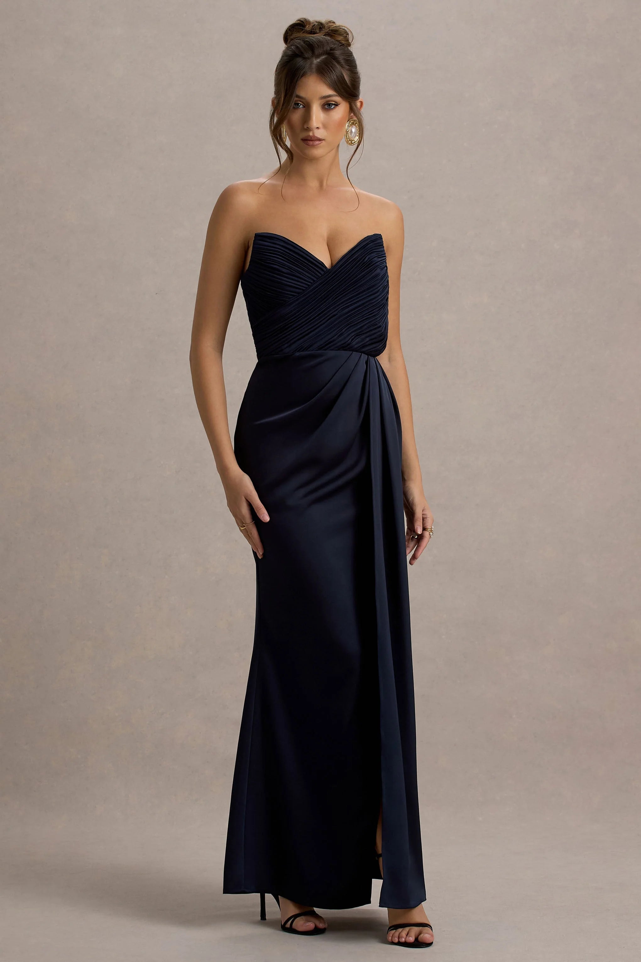 Exuding a lustrous sheen, this satin maxi dress is an elegant choice for any event. Arriving in a rich navy hue, this strapless floor-sweeper boasts a pleated bodice, boned corsetry and artful drape detail. For a classic bridesmaids ensemble, pair Edel with an opulent tousled bun and some strappy stilettos like Crossed Wires.