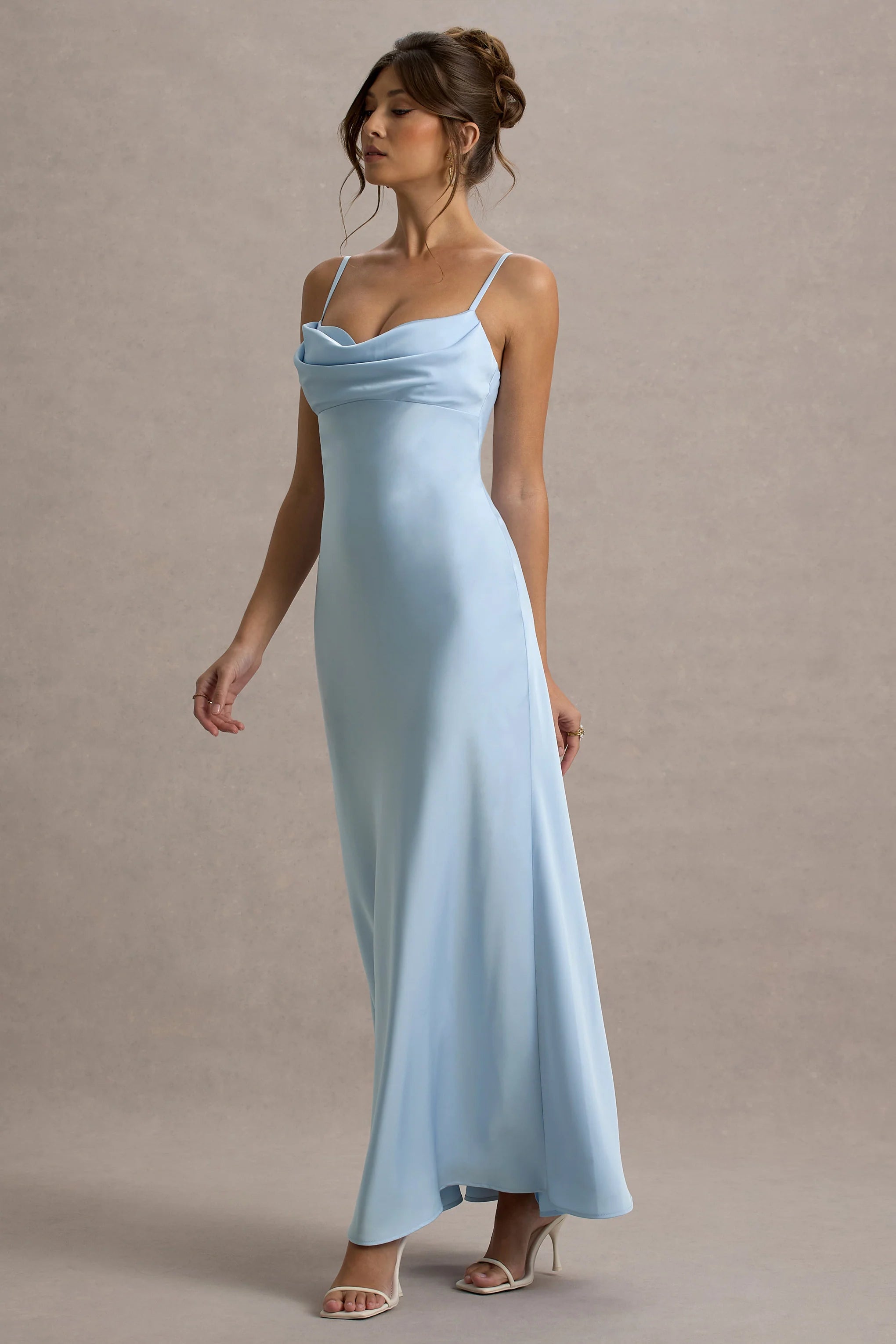 Eimear is a striking blend of sophistication and glamour. Crafted in our premium satin in a stunning powder blue shade, this piece showcases a flattering sweetheart neckline which cascades in a flattering silhouette. Perfect for weddings or proms, style yours with classic stilettos to make a statement.