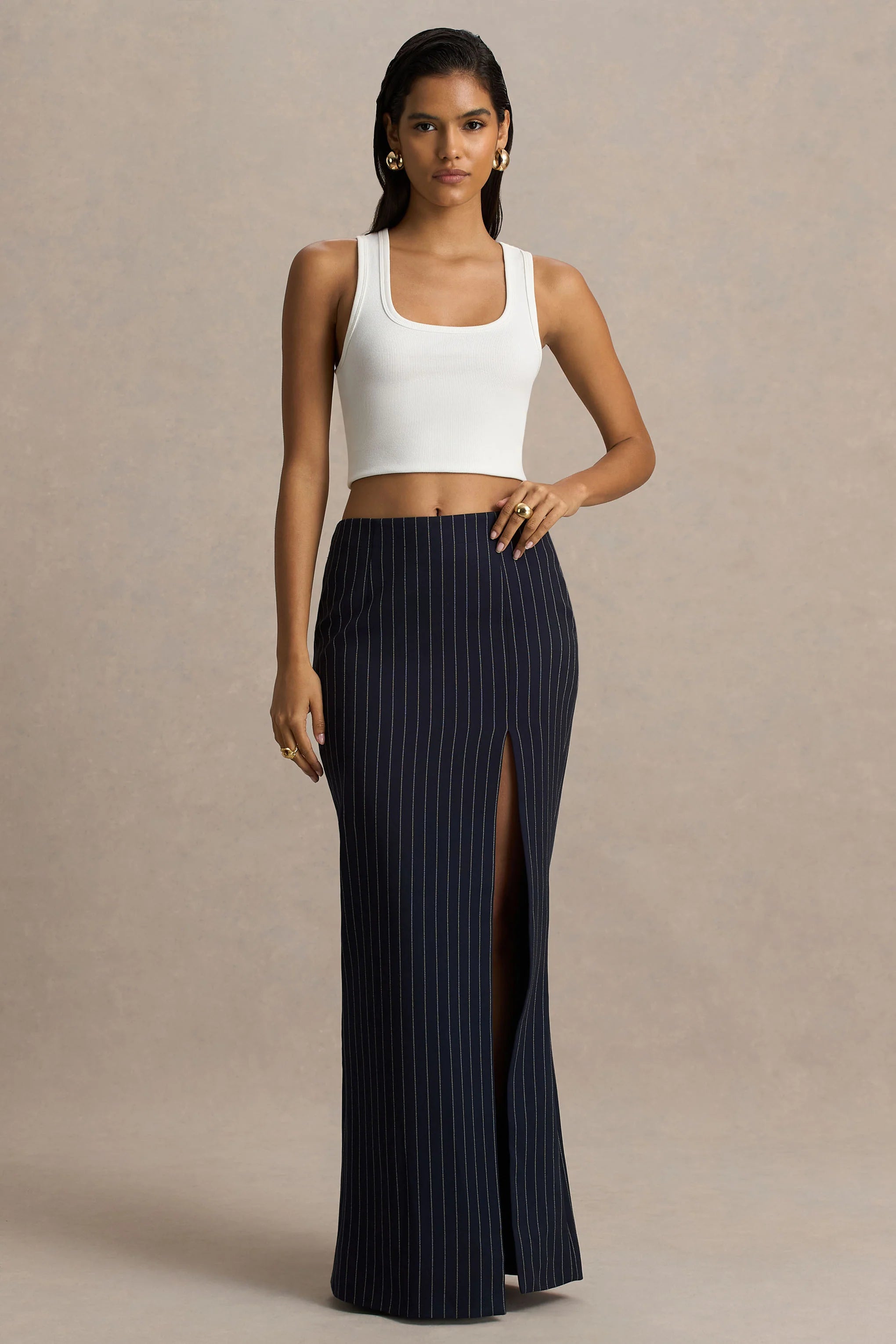 Step into effortless elegance with Elana, your go-to statement maxi for any occasion. Crafted from our premium crepe in a sophisticated navy pinstripe, this floor-sweeping design features a daring front-high split that adds just the right amount of edge. Maxi-length perfection ensures a graceful silhouette, making it a timeless addition to your wardrobe. Style with our Alana blazer for a look that'll take you from business meeting to rooftop drinks.