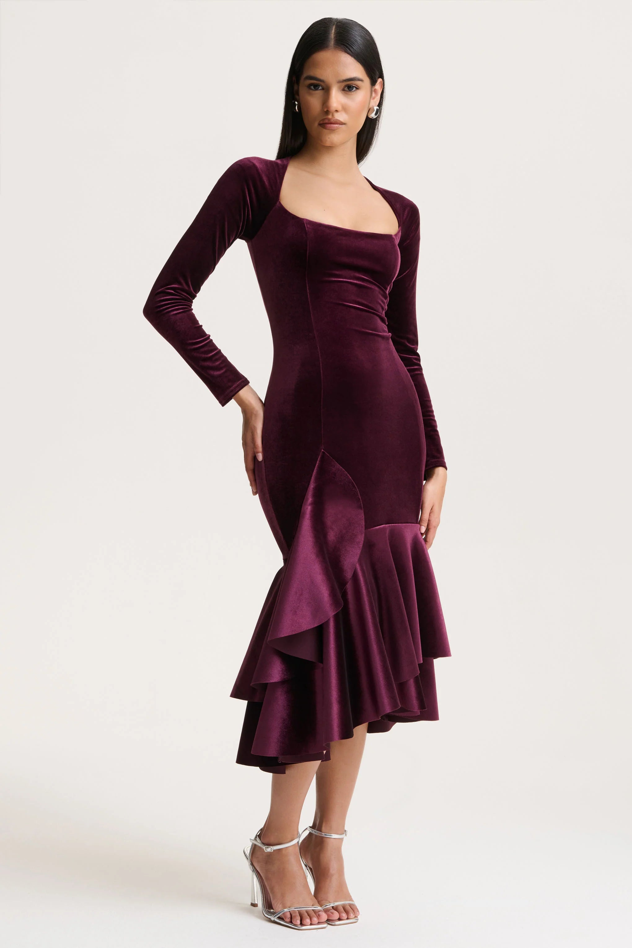 Emberlyn blends timeless elegance with a touch of dramatic flair. Crafted from luxurious premium velvet in a deep burgundy hue, this midi-length design skims the silhouette with refined sophistication. The scoop neckline and long sleeves create a sleek, balanced shape, while the ruffled fishtail hemline adds movement and a statement finish. Emberlyn is made for evenings that call for poise, confidence, and classic glamour with a modern twist.