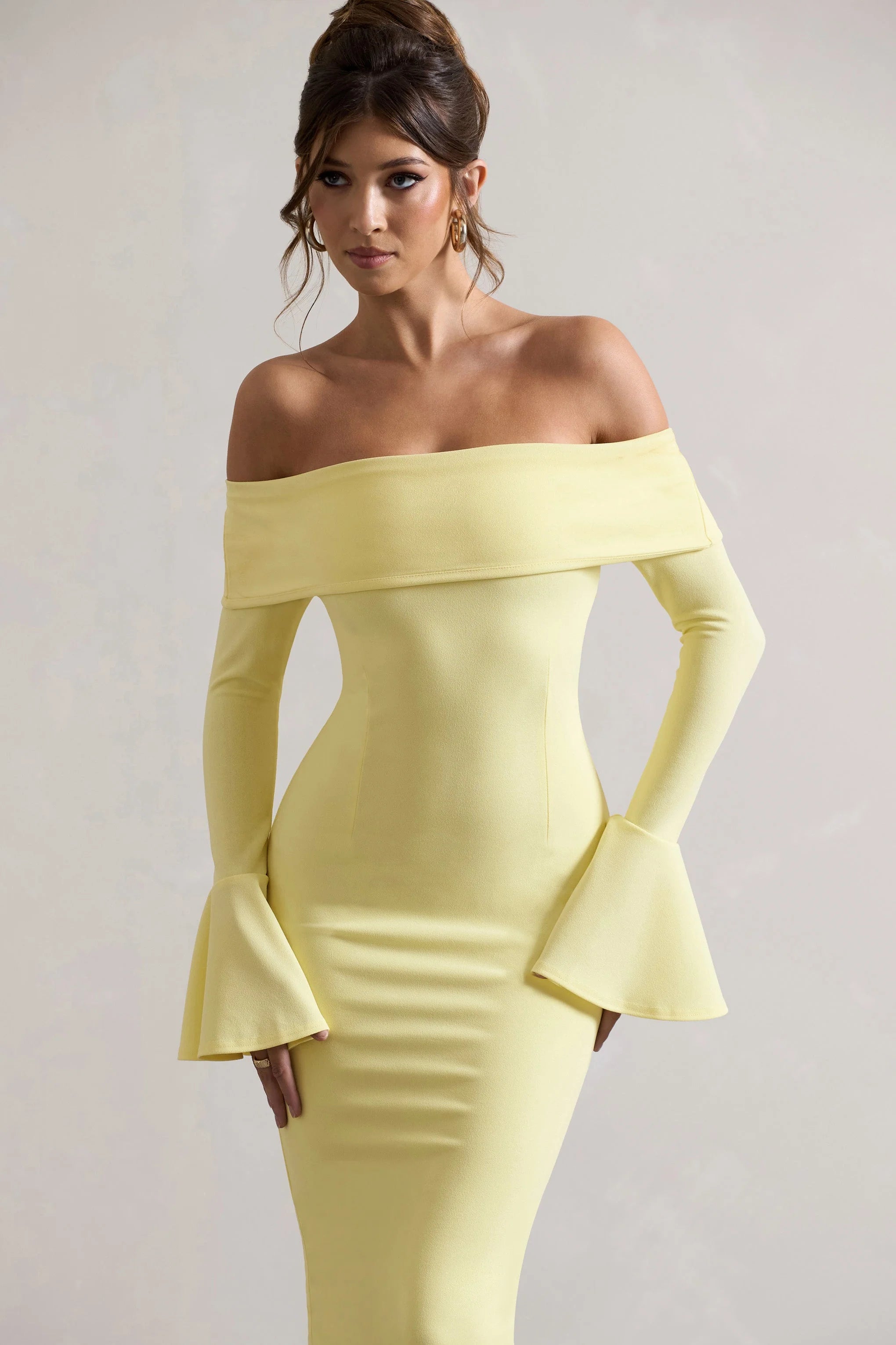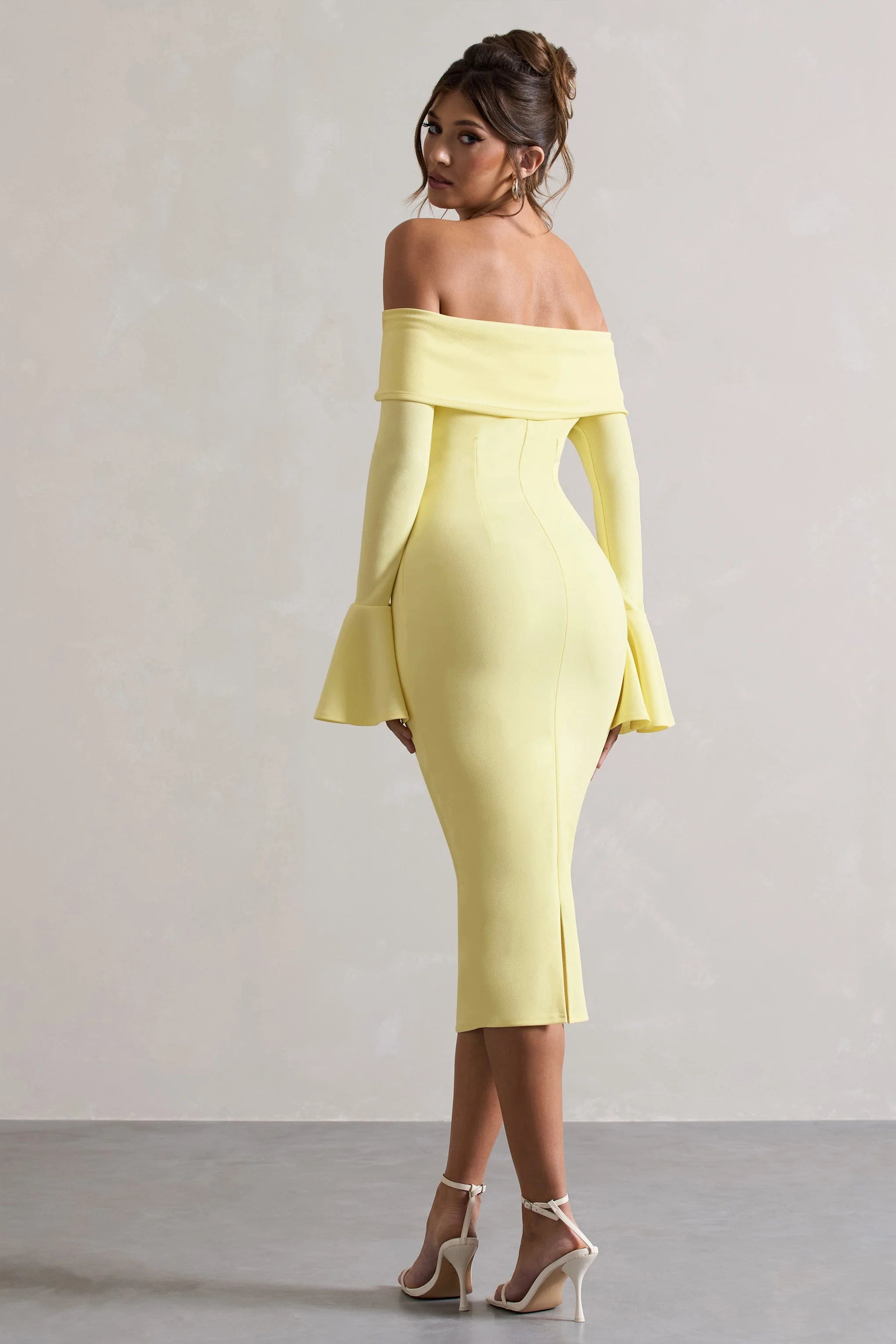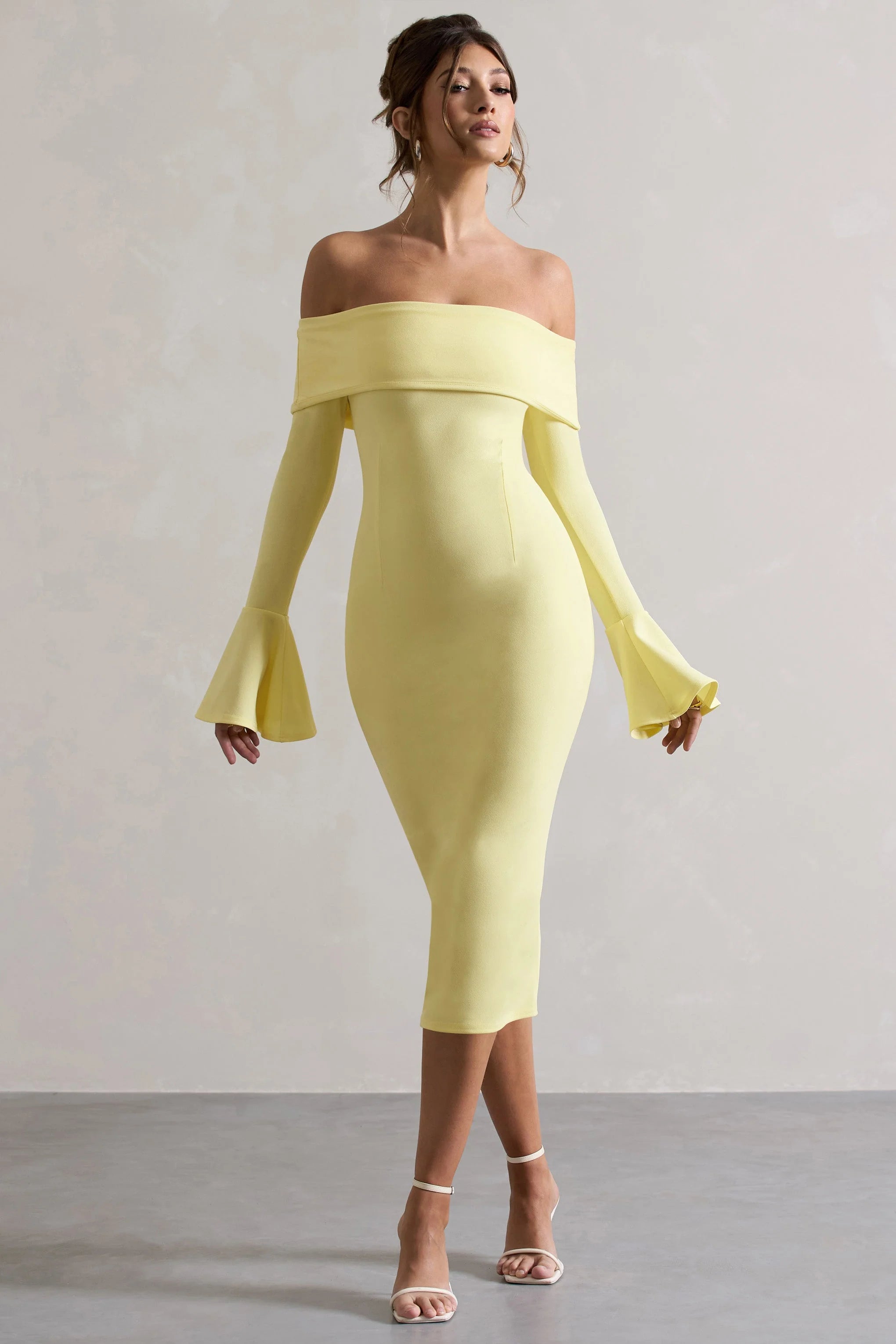 Look effortlessly elegant in Emma, a must have midi for the upcoming event season. Designed in our figure hugging scuba crepe in a light lemon shade, this bodycon dress boasts a classic bardot neckline with flattering flared sleeves. Style Emma with a tousled bun to show of that beautiful bardot ar your next occasion.