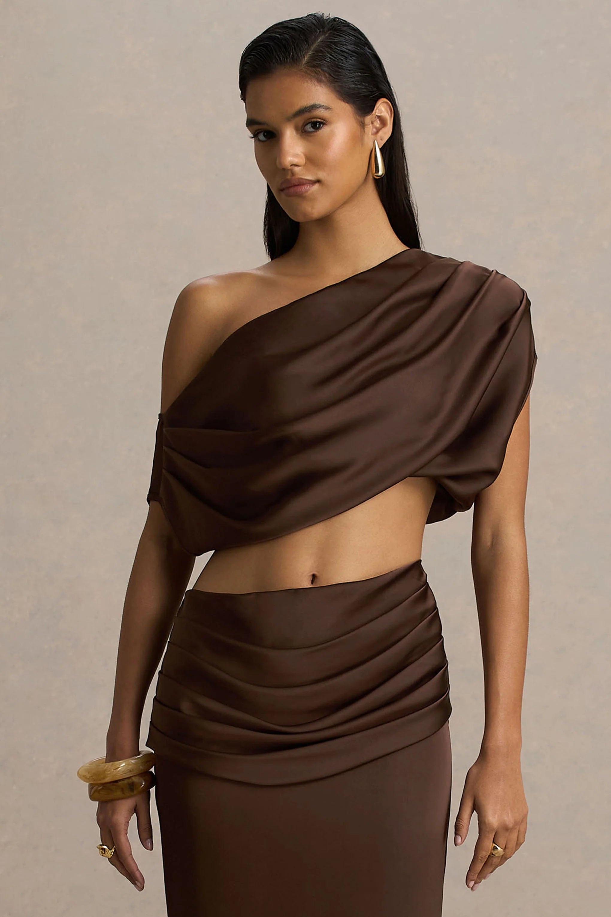 Flatter from every angle in Entrapment, a statement top designed to elevate your look. Cut from our premium satin with an asymmetric neckline, this cropped piece blends soft draping with bold, contemporary style. The self-tie back and keyhole detail add a feminine finish while ensuring a flawless fit. Pair it with our Megan skirt for a co-ord look that’s sleek, sculpted, and undeniably sophisticated.