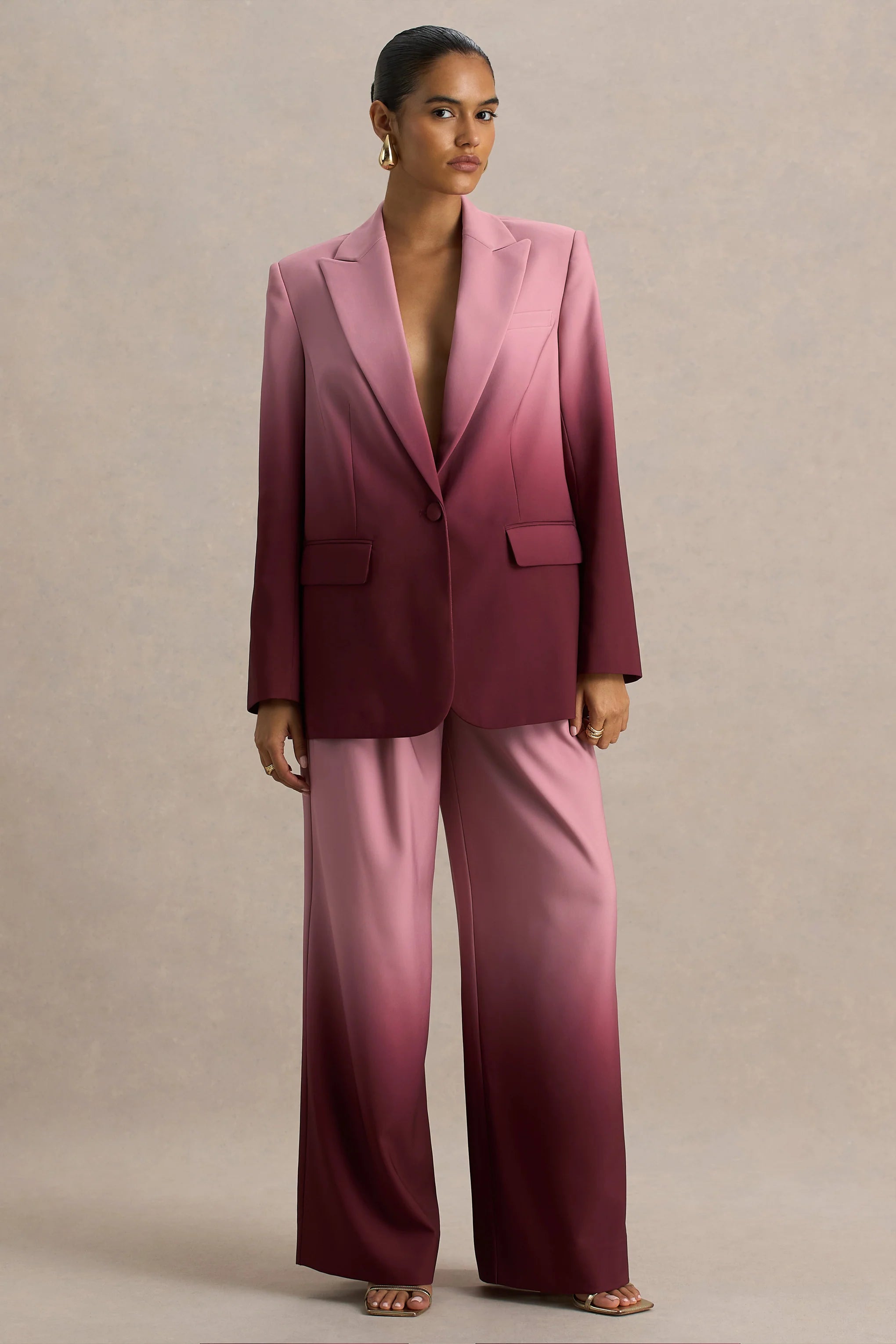 Introducing our latest statement-making piece Enya. This elevated blazer is cut from our premium satin in a striking cherry ombré. Featuring a sharp collared neckline and single button fastening, this tailored piece balances sleek structure with standout style. Pairing perfectly with our Safia trousers, this suit was made to make power moves.