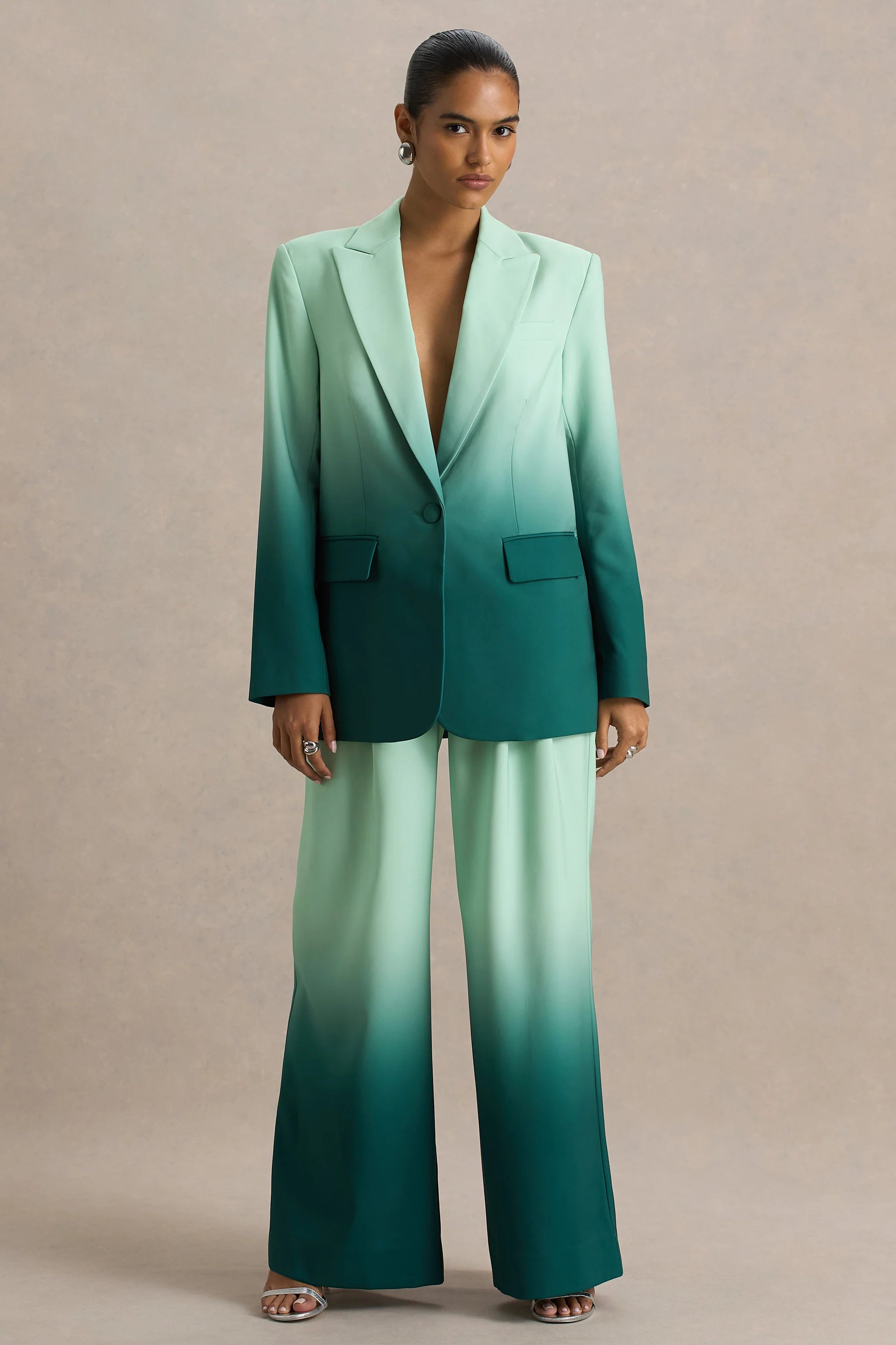 Introducing our latest statement-making piece Enya. This elevated blazer is cut from our premium satin in a striking emerald ombré. Featuring a sharp collared neckline and single button fastening, this tailored piece balances sleek structure with standout style. Pairing perfectly with our Safia trousers, this suit was made to make power moves.