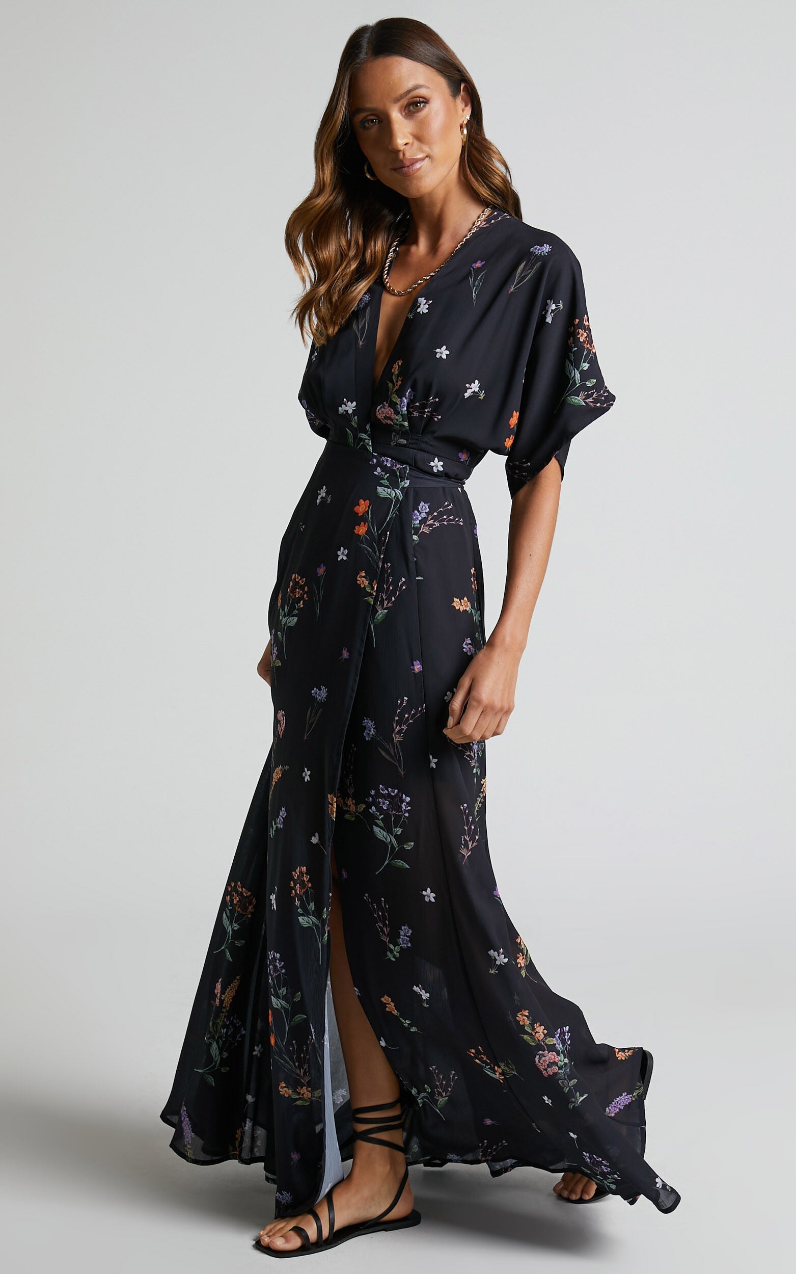 Get ready to make a bold statement with our Erenza Midaxi Dress in Black Flower Field. This extended sleeve wrap dress is perfect for any occasion, whether it's a casual day out or a springtime soiree. Made from high-quality polyester, this dress offers both comfort and style. The V neck adds a touch of sophistication, while the midi length keeps things classy yet trendy. With its short sleeves and flattering wrap design, this dress will have you feeling empowered and ready to conquer anything that comes your way. So go ahead and embrace your inner fashionista with our Erenza Midaxi Dress - because every girl deserves to look fabulous!Product Details:Wrap style midi dressV-neckline and short sleevesMade from polyester fabricCasual spring dressSize and FitSize S / 8 length: 146cm / 57.48inStudio model is wearing size XS / 6 AU / 2 US / 6 UK / 34 EUStudio model measurements are:Height: 170cm / 5'7''Bust: 84cm / 33''Waist: 61cm / 24''Hip: 88cm / 35''Studio model is wearing size XXXL / 18 AU / 14 US / 18 UK / 46 EUStudio model measurements are:Height: 172cm / 5'8''Bust: 111cm / 44''Waist: 91cm / 36''Hip: 129cm / 51''Material and CareMain Fabric: 100% PolyesterLow / No stretch