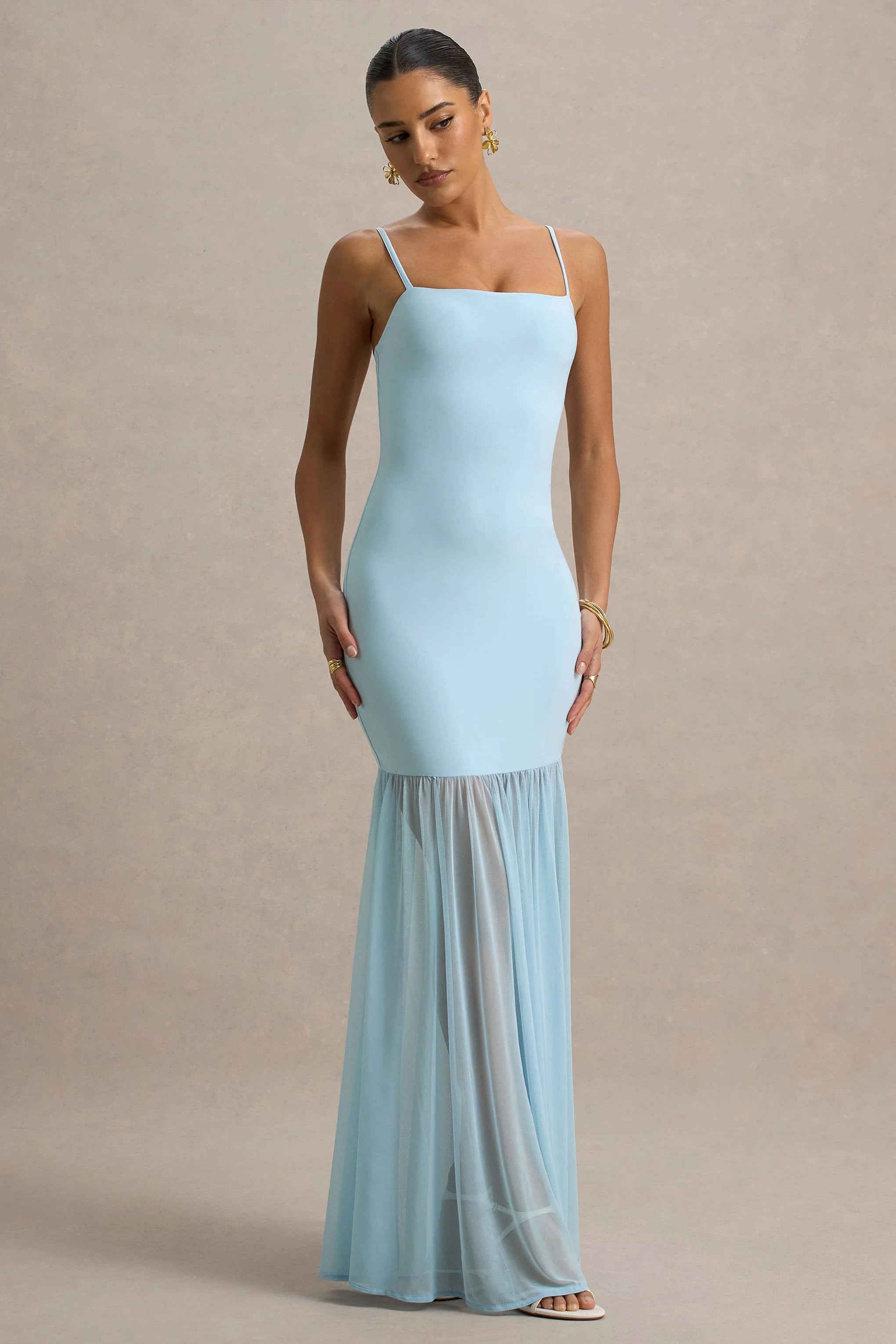 Elegant with a sultry and striking edge, say hello to Ernie. Expertly designed in our powder blue premium stretch jersey, to shape and flatter, with a contrasting sheer mesh skirt for a daring touch. The square neckline exudes femininity while the adjustable straps allow for a seamless fit on everybody, framing your shoulders beautifully. The perfect dress for elegant affairs paired with a statement earing.