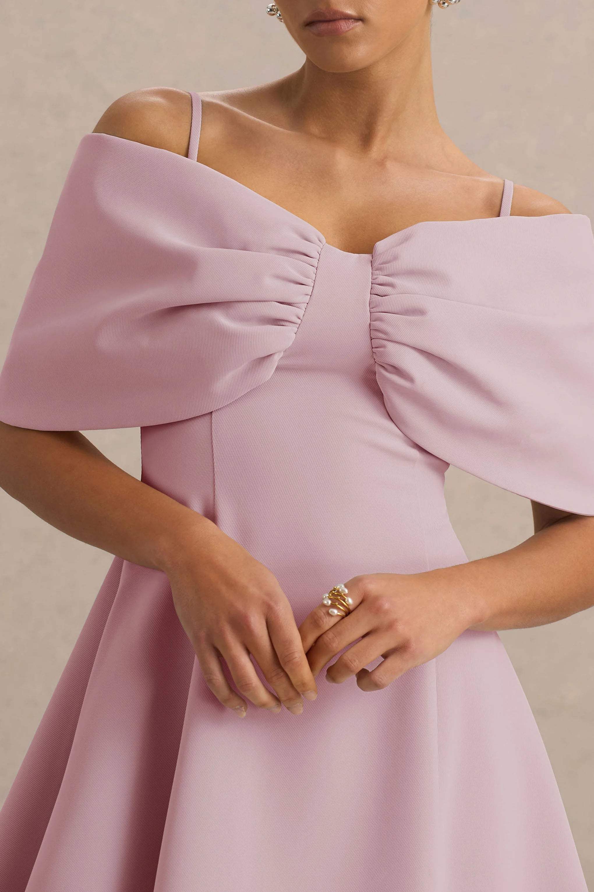 Introducing Faria the mini your wardrobe has been waiting for, pretty, playful and undeniably chic. Cut from our premium stretch crepe in a soft blush pink hue, this flirty silhouette stuns any room. Finished with a statement, bow style, bardot neckline that elegantly displayed your decolletage and a skater skirt that moves effortlessly. Perfect for any occasion, from date nights to race days, styled with gold accessories.
