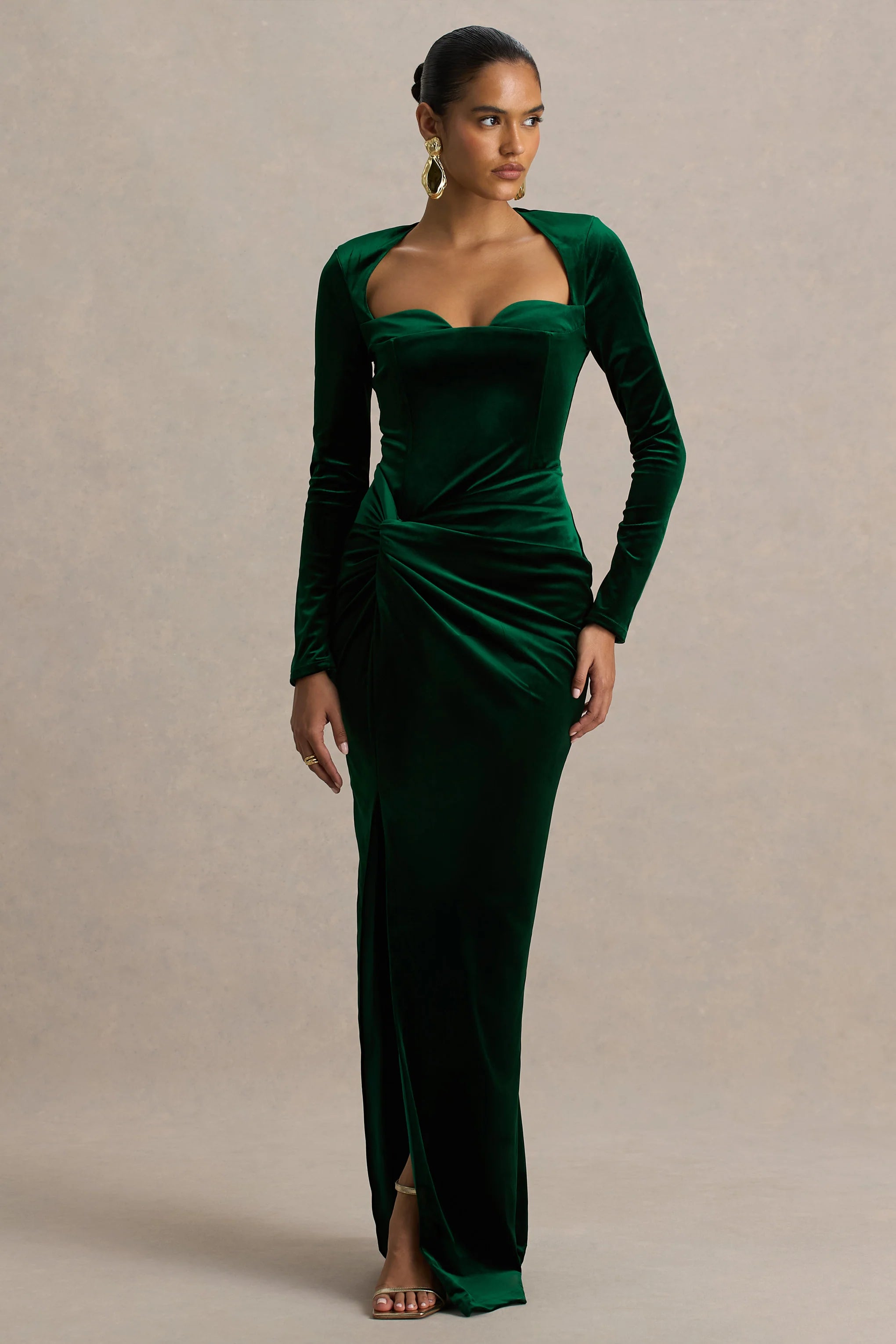 Luxurious velvet fabric in a rich green hue shapes are demure Fay maxi dress. Channeling Hollywood glamour with it's corseted silhouette, this floor sweeper features long sleeves with structured shoulder pads to exaggerate and accentuate your feminine curves. A split skirt with a statement knot brings equal attention to your gorgeous legs. What better dress to wear to your next black-tie event?