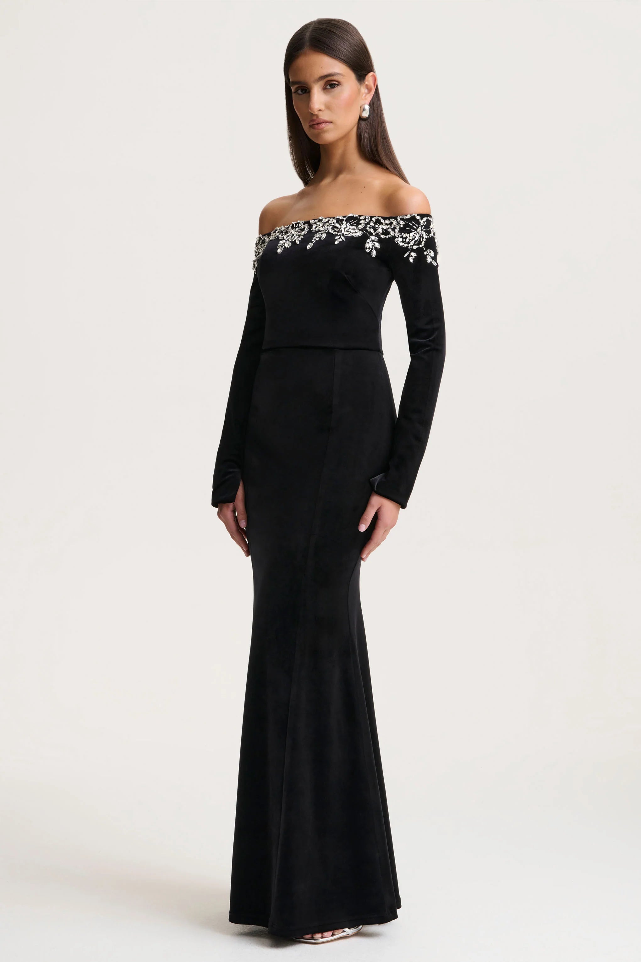 Say hello to Fern, the maxi dress that defines timeless allure. Crafted from our premium black velvet, its floor-length silhouette smooths and sculpts for an effortlessly elegant fit. The embellished bardot neckline adds a touch of glamour, while long sleeves bring refined sophistication. Fern is your go-to for statement evenings and unforgettable occasions.