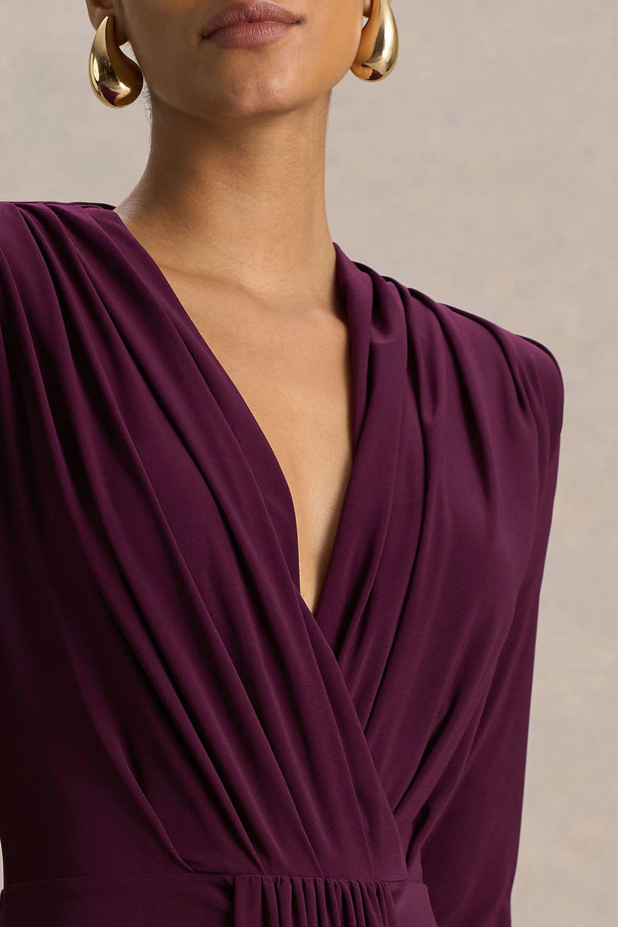 Radiate sophistication and allure in our Flashy maxi. This show-stopper is curated in a rich burgundy shade of our premium stretch jersey, providing a sculpting and figure-flattering finish. Designed with a daring plunge neckline and statement shoulder pads, this gown gives you elegant structure with a sultry edge. Elevated with a draped feature and ruched detailing, this floor sweeper exudes luxury chic. To complete the look style with a timeless up-do and sleek heels, and be prepared to turn heads.
