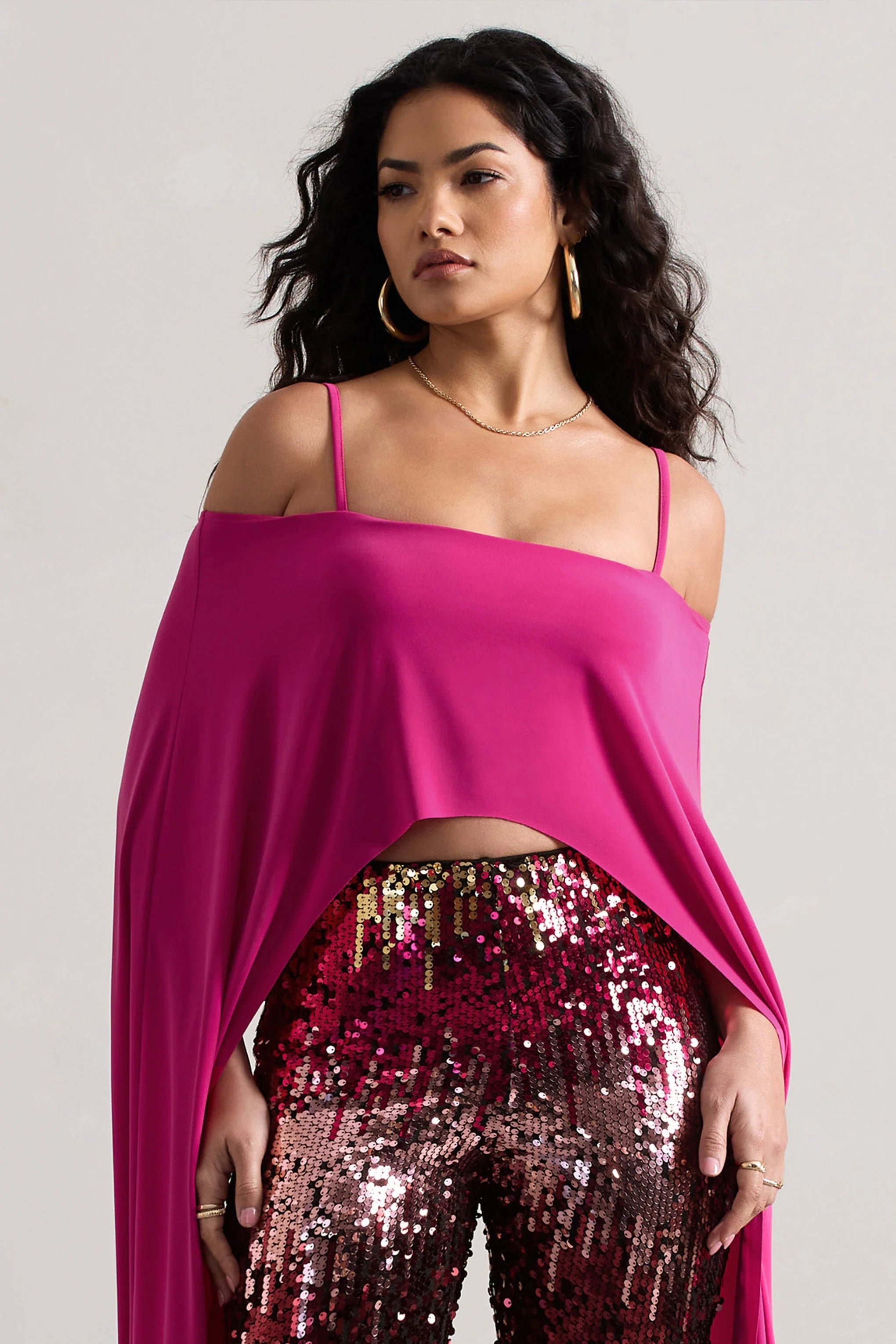 Get festival ready this summer with Floyd, our dark pink crop top. With exaggerated cape sleeves, this statement piece is sure to turn heads. Team yours with our pink and gold sequin flares Carnival for a bold look at your next event.