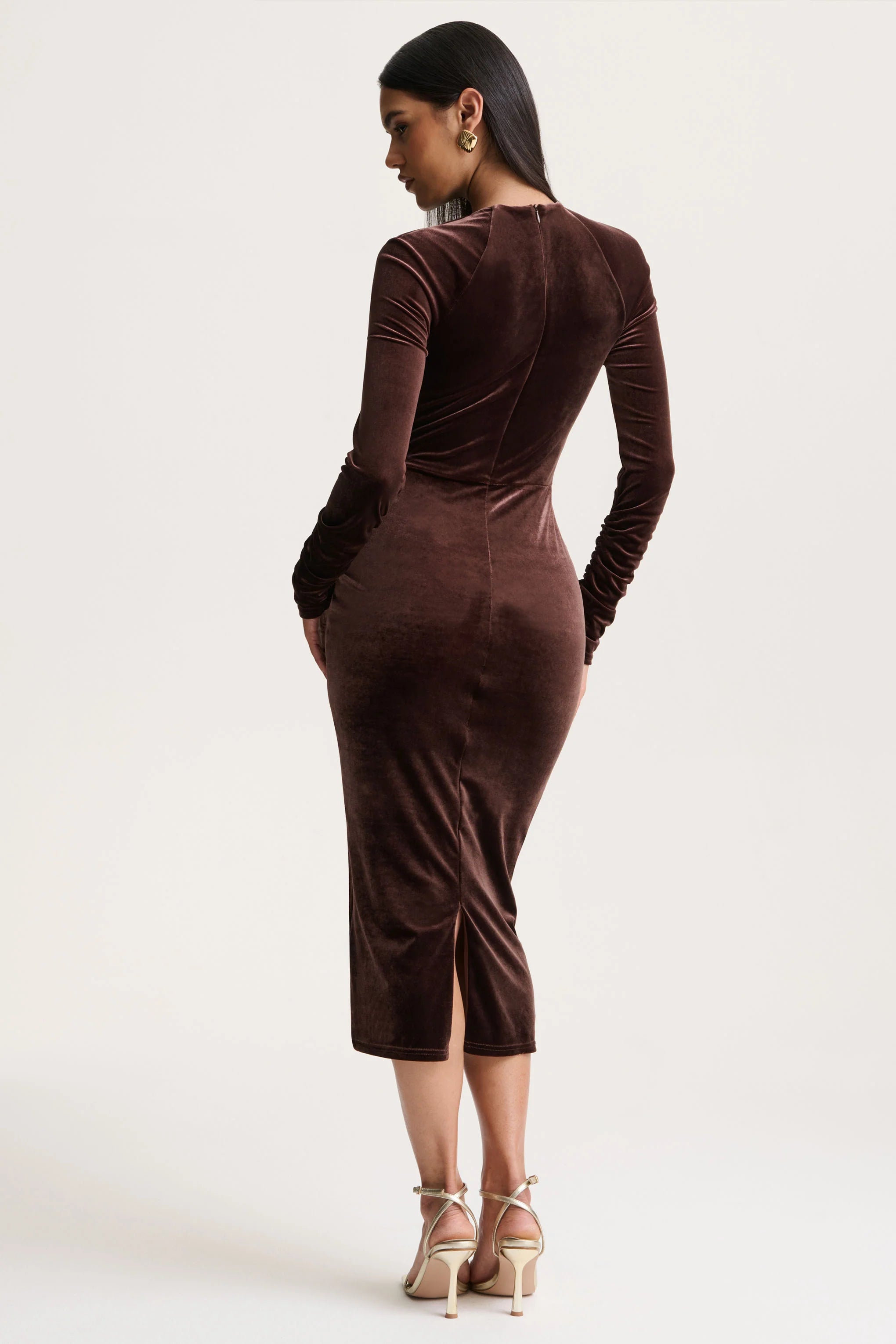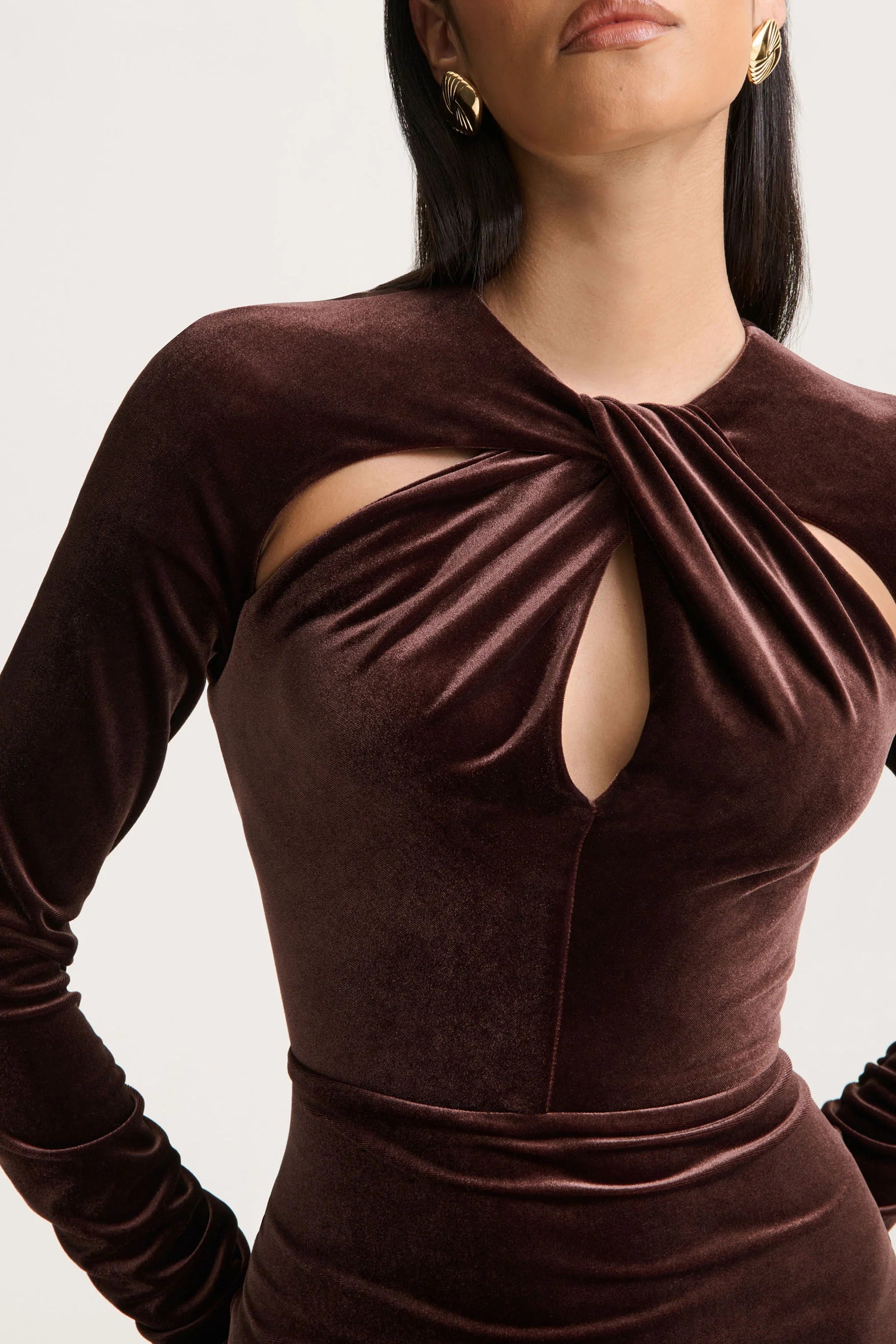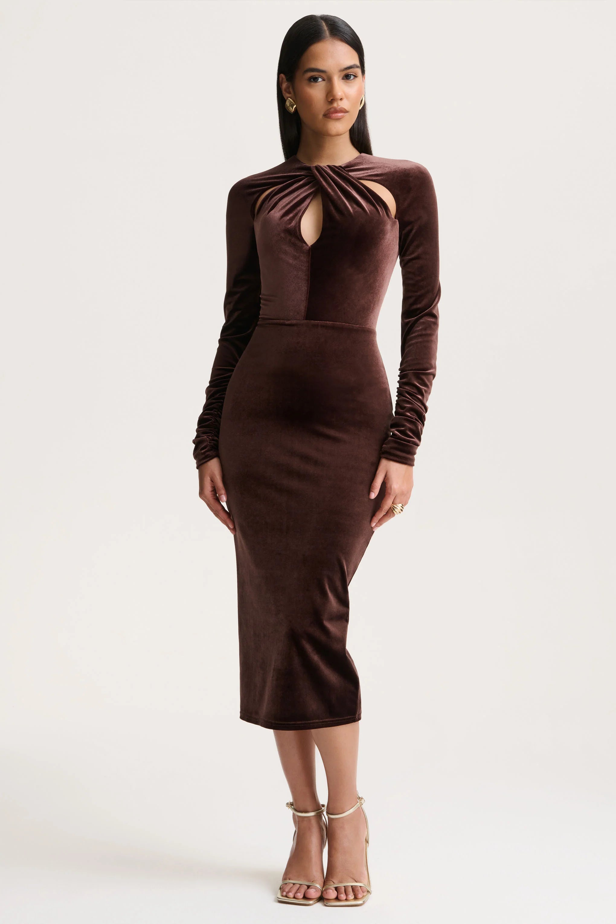 Francine is the definition of understated allure. Crafted from our premium velvet in a classic shade of brown, this midi-length design combines timeless sophistication with a contemporary edge. The round neckline offers a refined touch, while the chest cut-out details add a hint of drama. Elegant yet effortlessly striking, Francine is made for evenings that call for confidence and modern femininity.