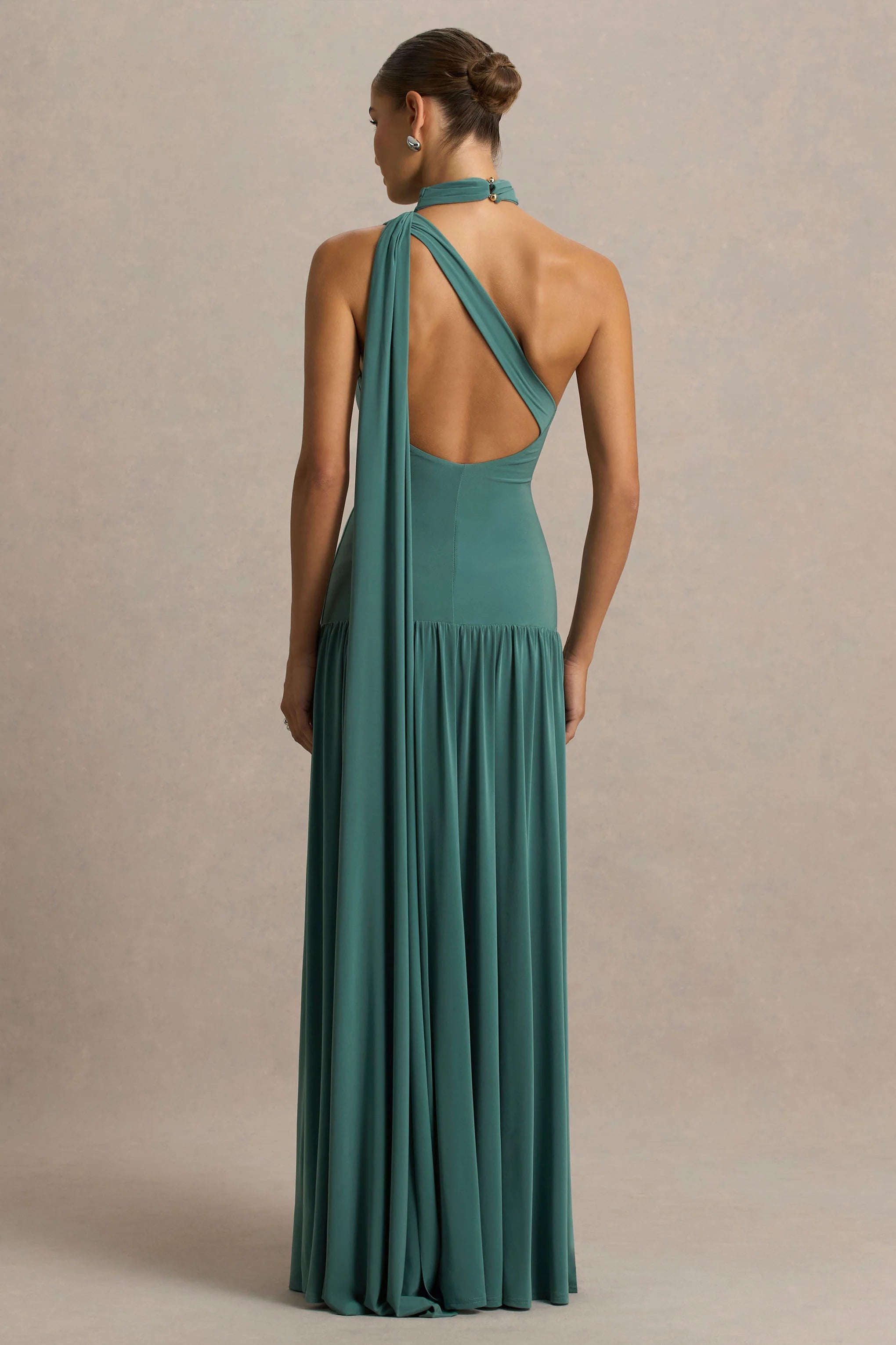 Turn heads with Freesia, a show-stopping design made for unforgettable entrances. Crafted from our signature premium stretch jersey, this teal-hued maxi clings in all the right places while offering a flawless, sculpted fit. The asymmetric neckline is elevated with a statement scarf detail that drapes effortlessly, while the adjustable strap allows for a custom fit. A drop waist adds a modern edge, flowing into a sleek, floor-sweeping silhouette. Finished with an open back for added allure, Freesia is your new go-to for evening elegance.