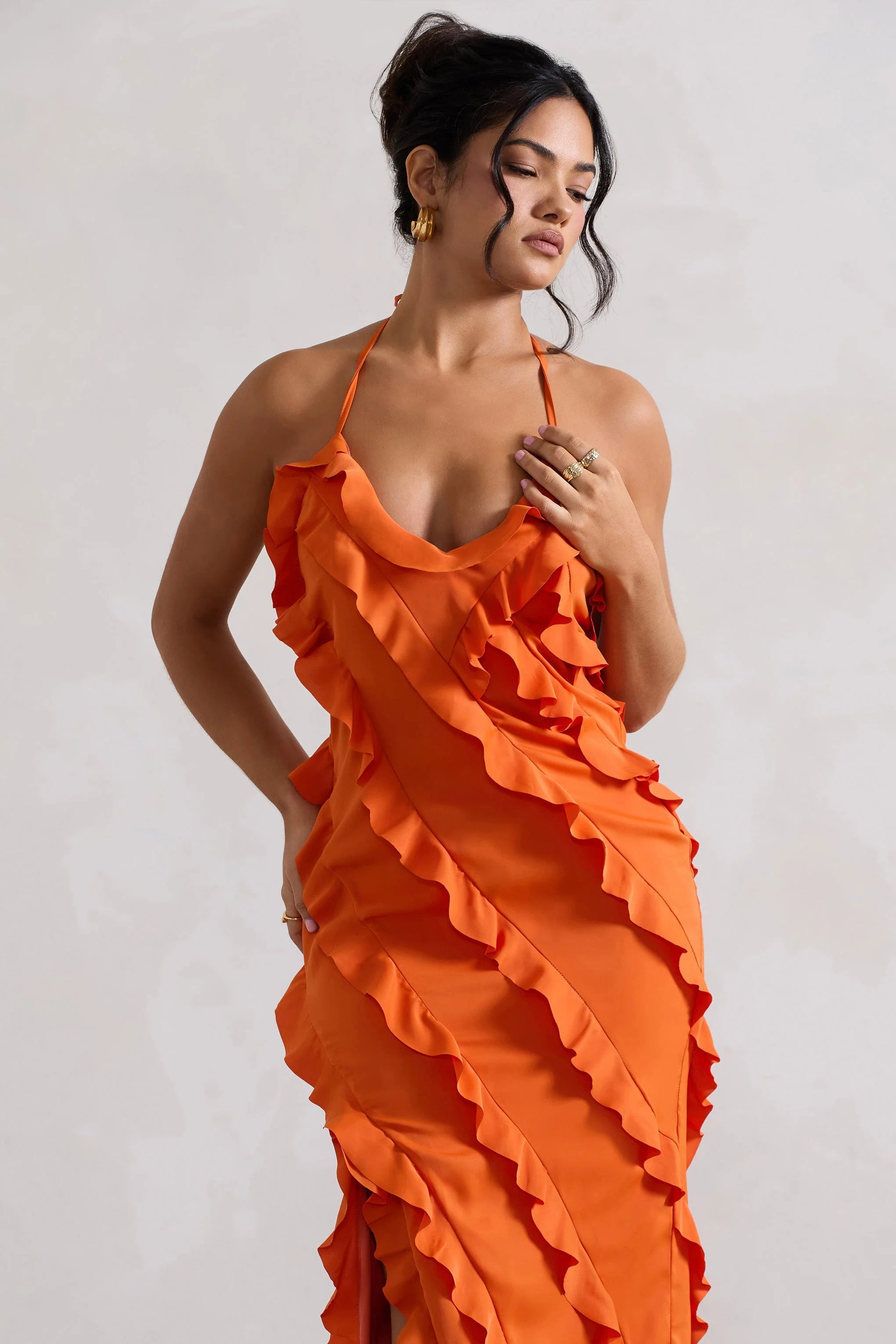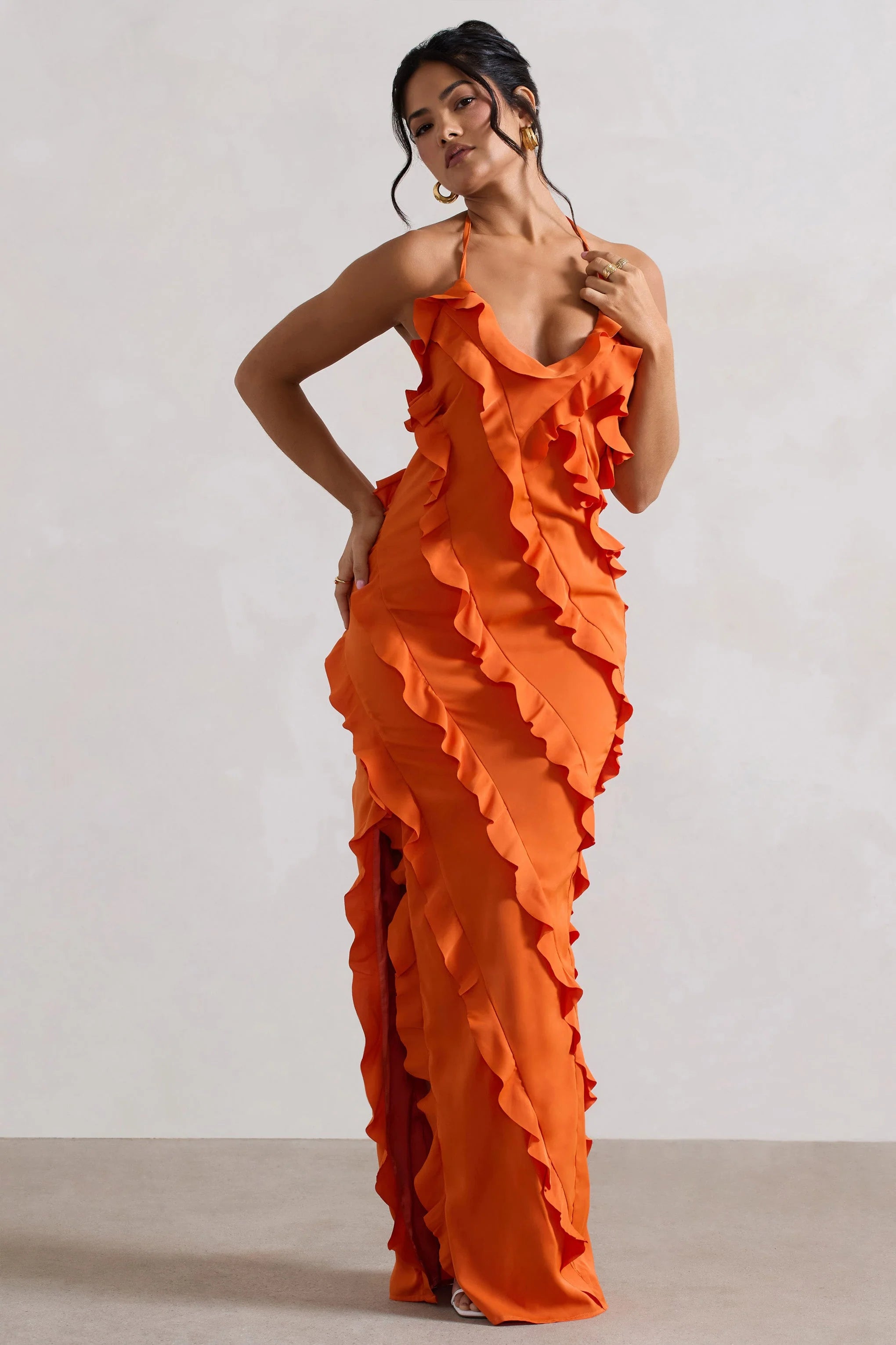 Immerse yourself in romantic ruffles this season in Full On, our alluring maxi. Designed for destination dressing, this piece arrives in a zesty tangerine shade boasting a subtle v neckline, self-tie halter straps and sultry high-leg split. Style yours with some shining gold accents for a head-turning dinner look.