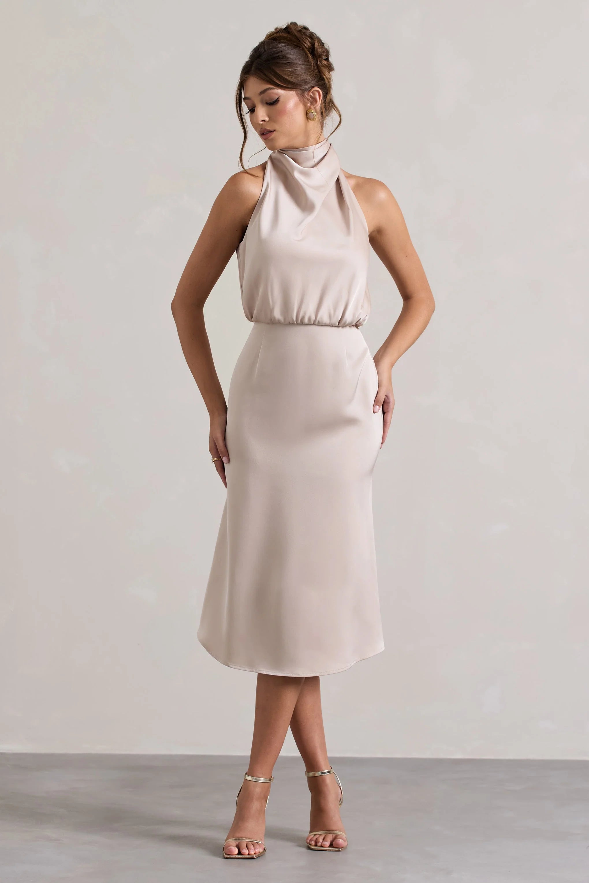 Whether you're attending a wedding reception or graduation ceremony, Geena was made for special moments. Crafted in a silky satin fabric in a rich champagne hue, this midi dress is defined by a draped high neckline and flattering tucked waist.