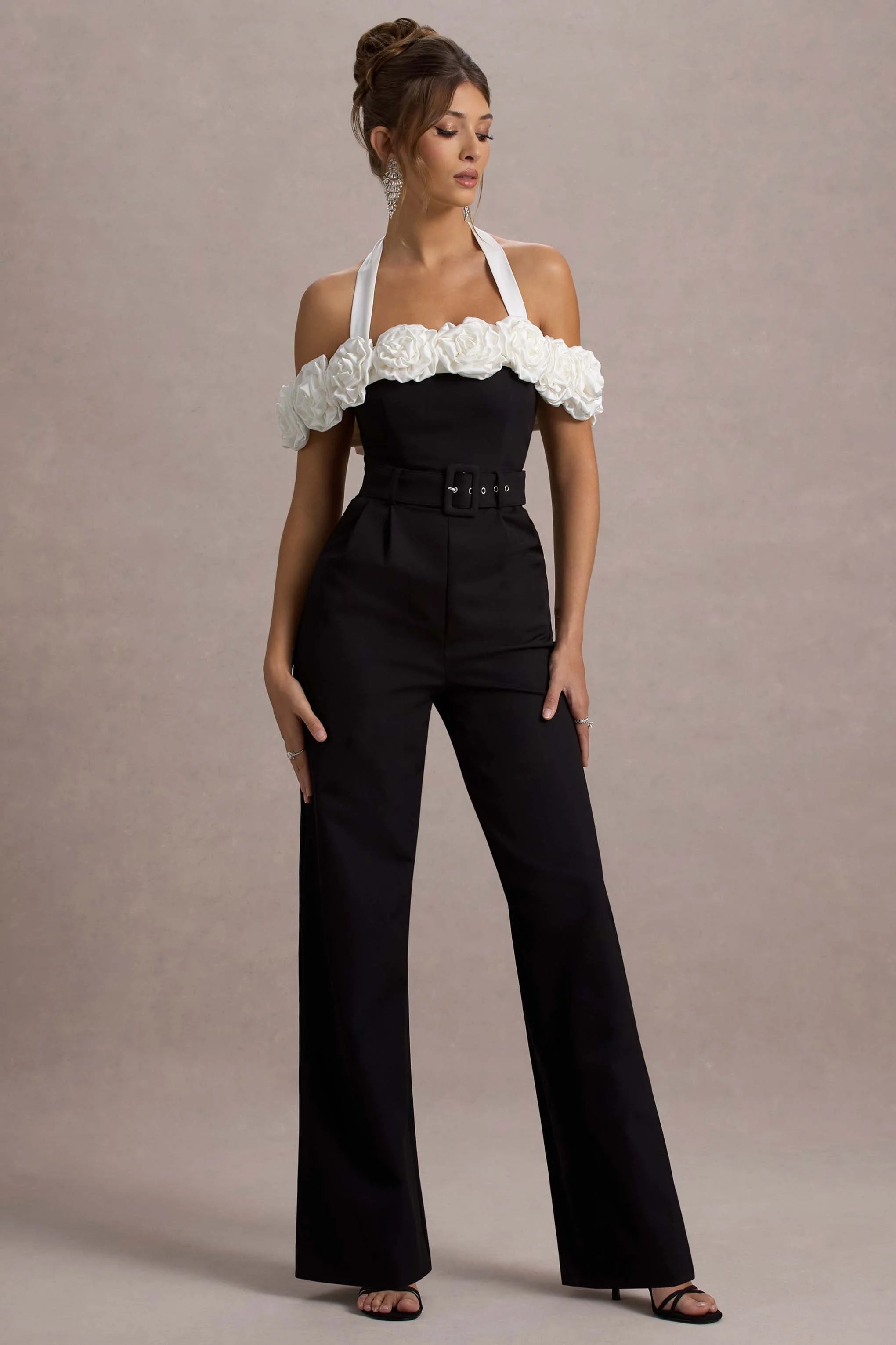 Genny is a striking option that effortlessly blends elegance with a contemporary edge. Crafted from our premium stretch crepe, this black tailored wide-leg jumpsuit is adorned with delicate floral details, adding a feminine touch to its sleek silhouette. The structured bodice and wide-leg design create a flattering, elongating effect, making Genny a standout choice for any special occasion.