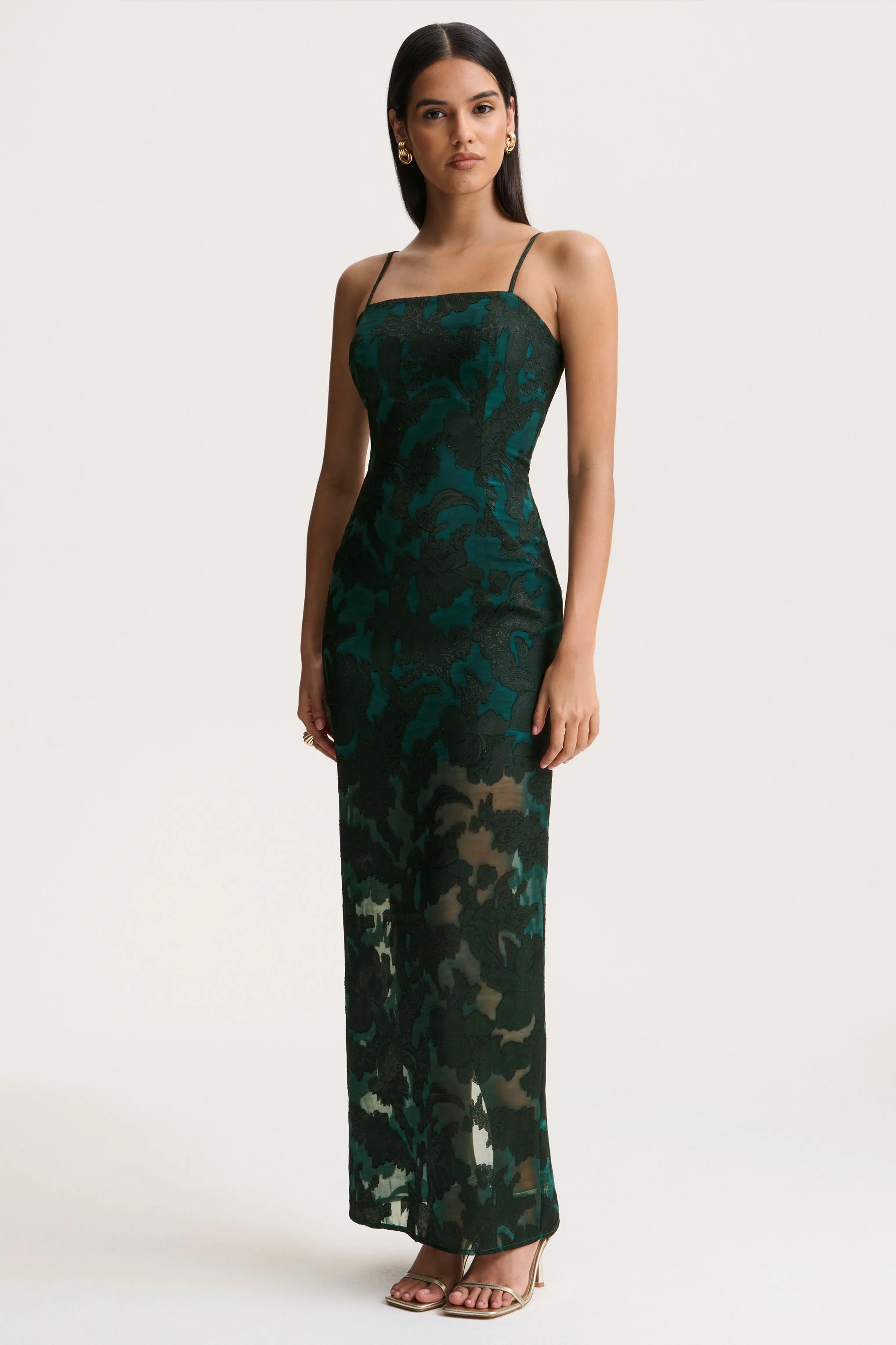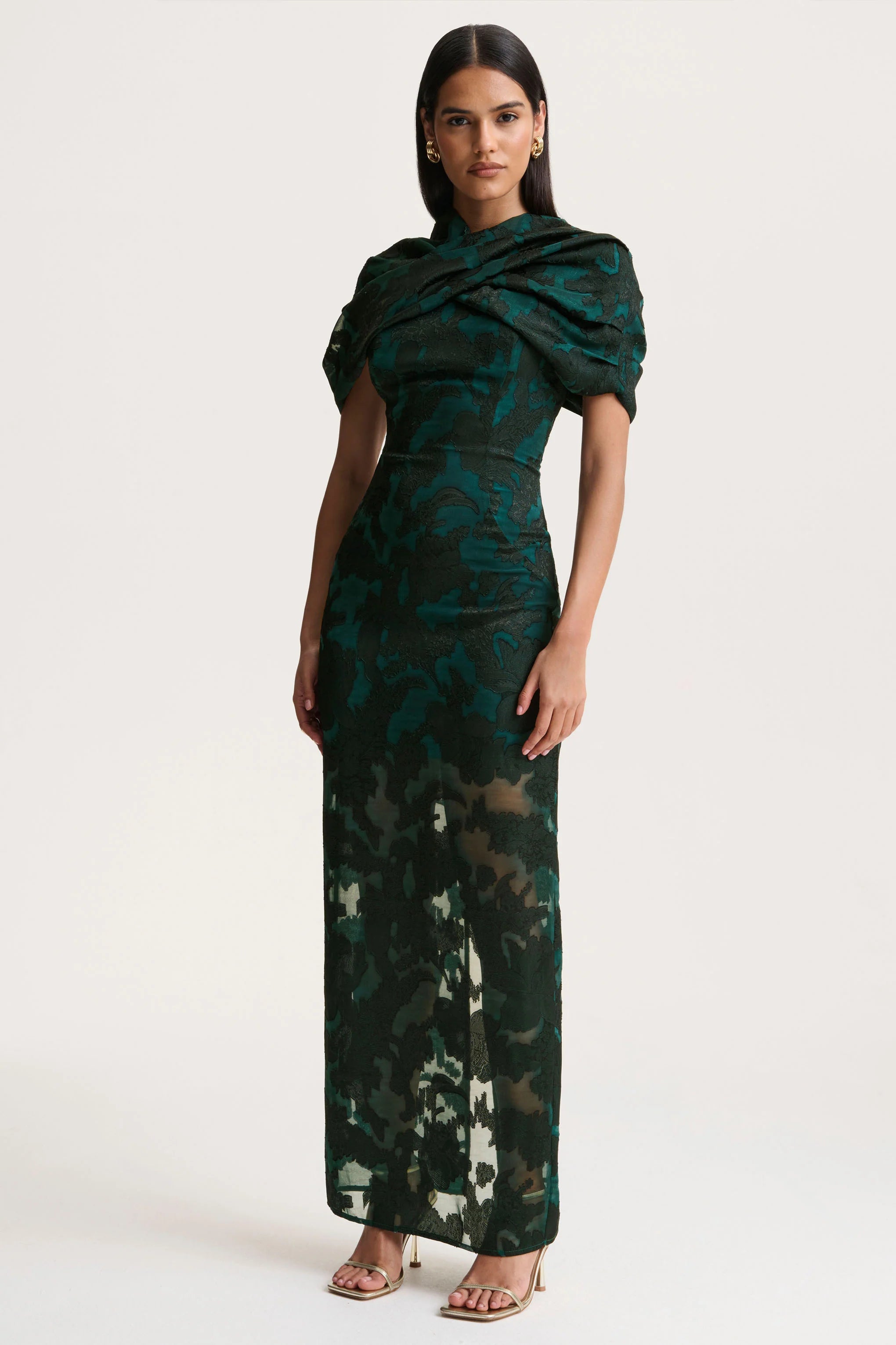 Dramatic and distinctive, Hada is designed for moments that demand attention. Crafted from our pemium satin devore in a deep shade of dark green, this maxi dress will turn heads at any occasion. Featuring a sophisticated high neckline balanced by a twisted cape overlay for maximum impact. The sheer skirt and centre-back split add a sultry edge to the silhouette, making Hada the perfect blend of elegance and allure.