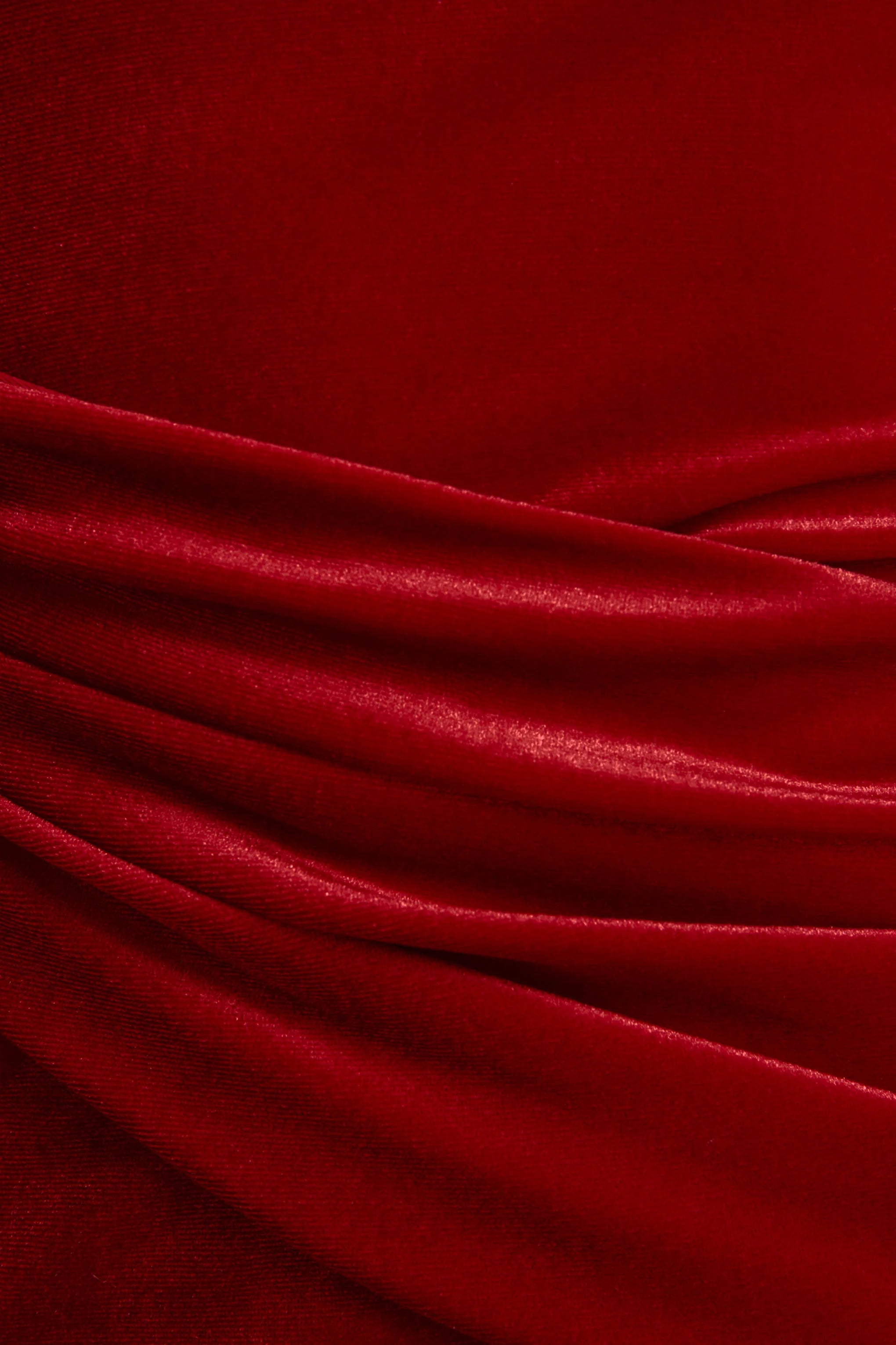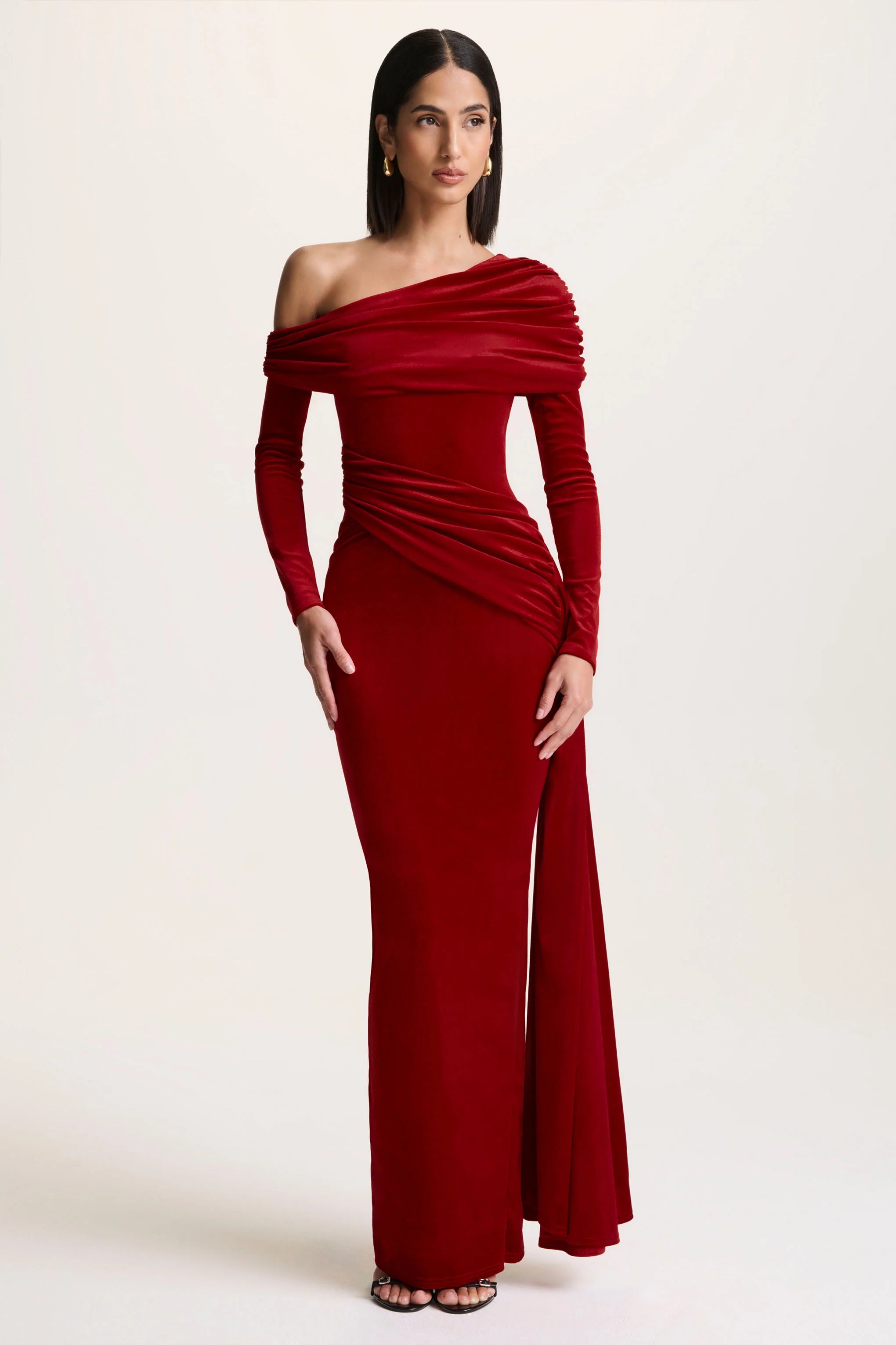 Hadria exudes bold sophistication with a sculpted, feminine silhouette. Crafted from our premium red velvet, this maxi-length design drapes luxuriously while highlighting the body with effortless elegance. The asymmetric neckline creates a striking, contemporary finish, complemented by ruched detailing and a sash that enhances every curve. Finished with a centre-back split for graceful movement, Hadria is made for occasions that demand confidence, glamour, and unforgettable style.