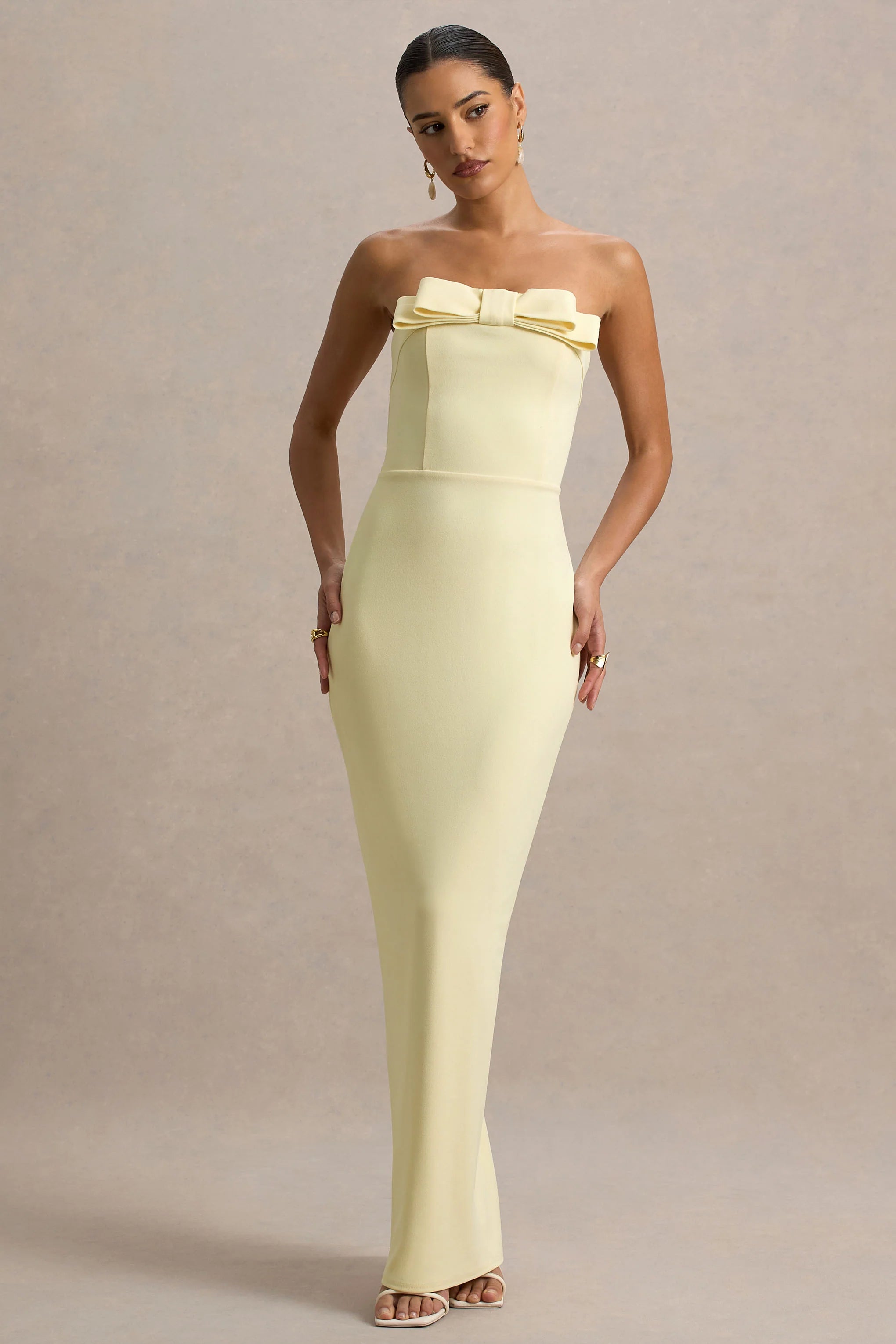 Hallie is the epitome of elegance. This maxi arrives cut in our premium jersey in an exquisite lemon hue. Adorned with a flattering bandeau neckline and feminine bow, this piece is perfect for your next big event. Pair with simple and chic accents to keep Hallie at the forefront.
